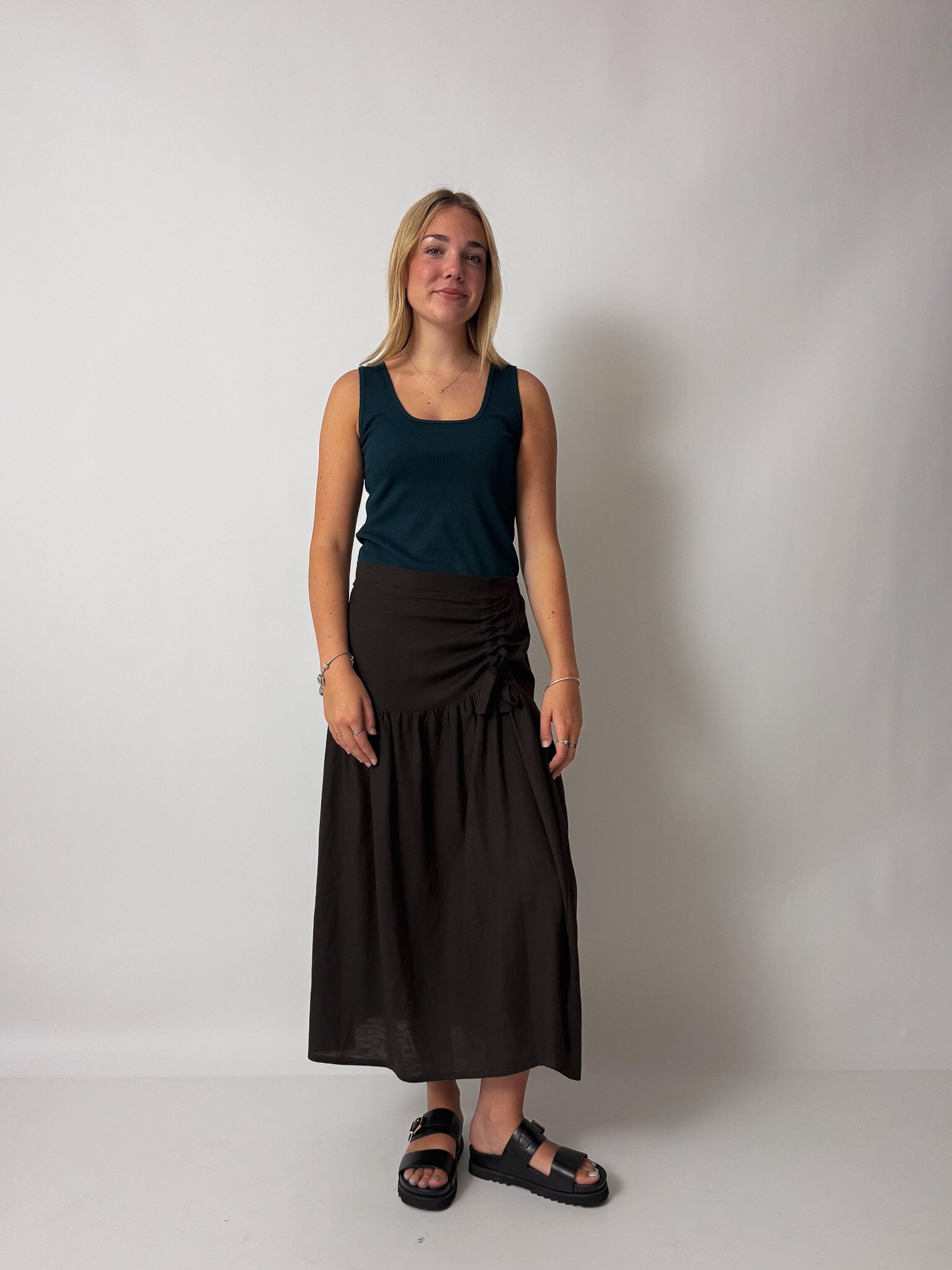 Our Ada Top is a reversible ribbed singlet with a square neck and round neck and binding on armholes and neck.