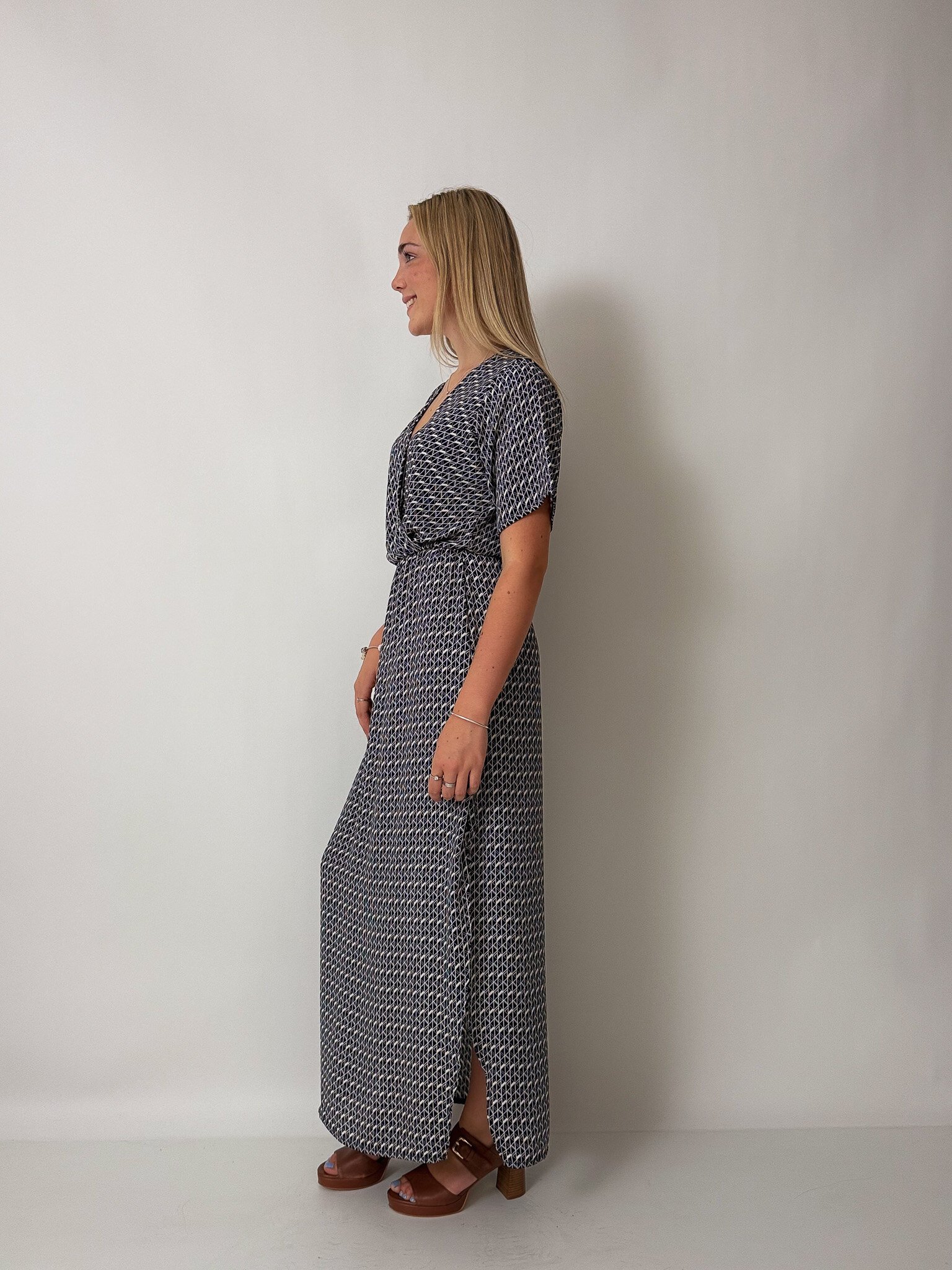 This reversible maxi dress features a cross-over front, t-shirt sleeves, side splits and an elasticated waist.