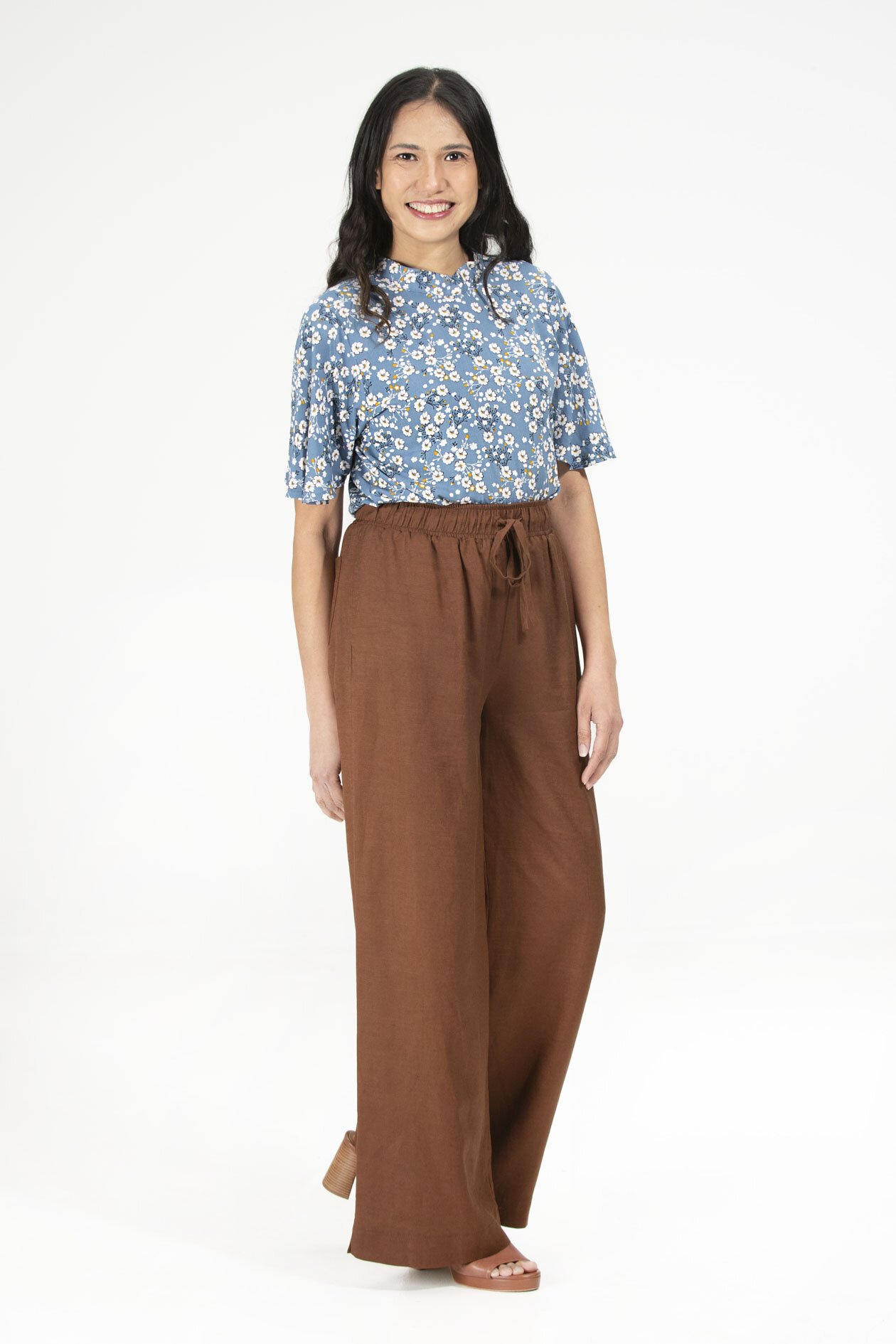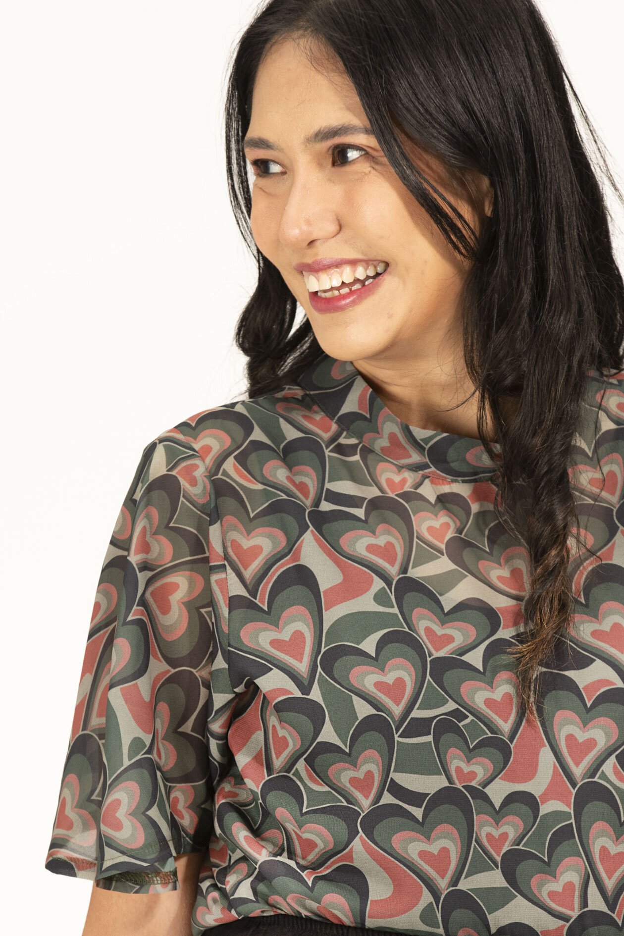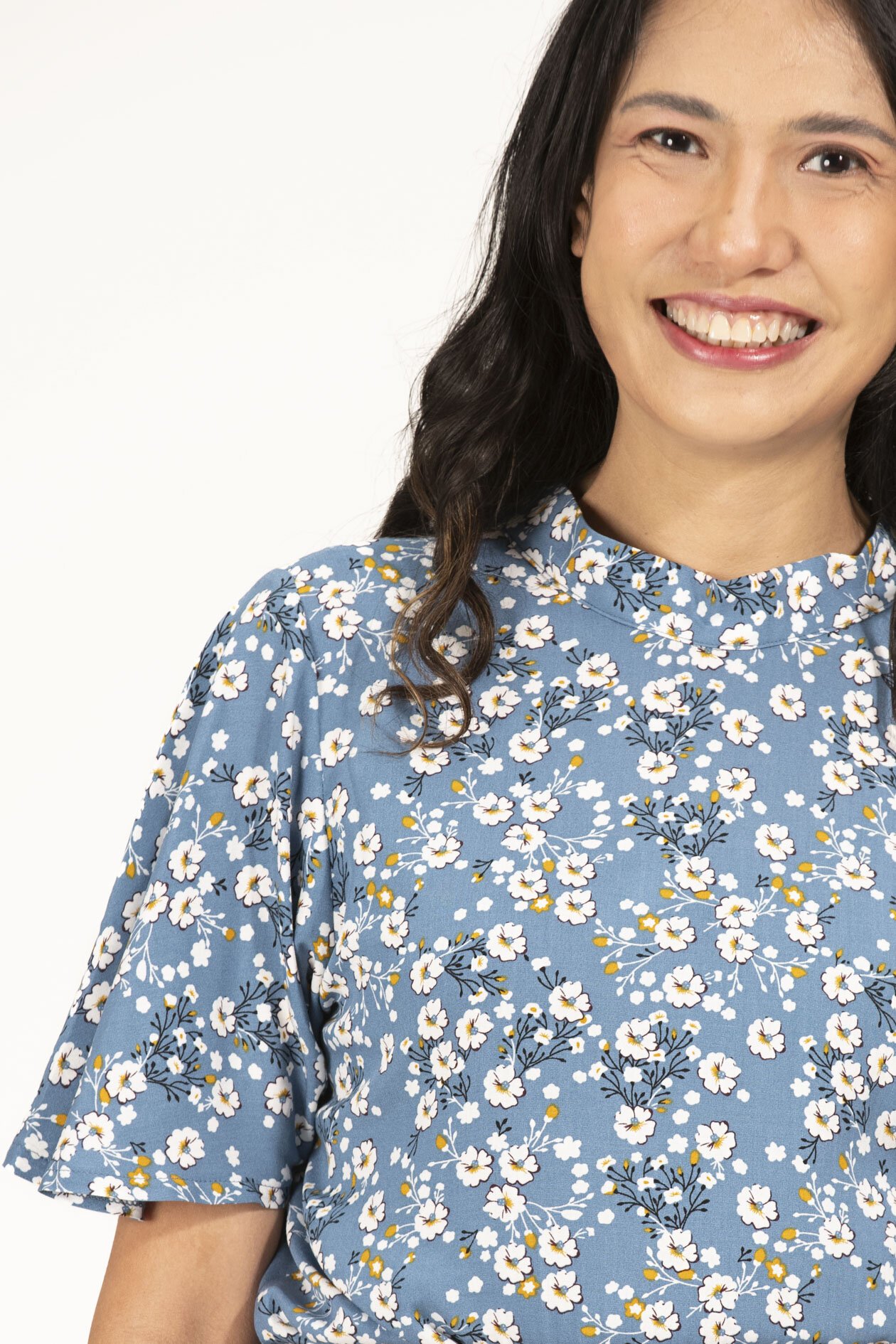 Amelia is a short sleeve reversible top with a neck tie gathered neckline and keyhole.