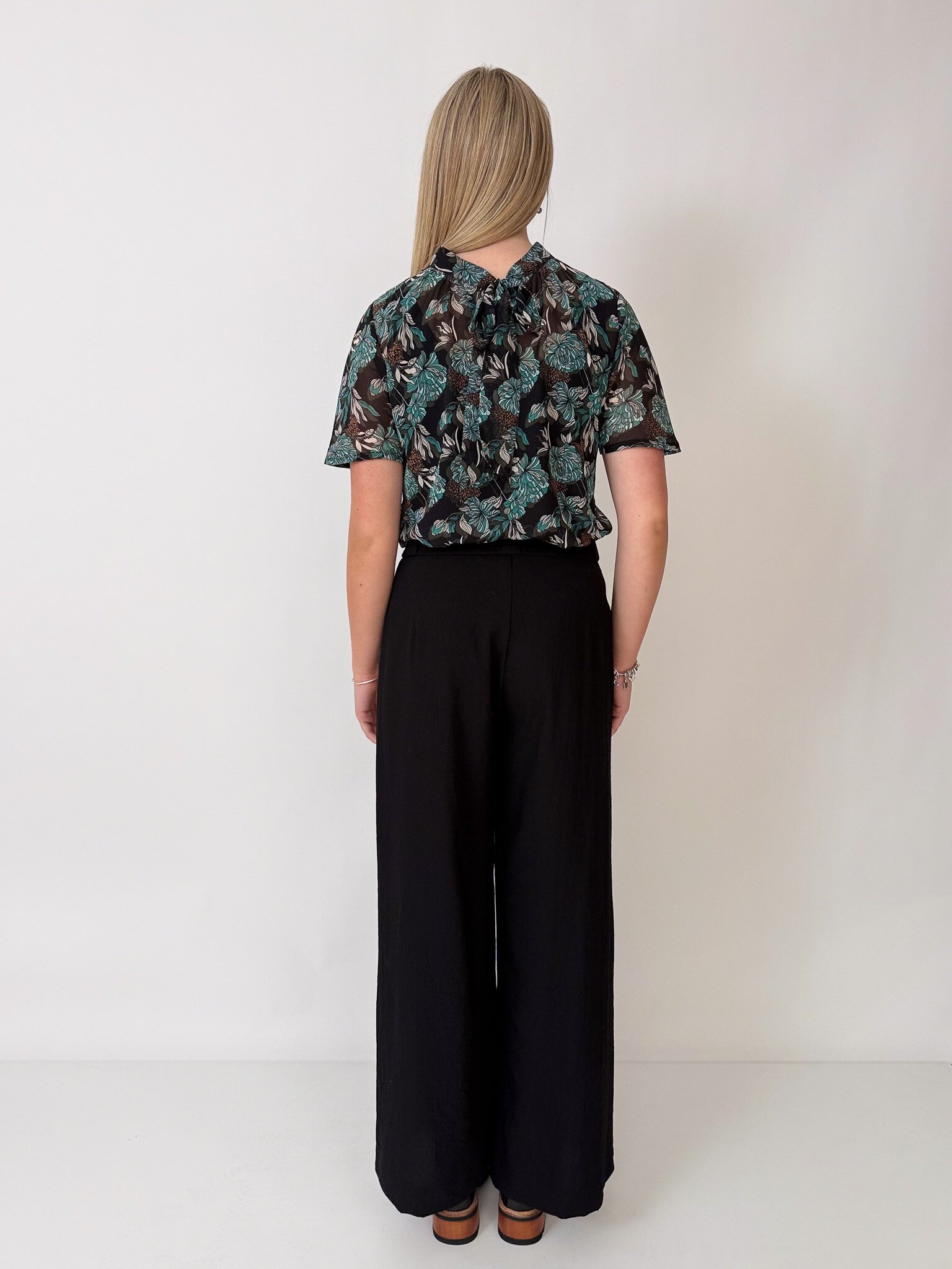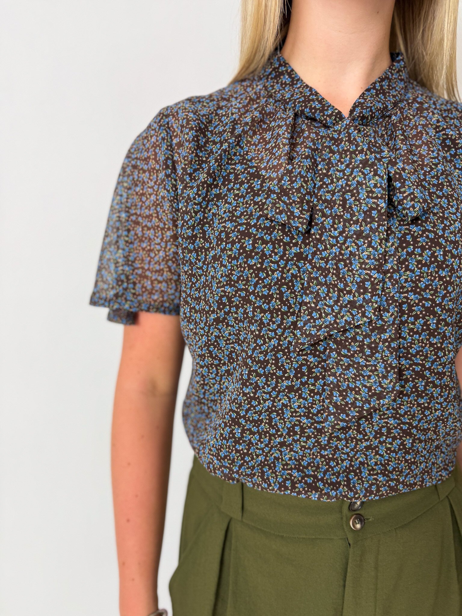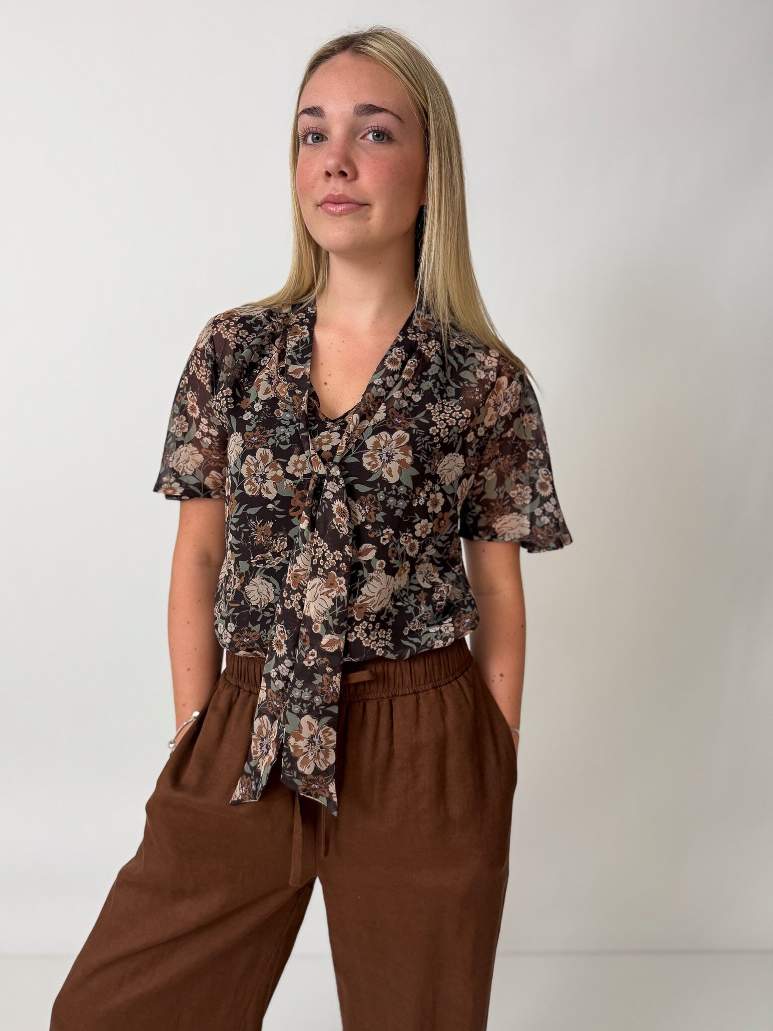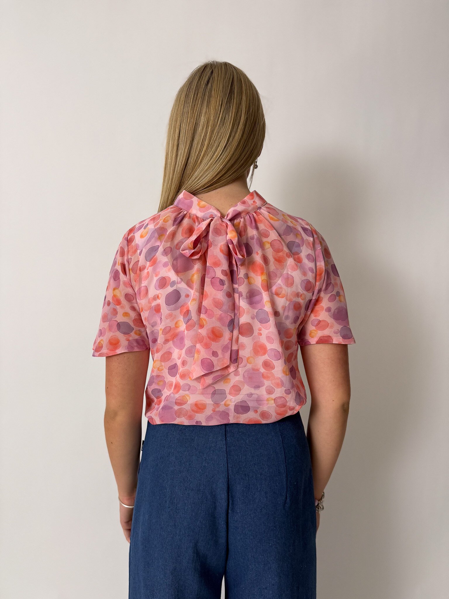 Amelia is a short sleeve reversible top with a neck tie gathered neckline and keyhole.