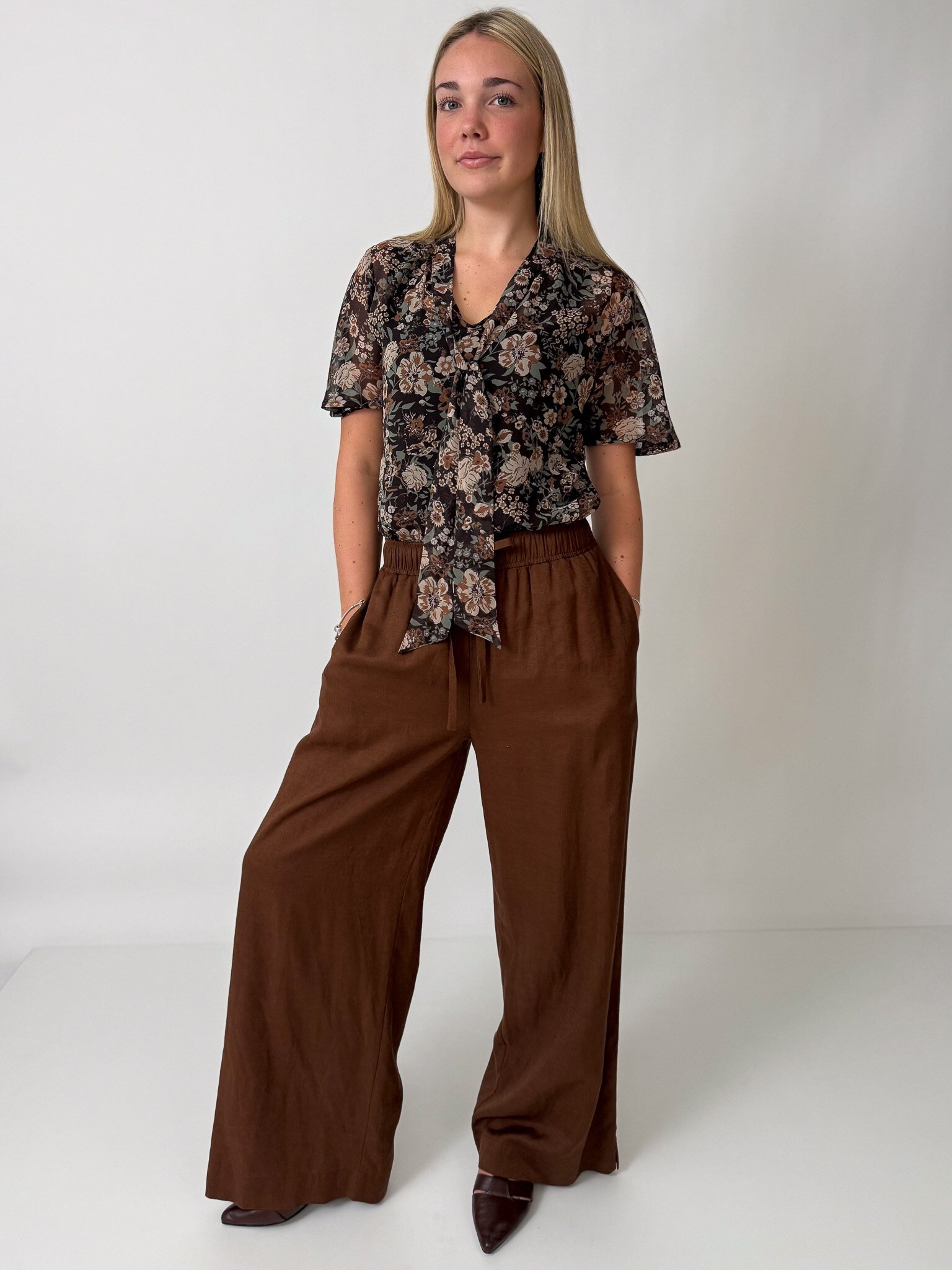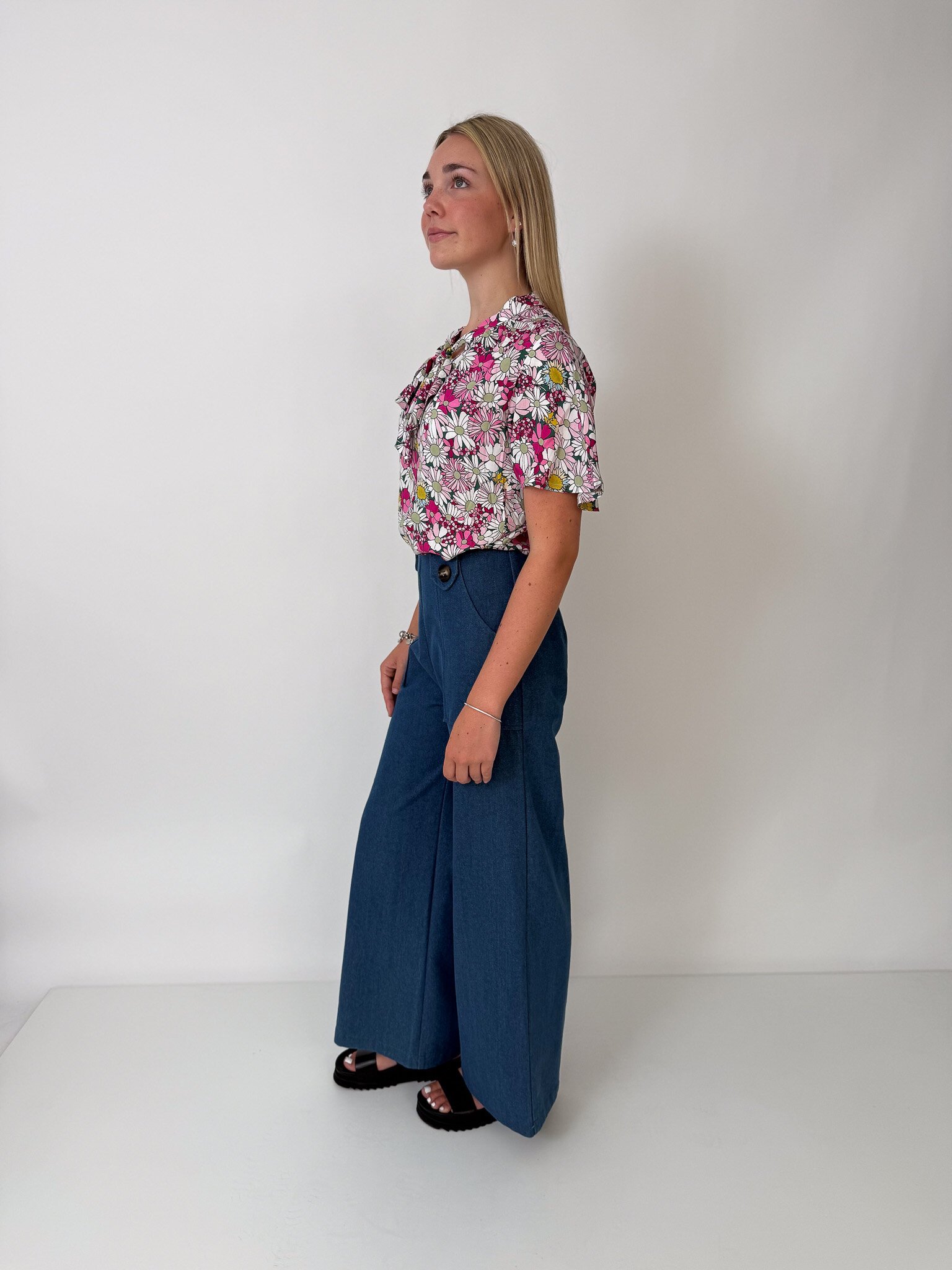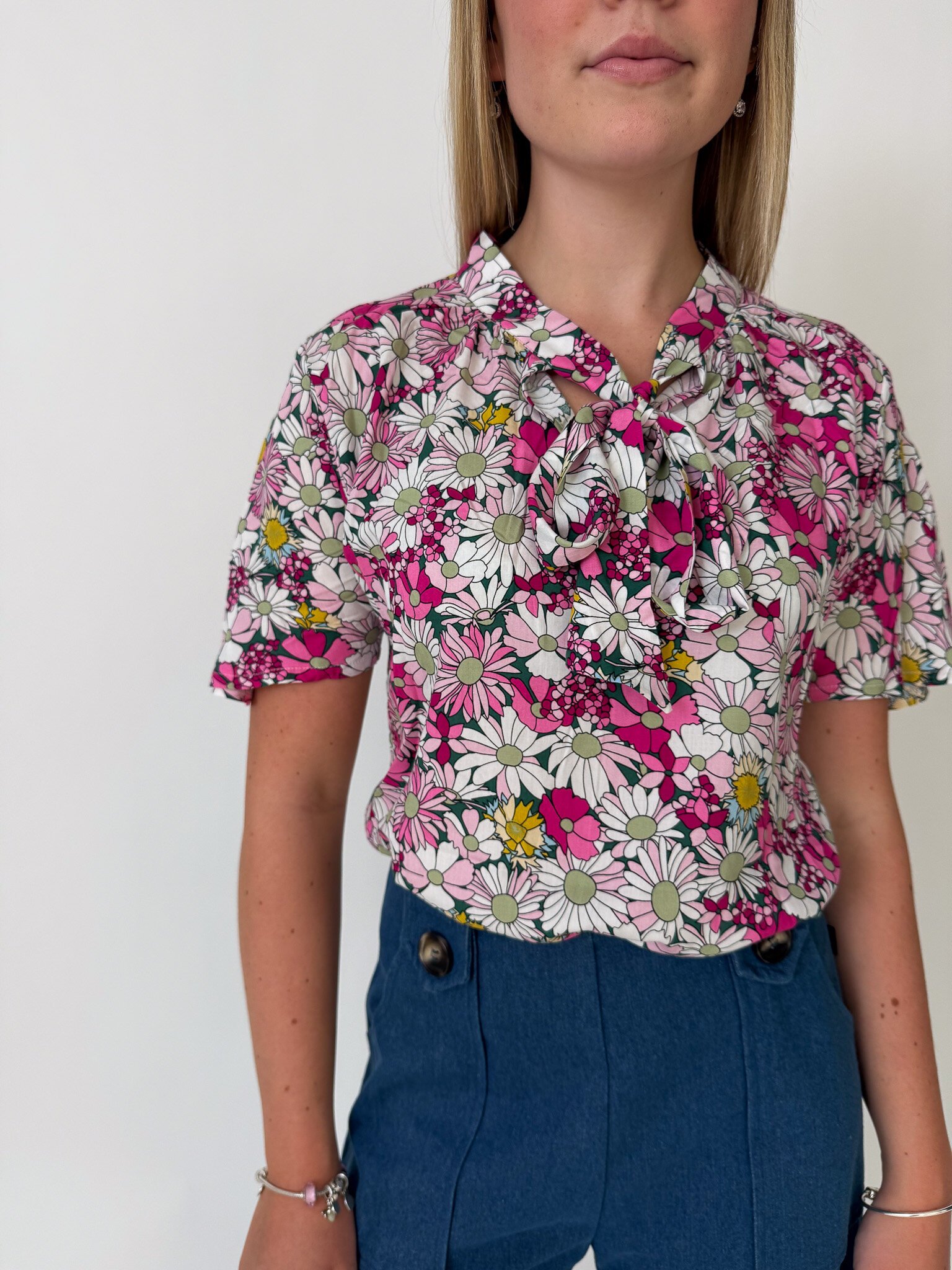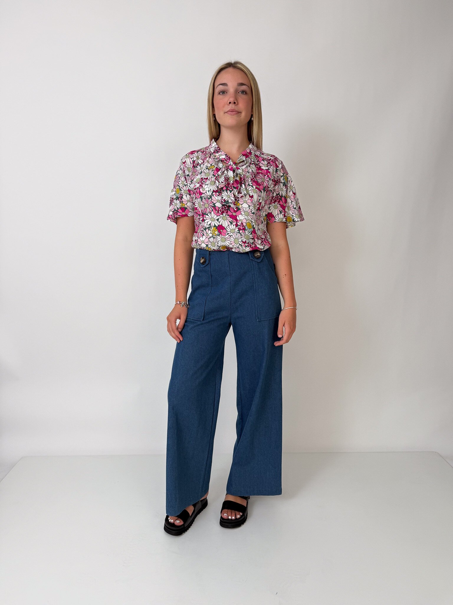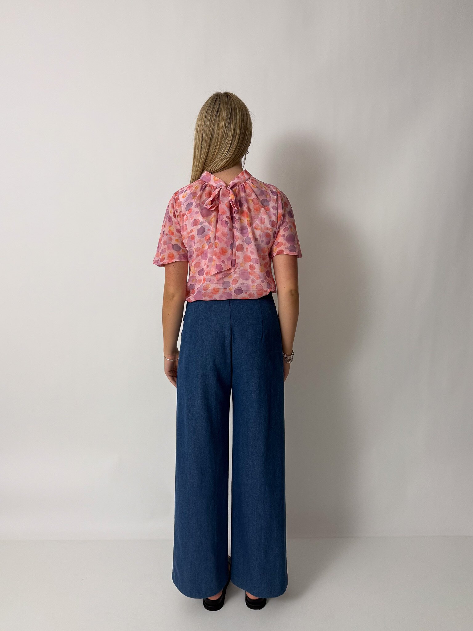 Amelia is a short sleeve reversible top with a neck tie gathered neckline and keyhole.