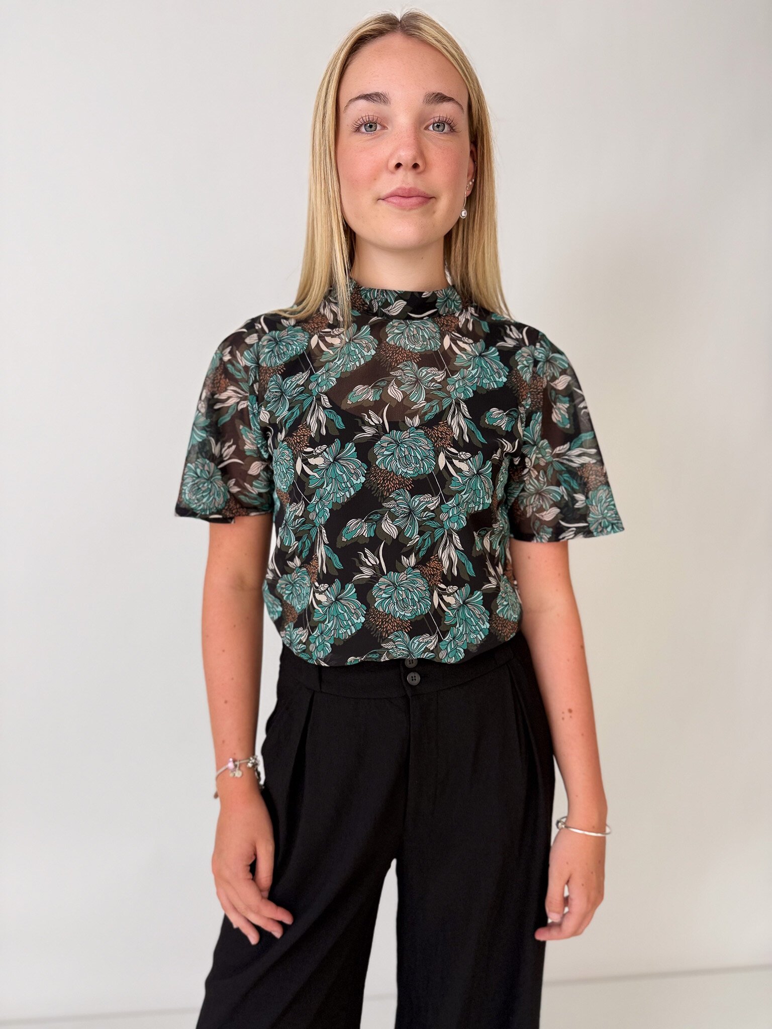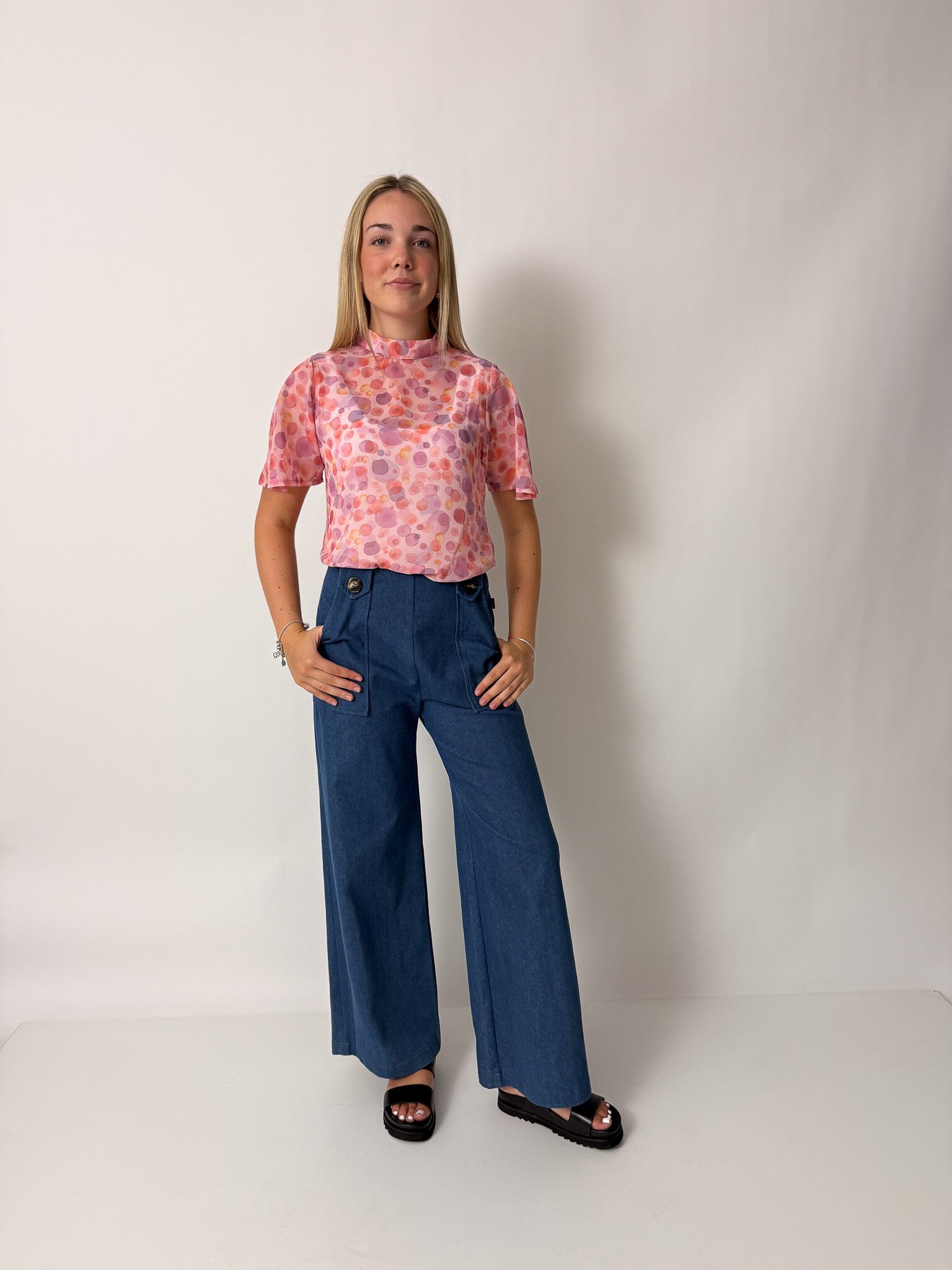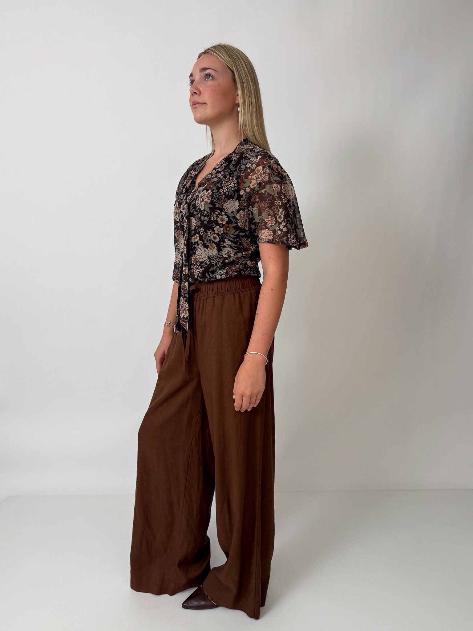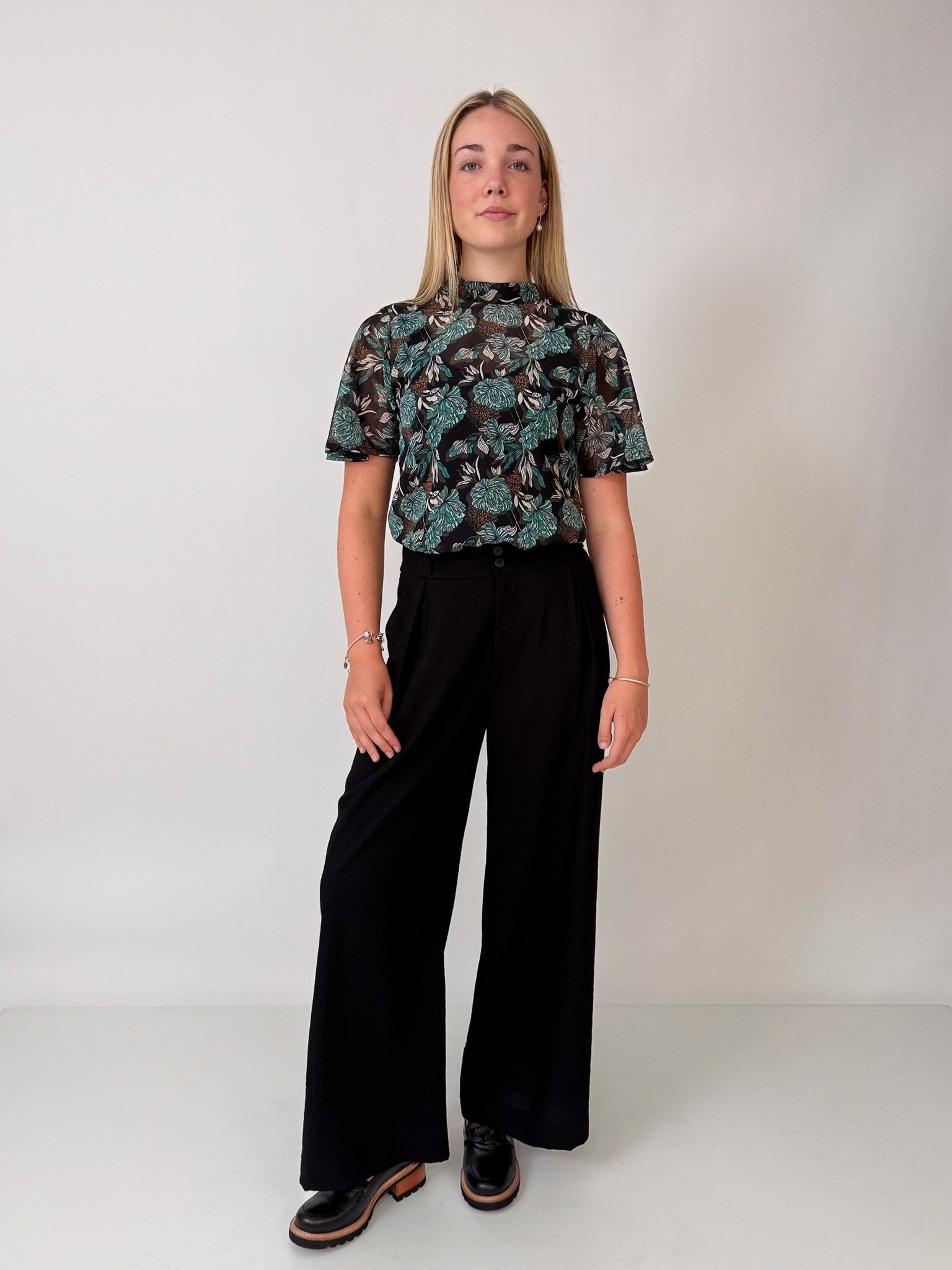 Amelia is a short sleeve reversible top with a neck tie gathered neckline and keyhole.