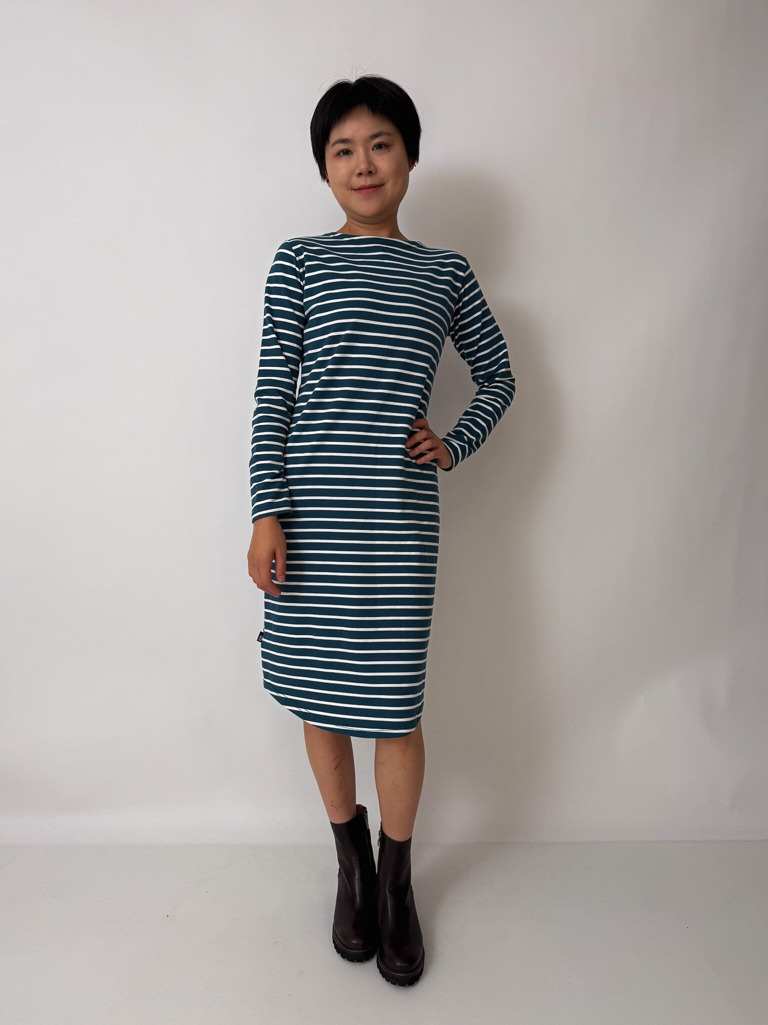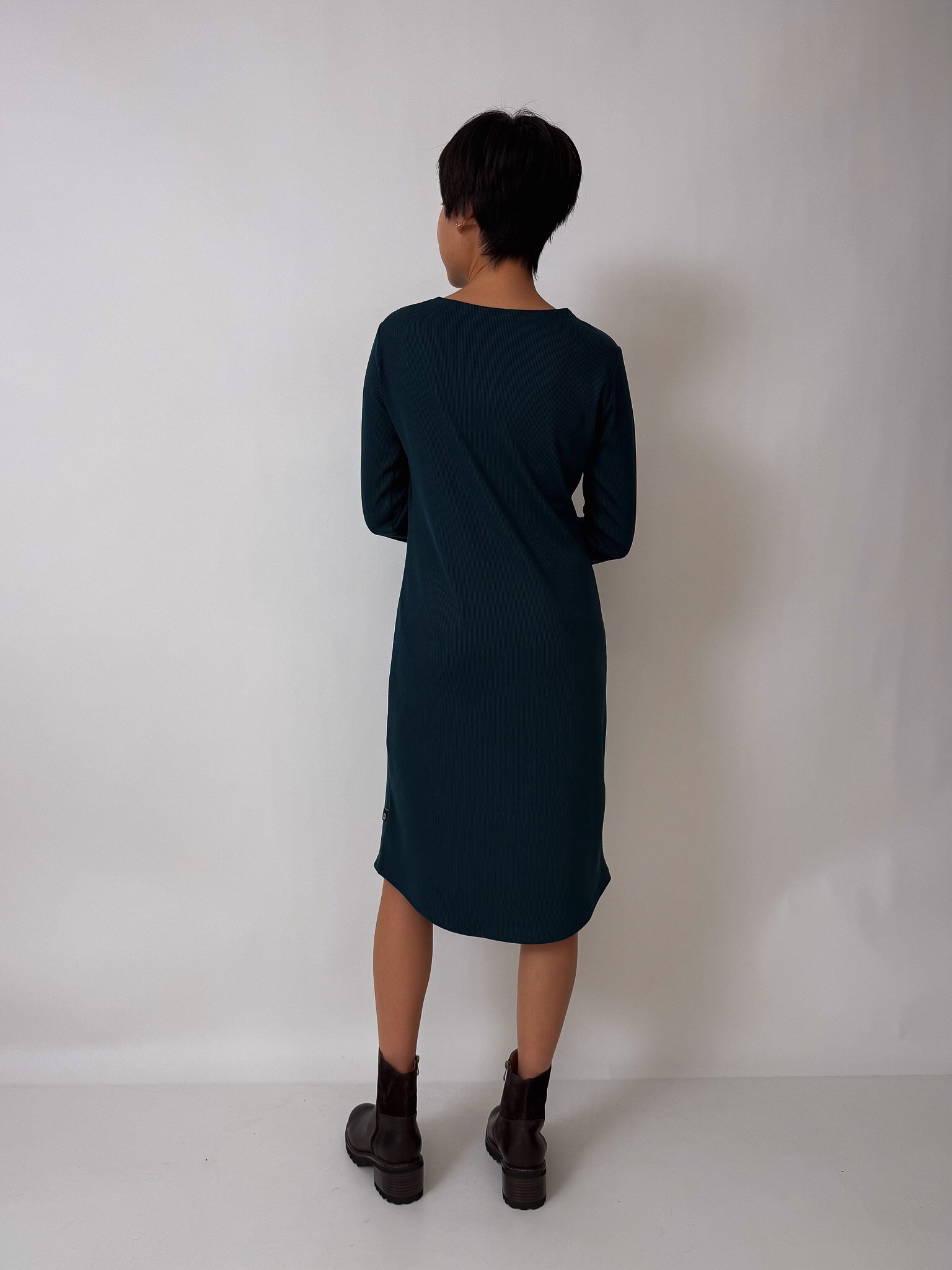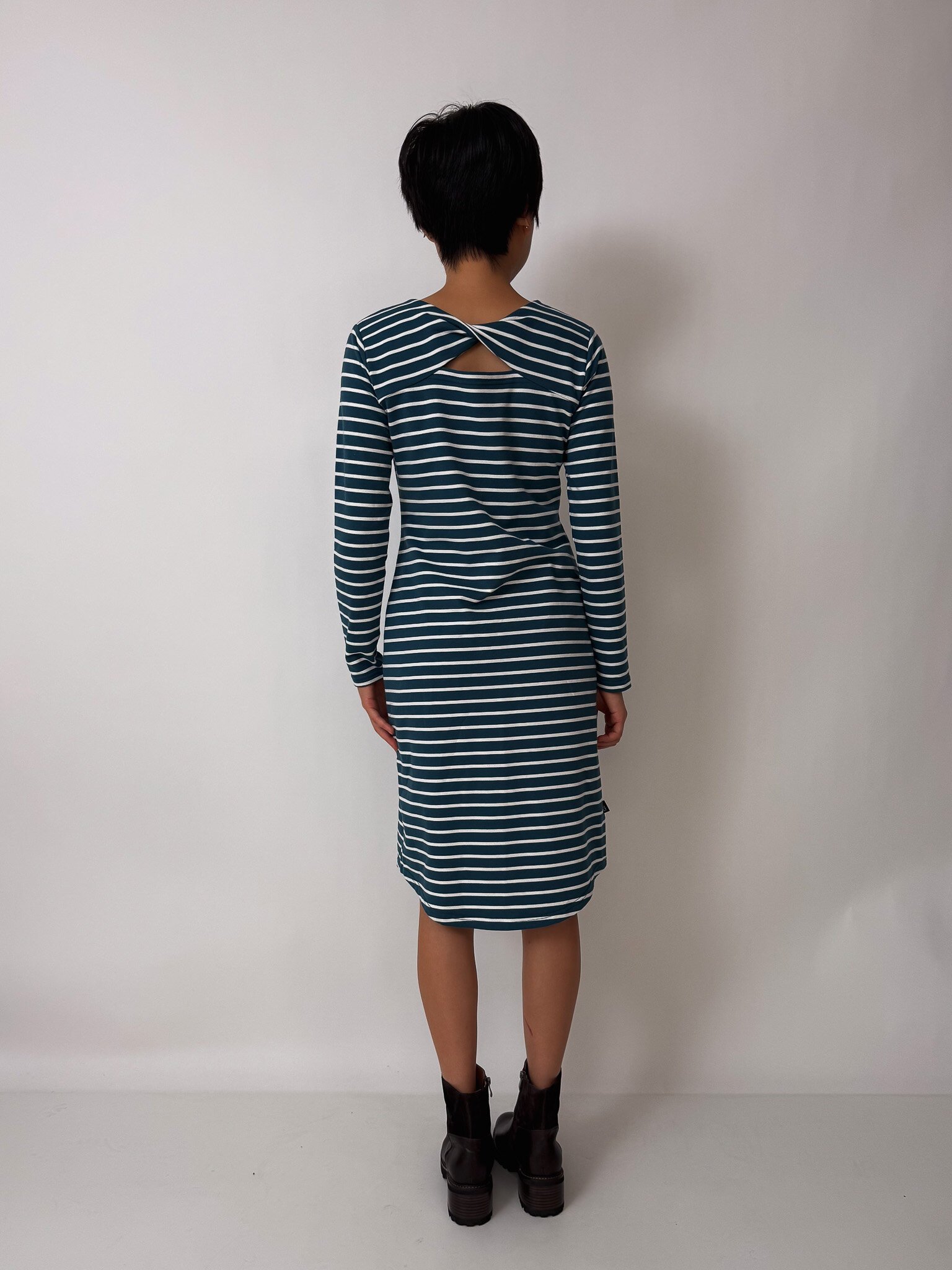 Our Anahera Dress is a knit dress with a front twist keyhole detail, long sleeves and a curved hem.