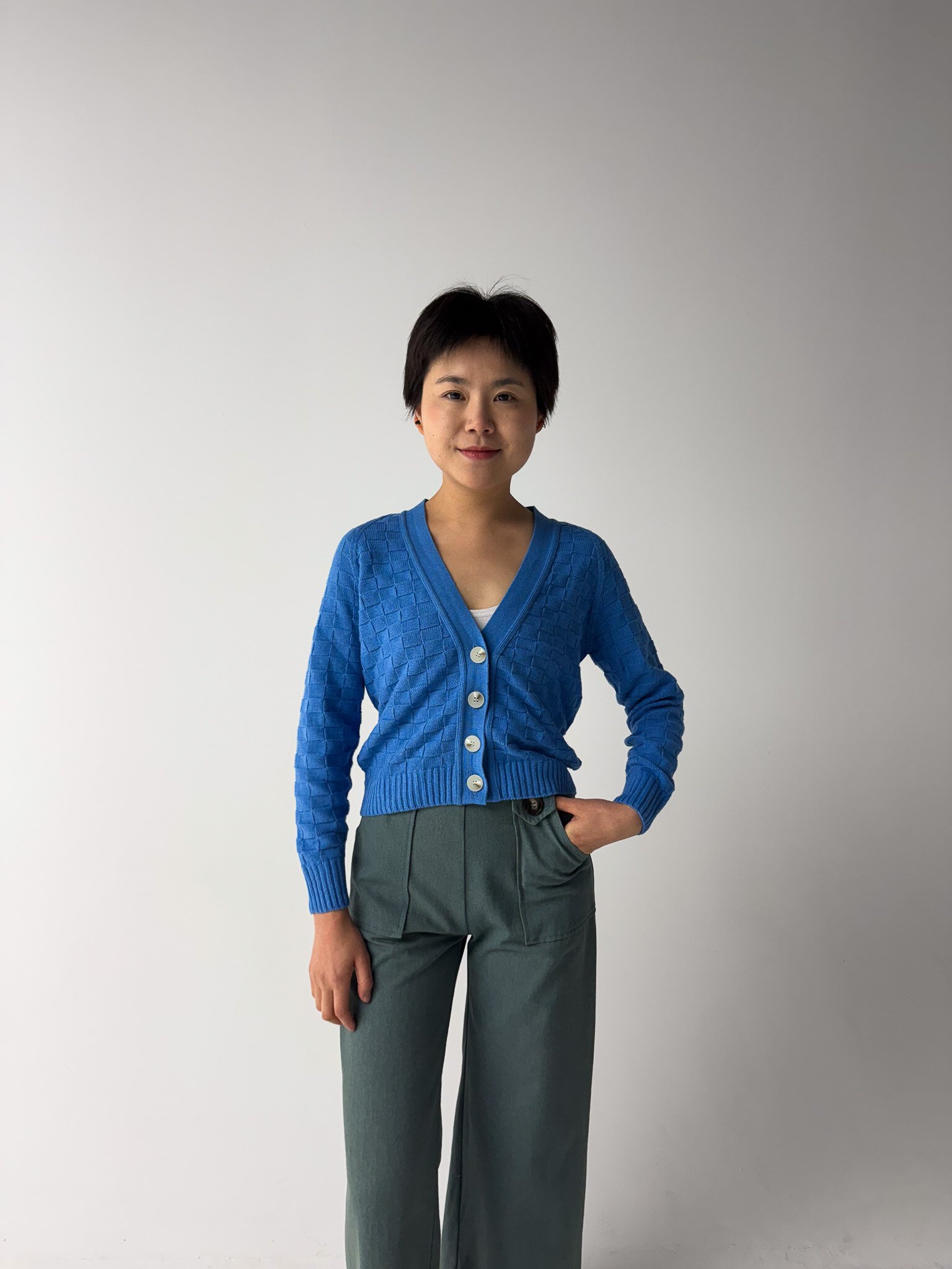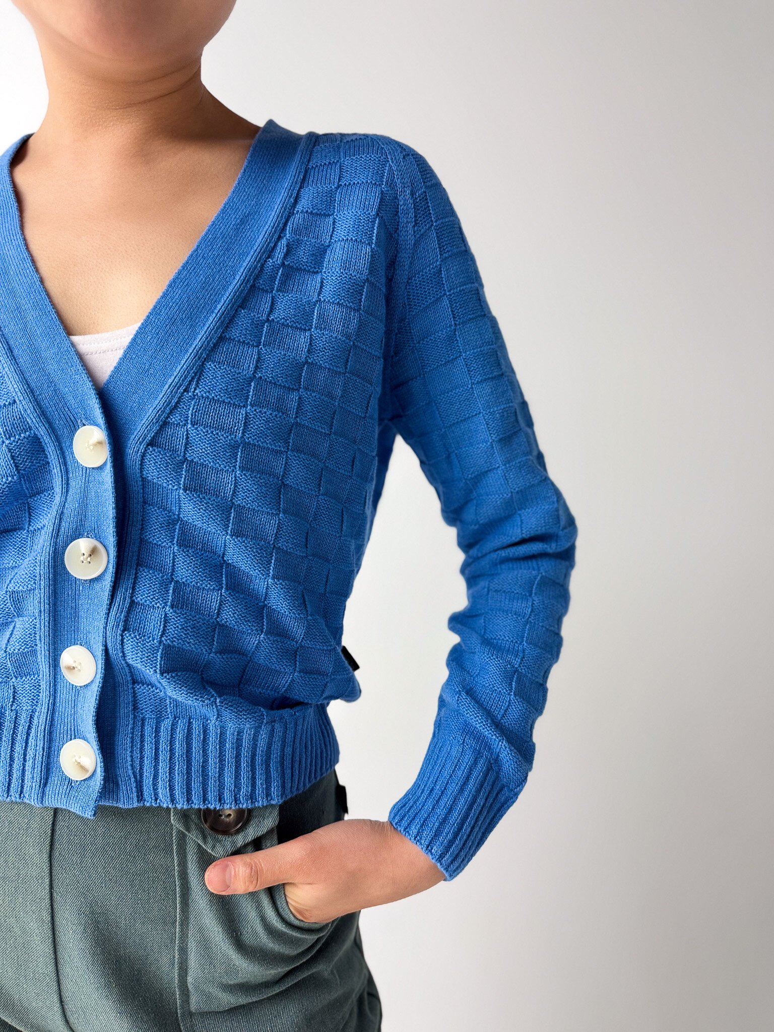 This Cardi is made from 100% cotton and is a textured check knit. Ava is a button-up, waist length cardi.