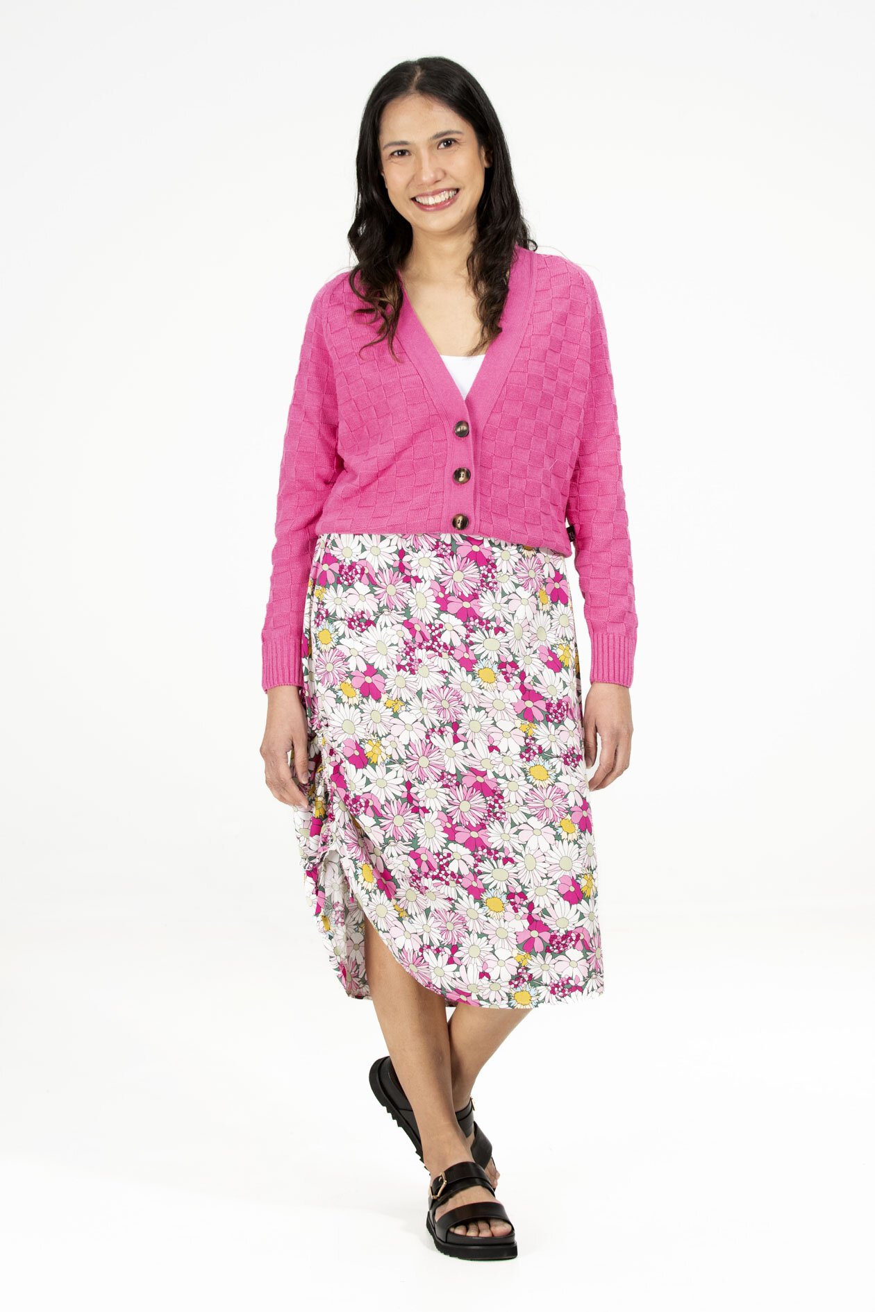 This Cardi is made from 100% cotton and is a textured check knit. Ava is a button-up, waist length cardi.