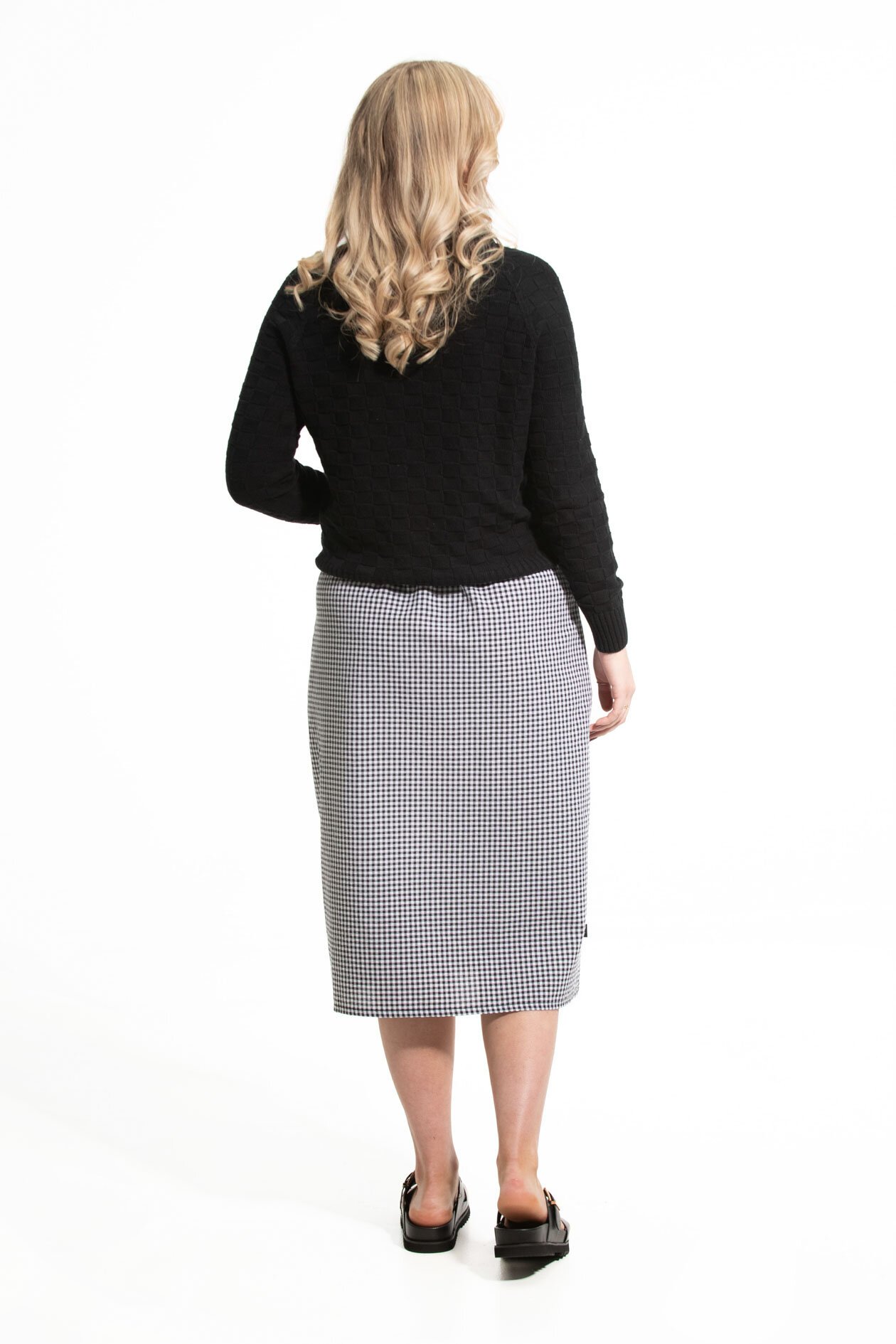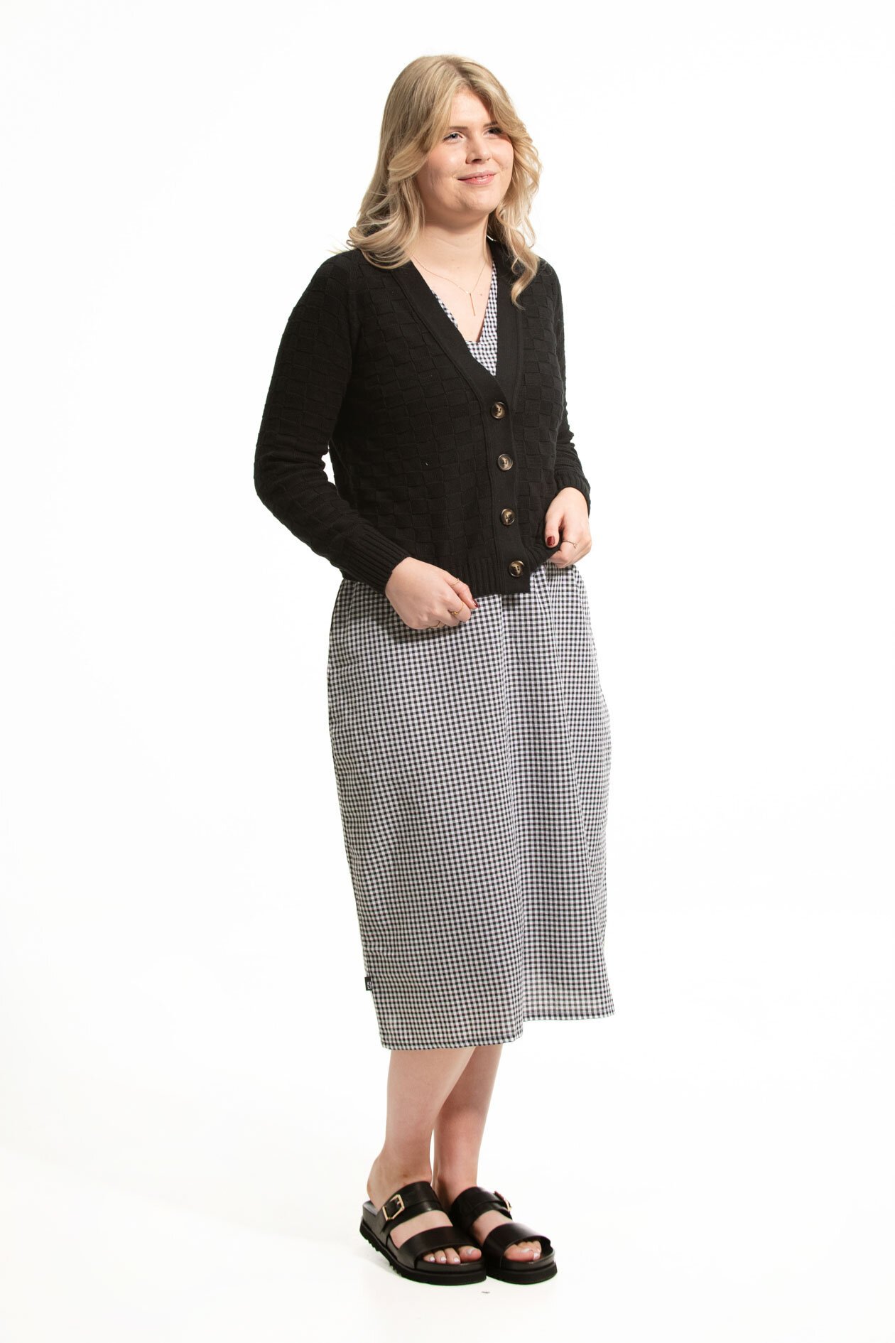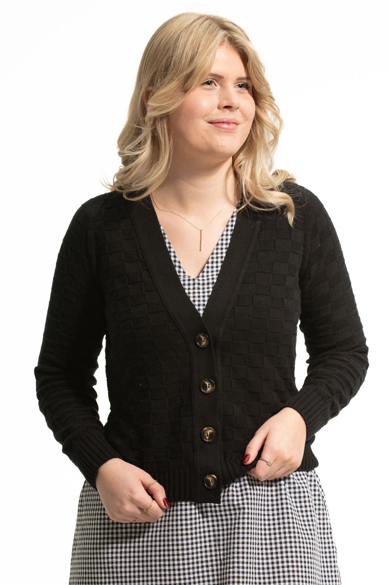 This Cardi is made from 100% cotton and is a textured check knit. Ava is a button-up, waist length cardi.