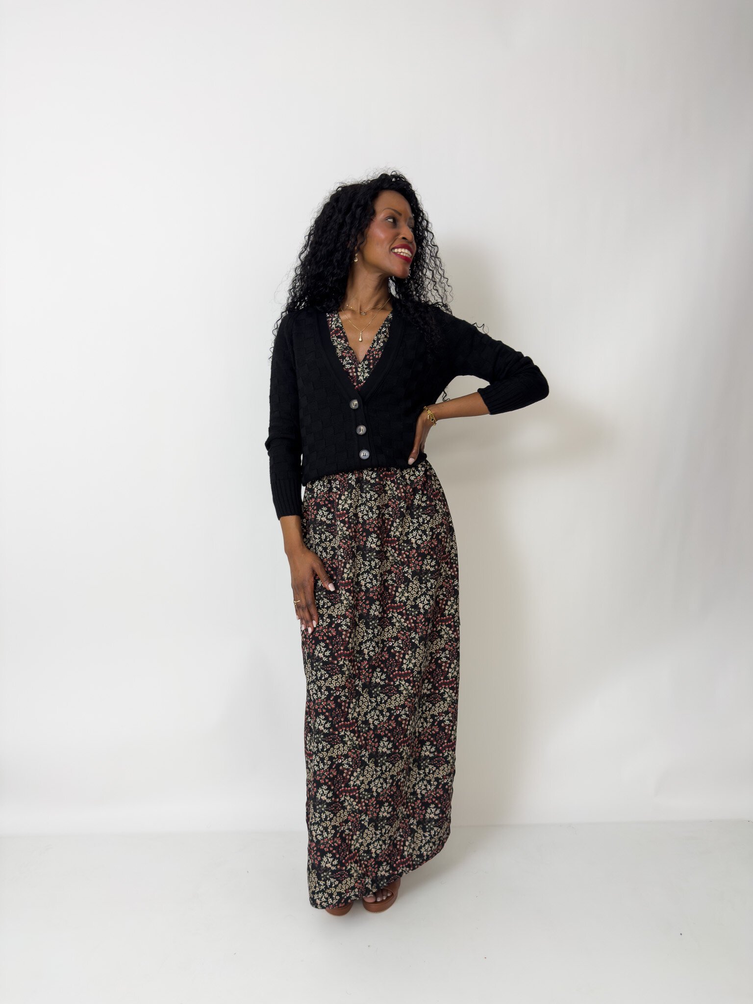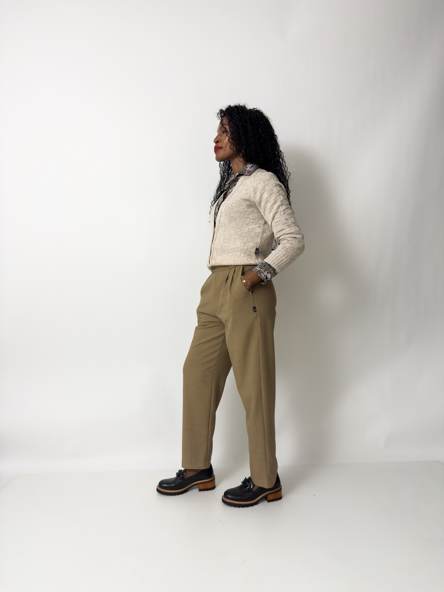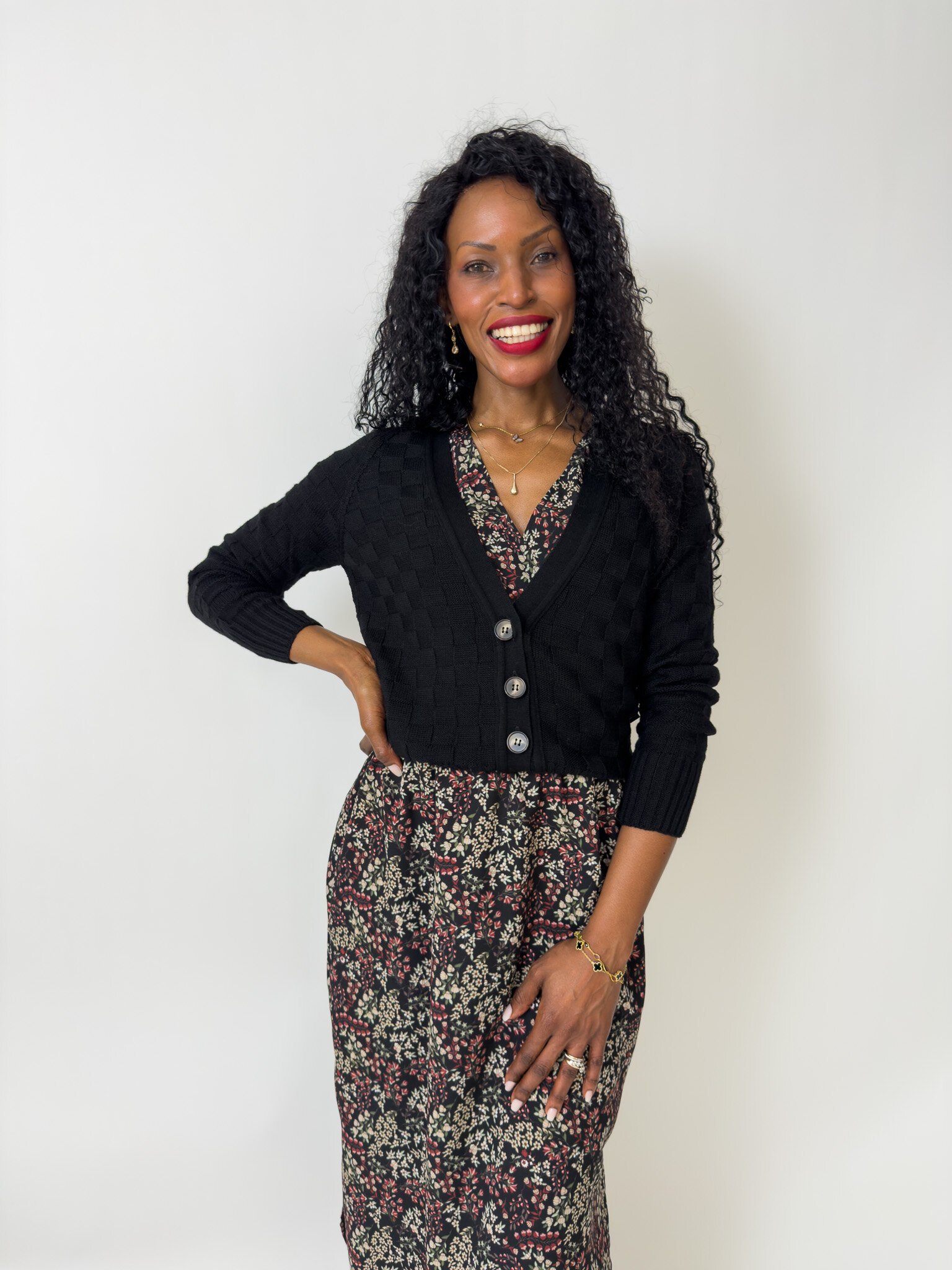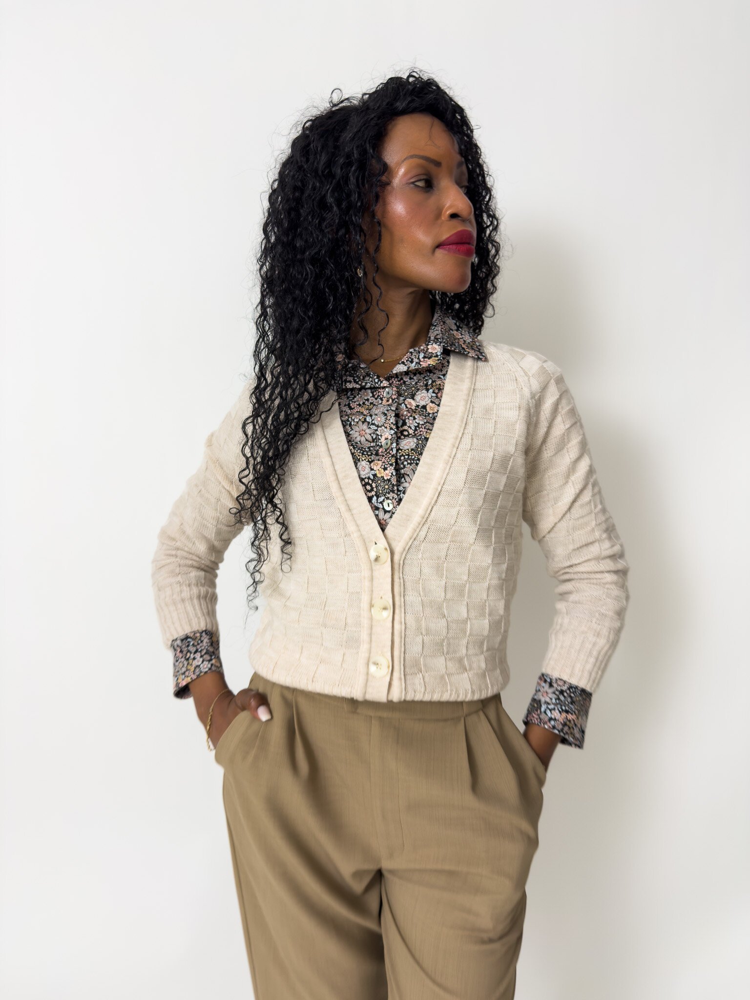 This Cardi is made from 100% merino and is a textured check knit. Ava is a button-up, waist length cardi.