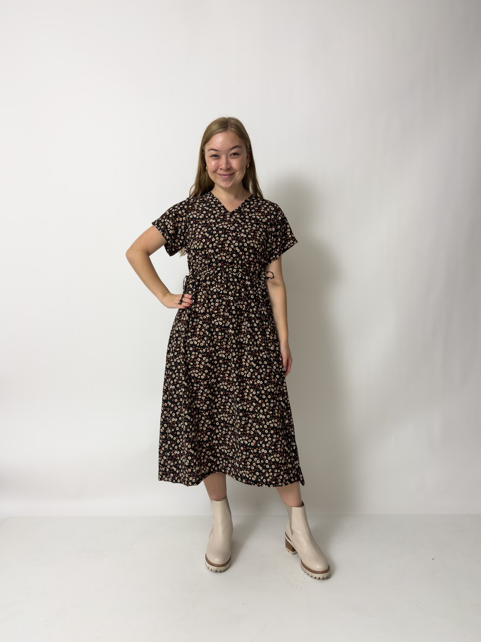 This reversible baby doll-style dress is mid-length and features short t-shirt sleeves with a drawstring waist detail and pockets!