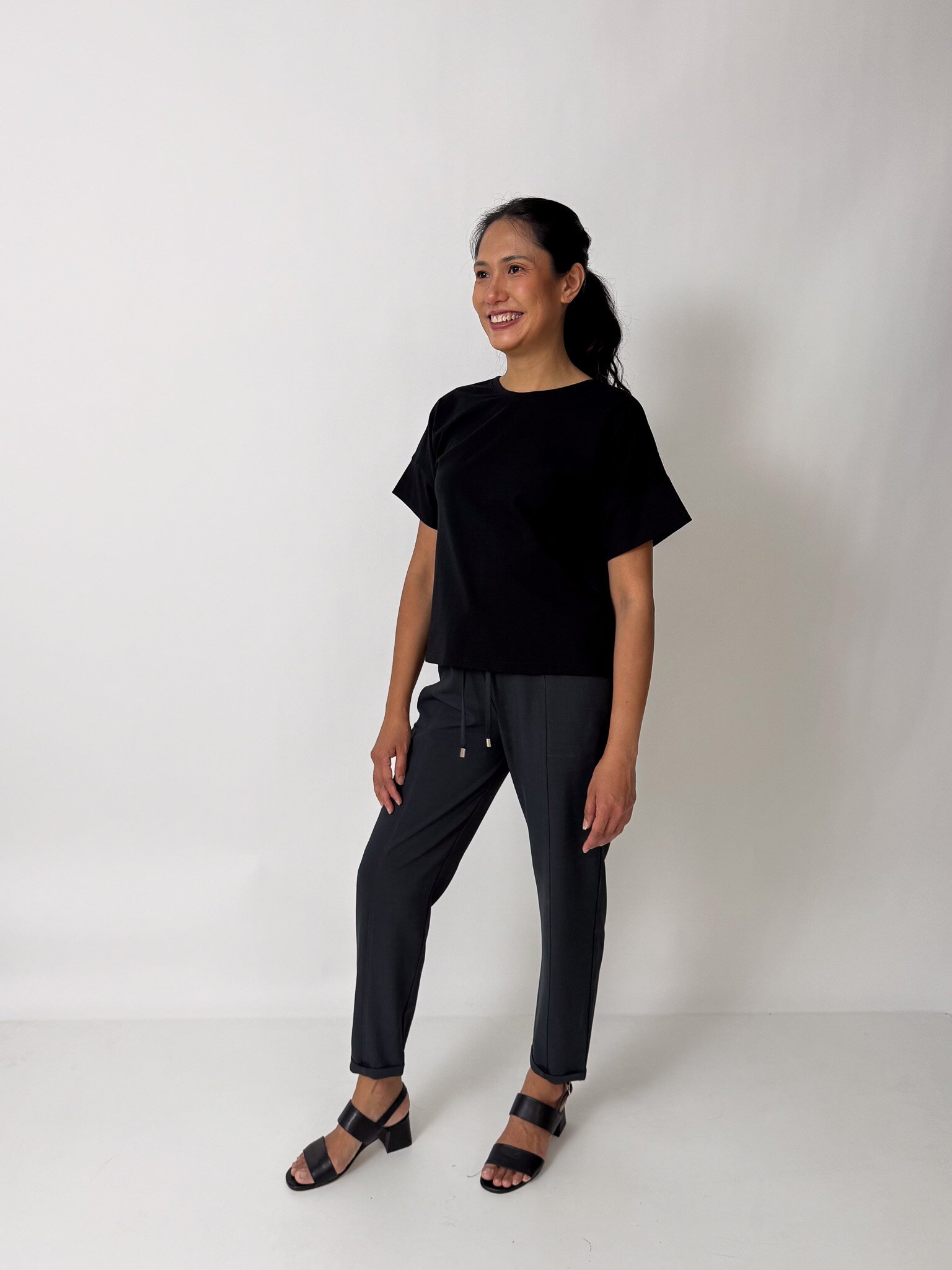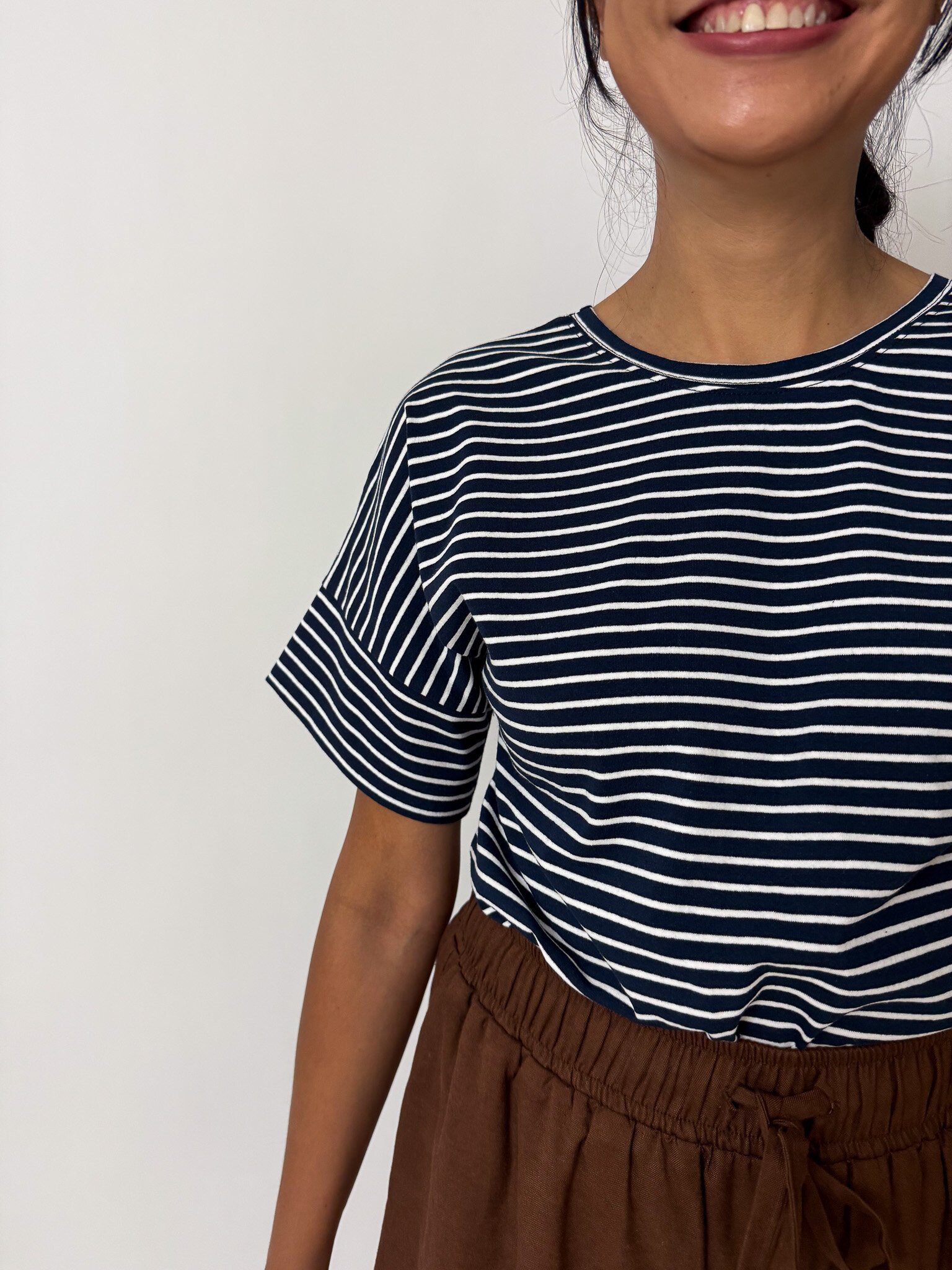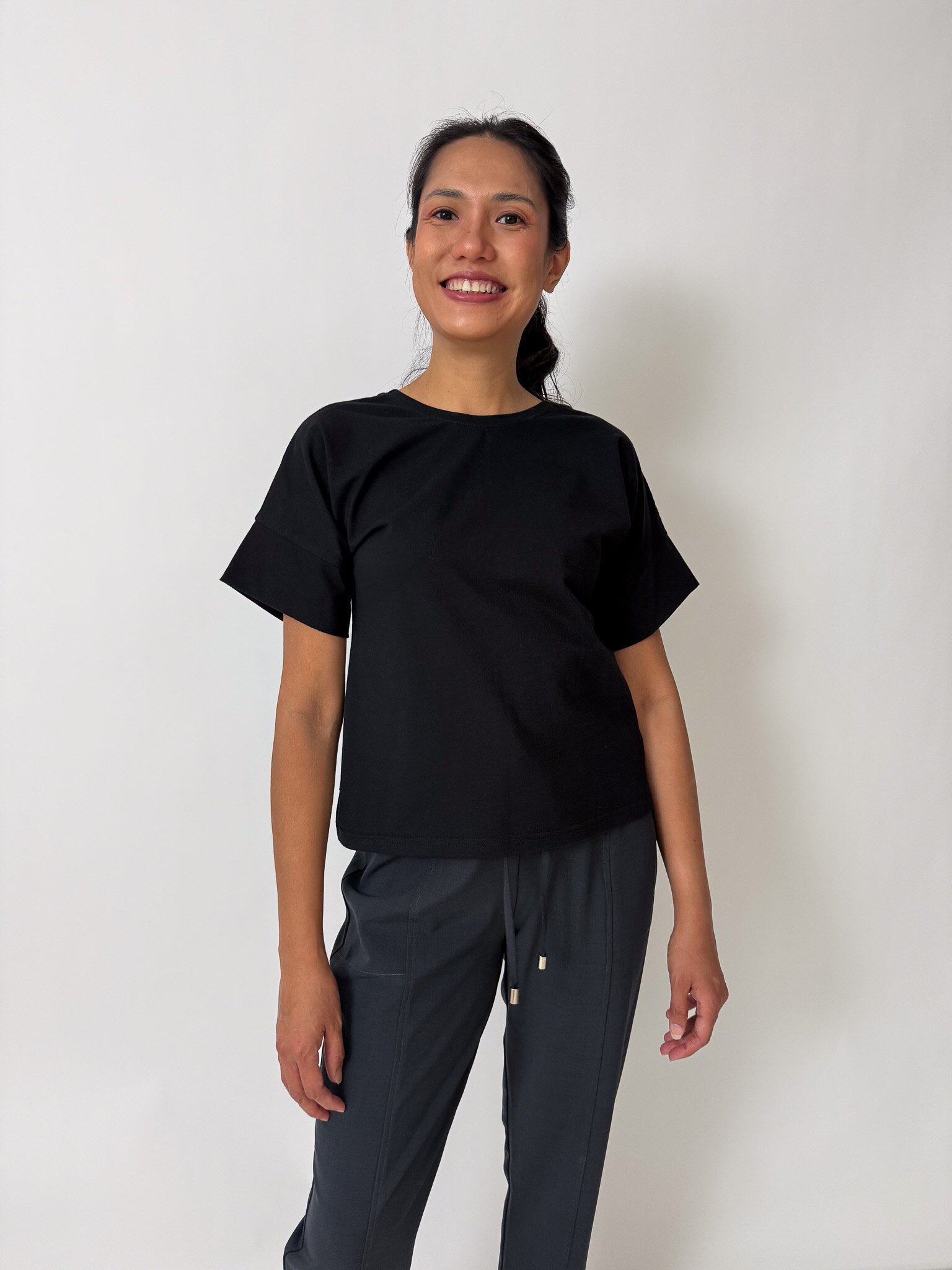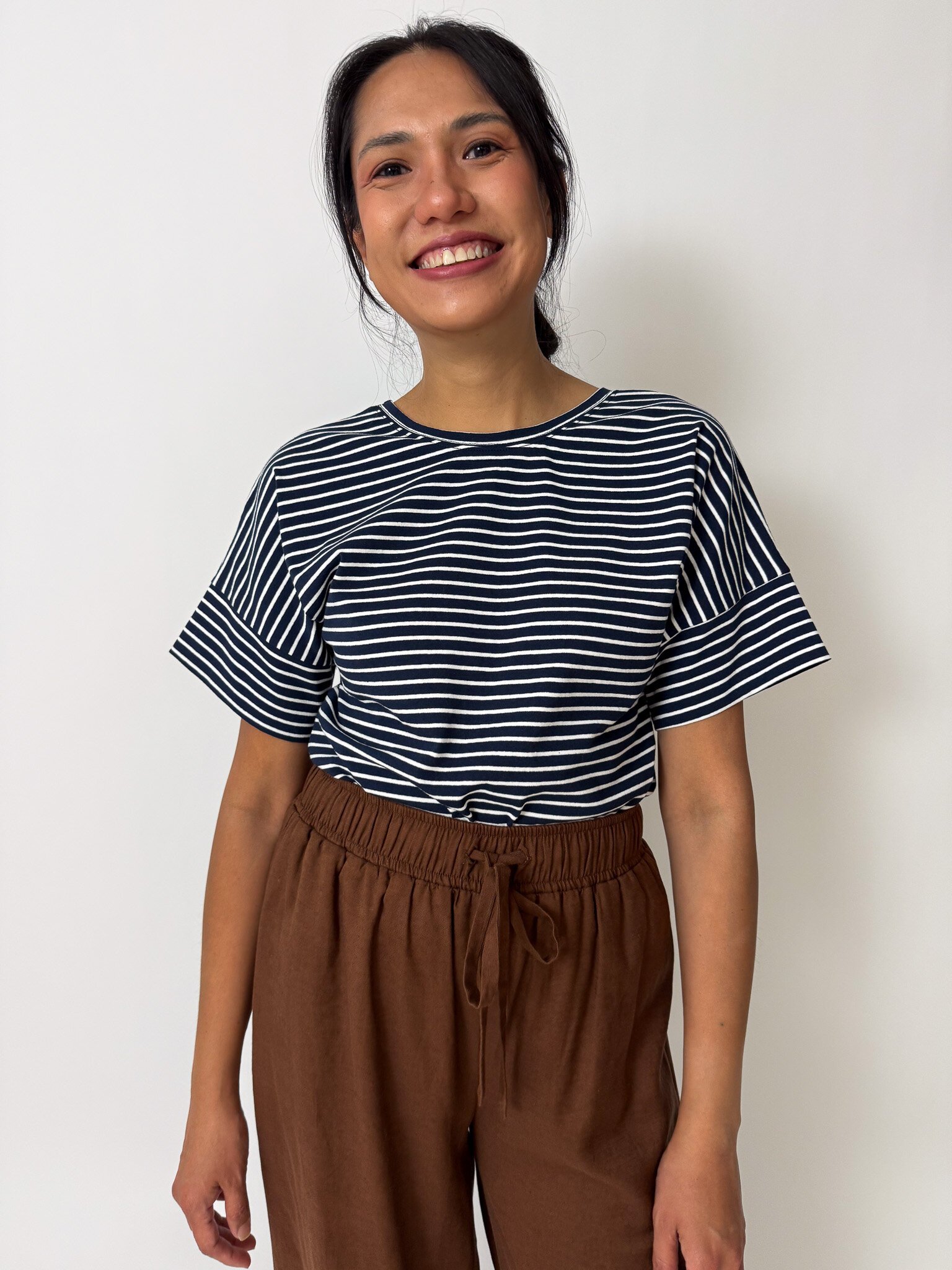 Our Bronte Top is reversible with a drop shoulder and sleeve cuff.