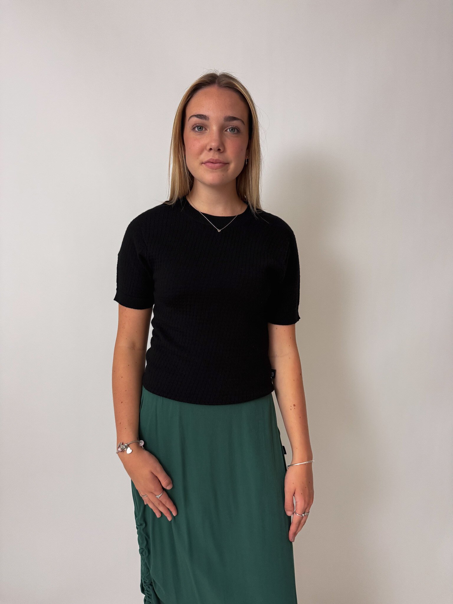 Our Charlie Top is a knitted t-shirt with a patterned detail, made out of 100% Merino.