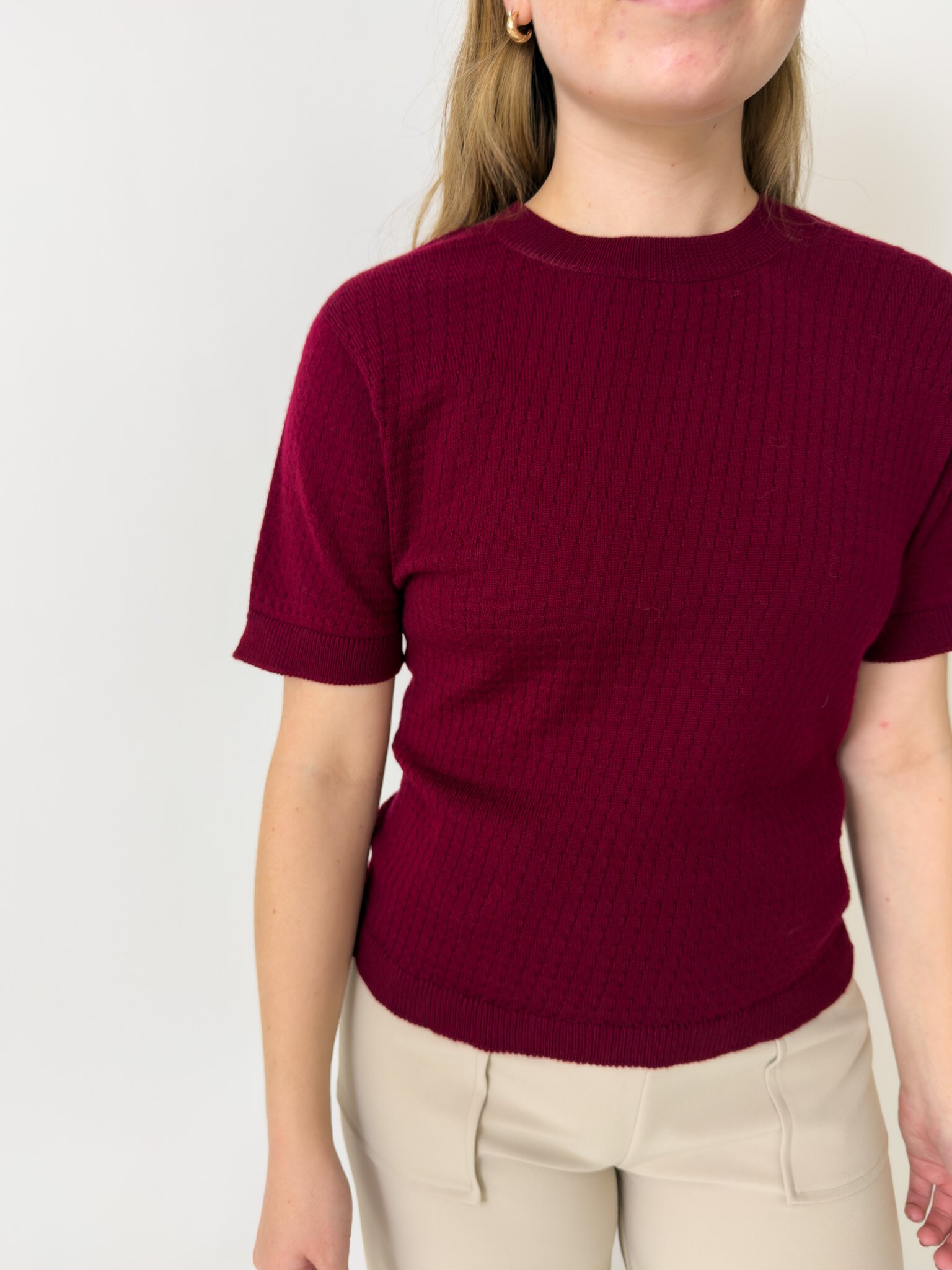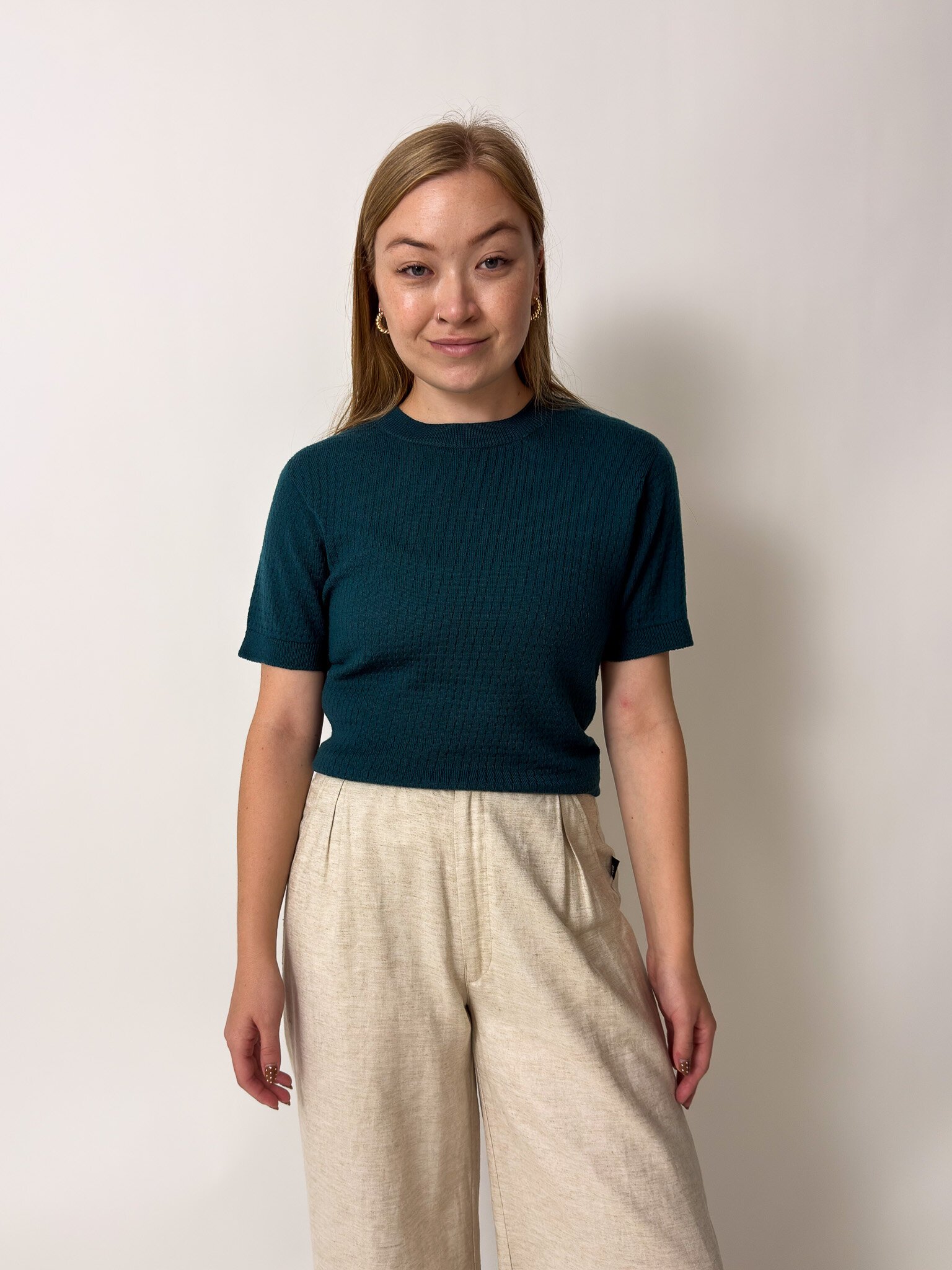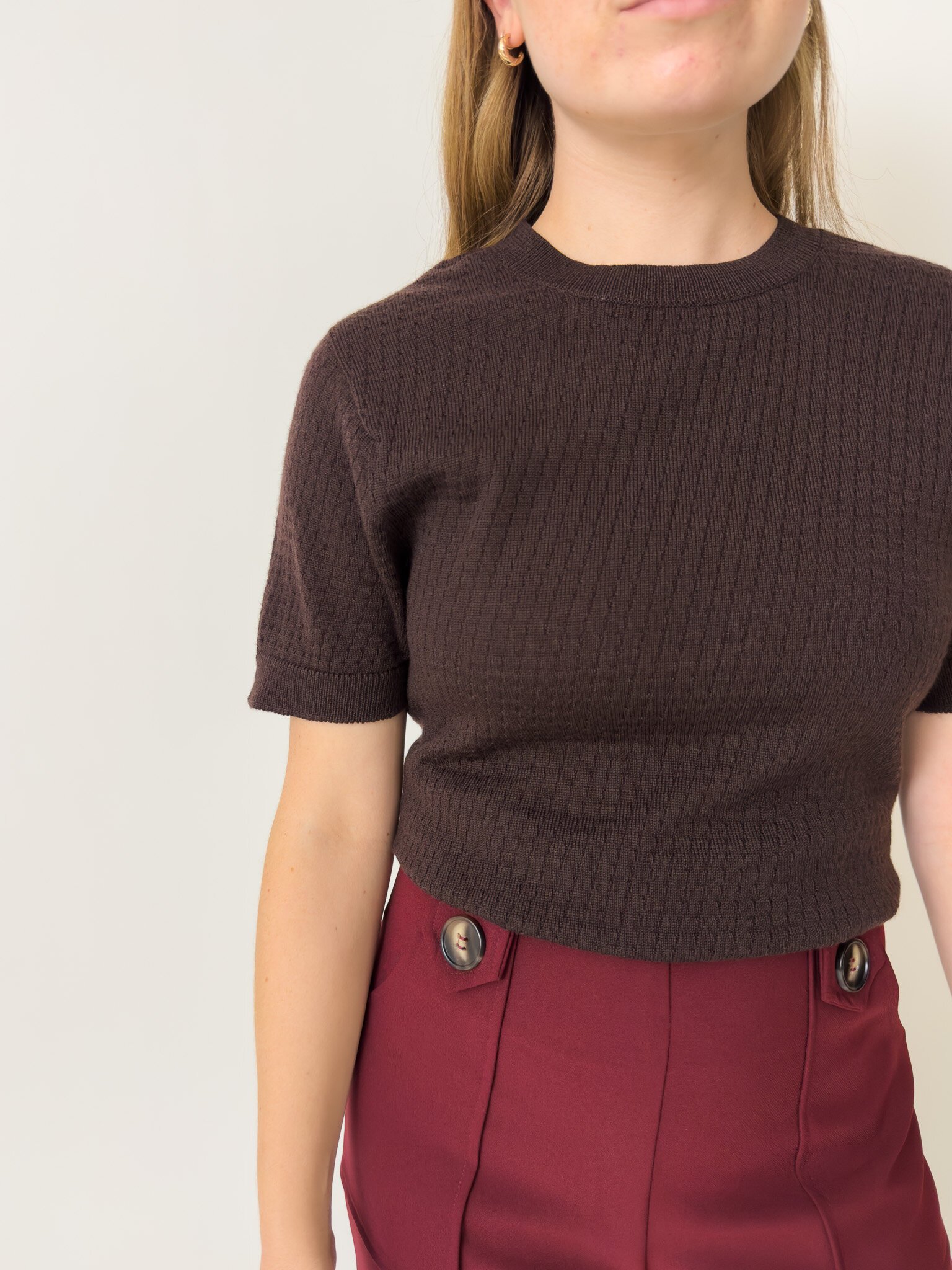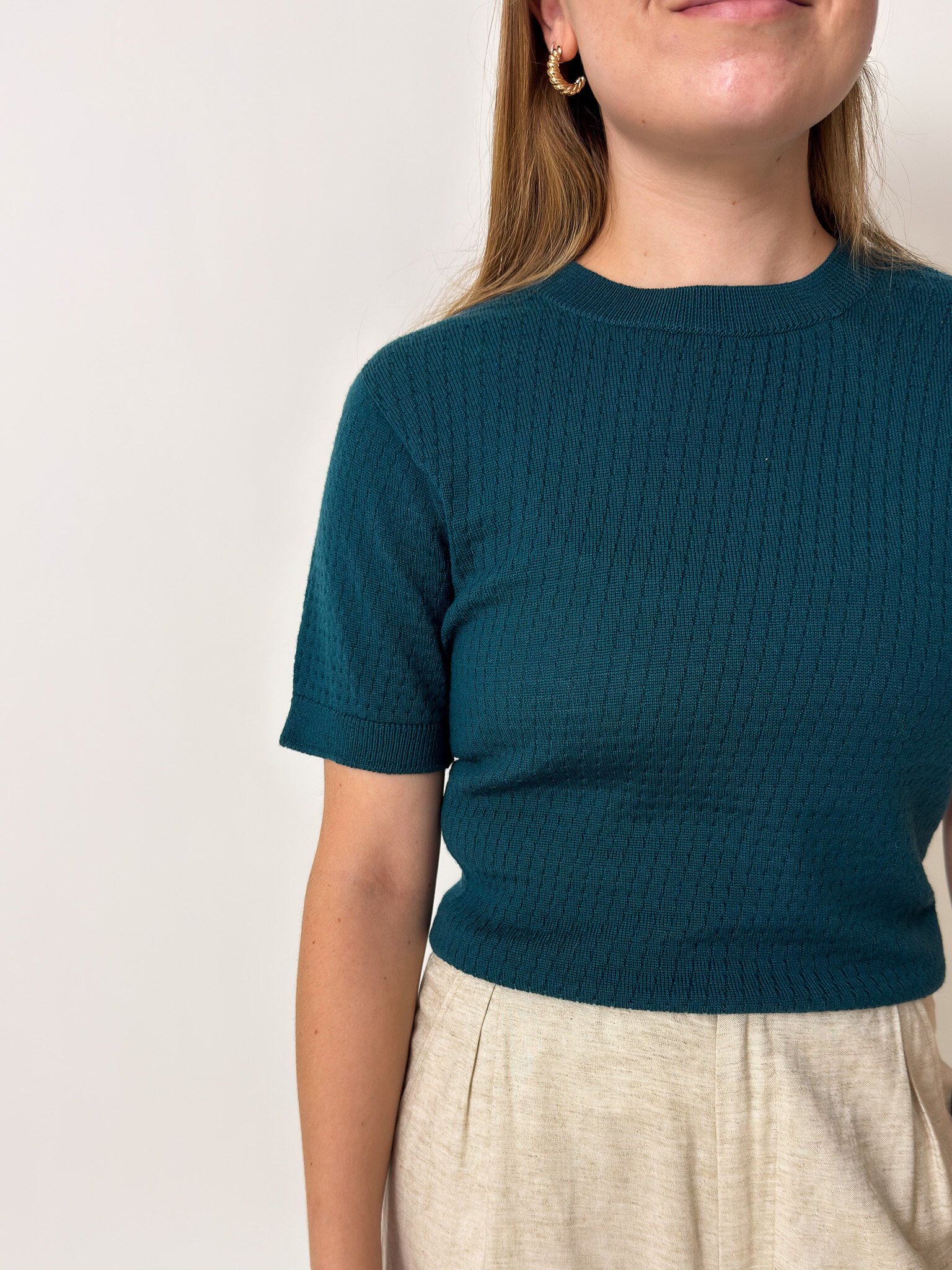 Our Charlie Top is a knitted t-shirt with a patterned detail, made out of 100% Merino.