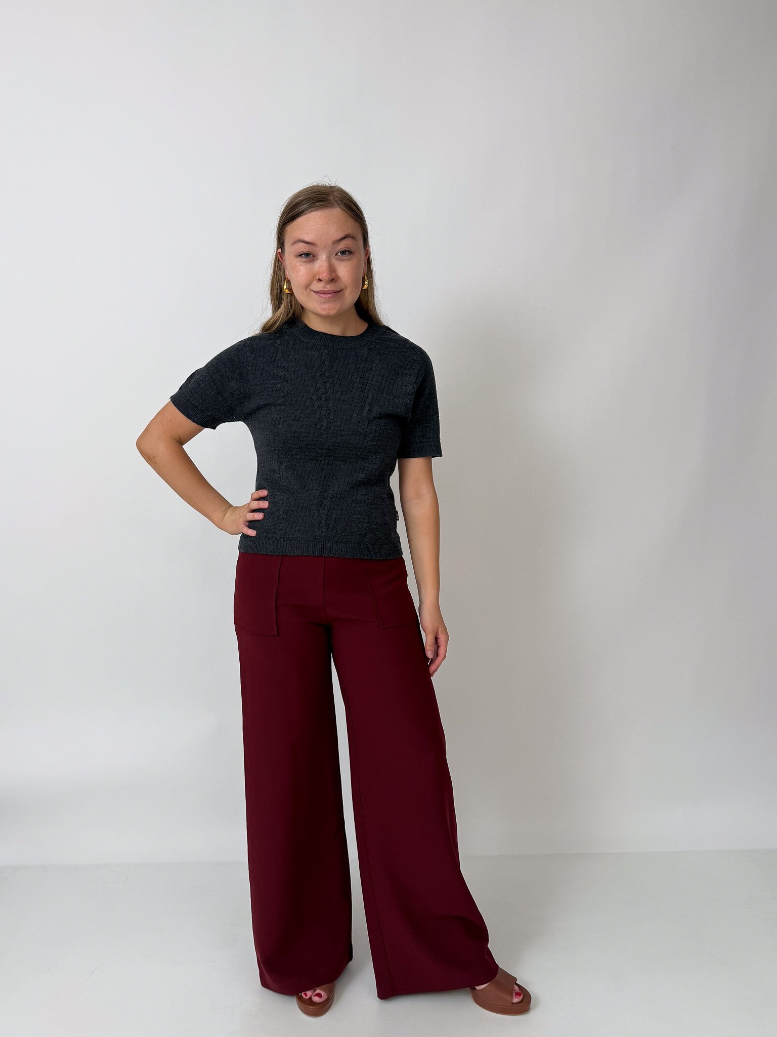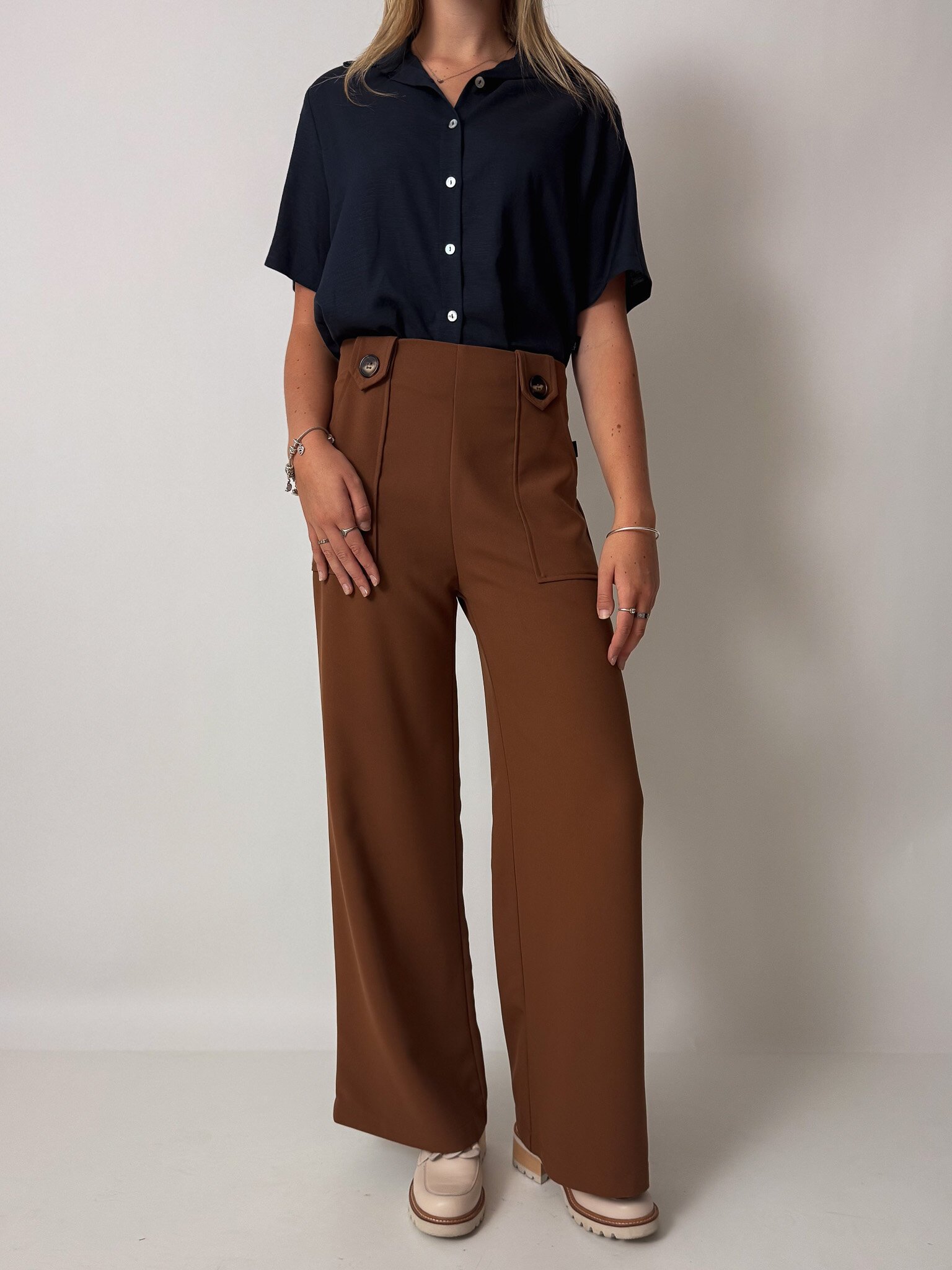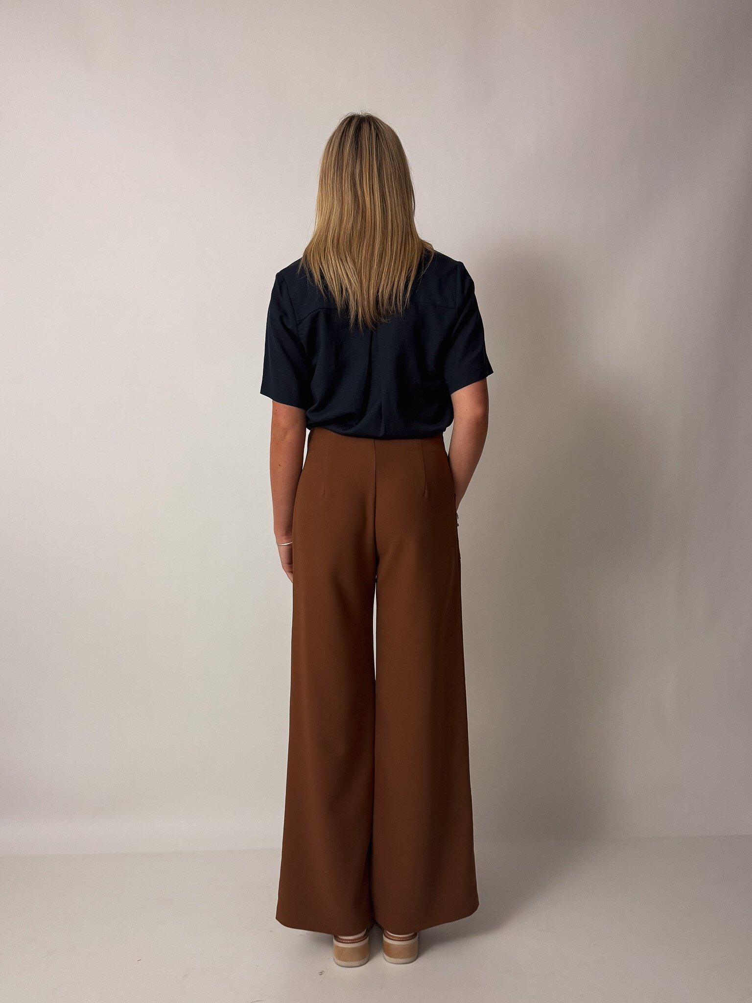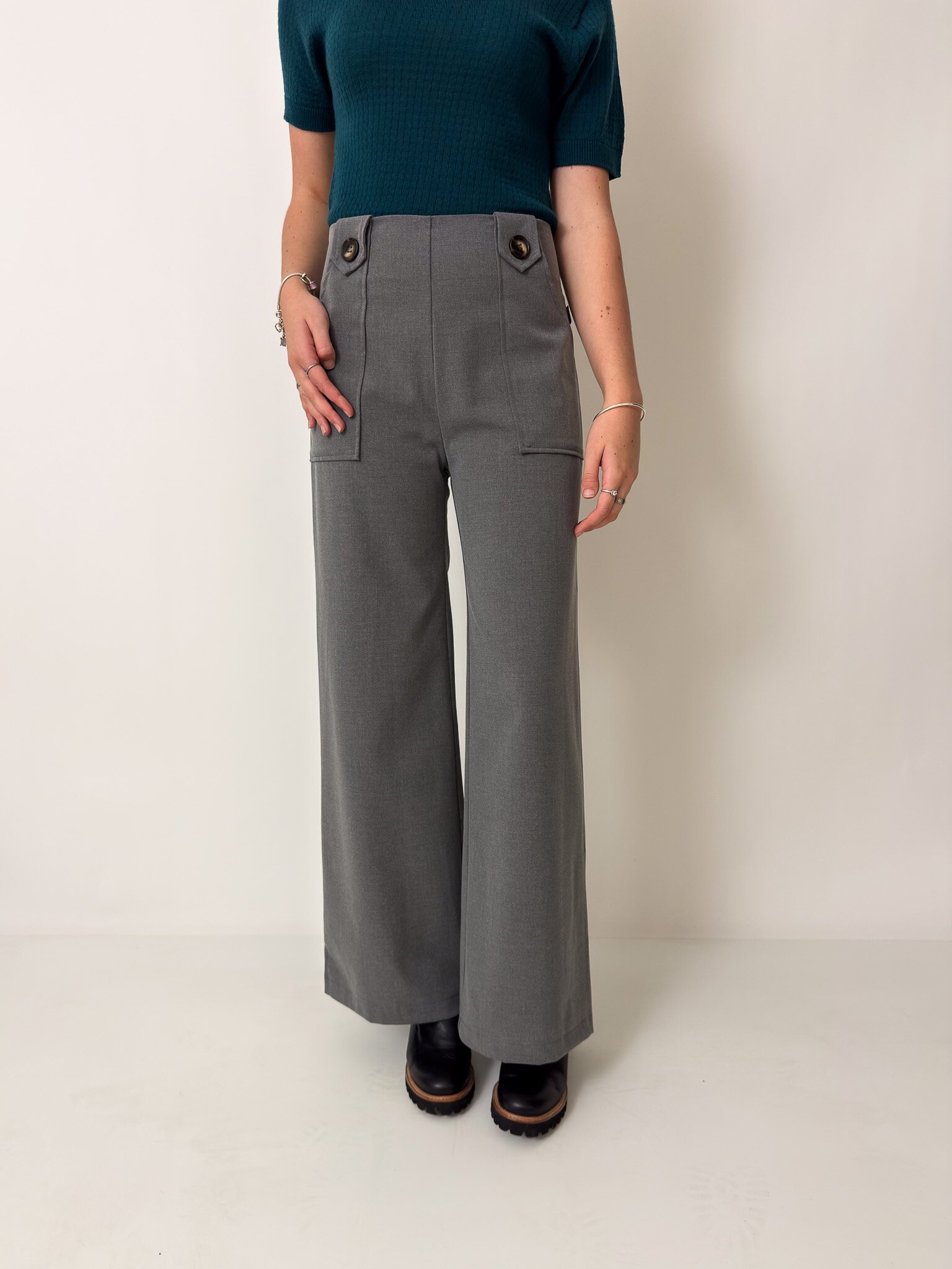 Our flattering Clarke Pants make you feel tall and curvy at the same time! Featuring a high waist, an invisible zip closure, a wide leg and cute patch pockets with buttons.