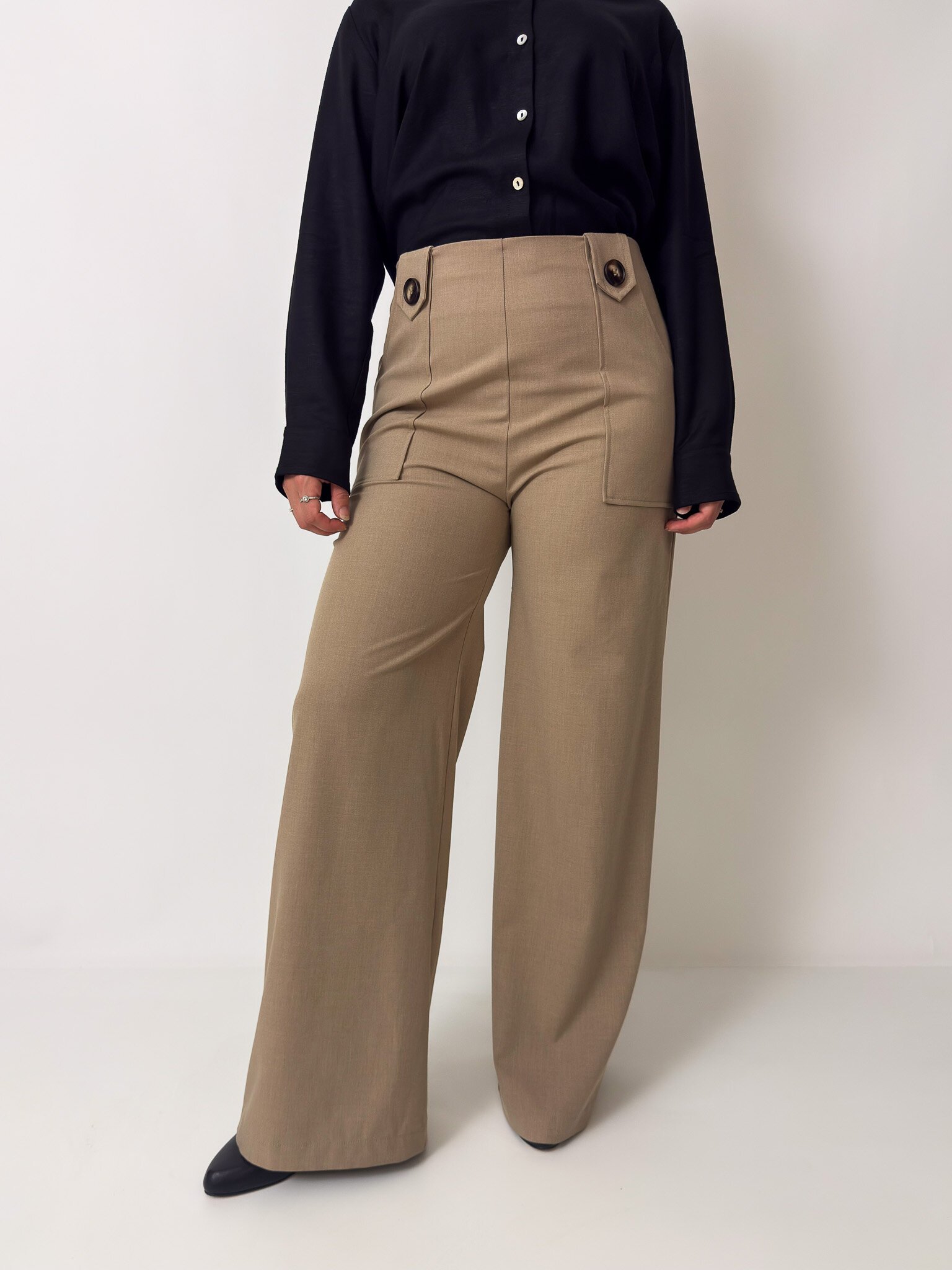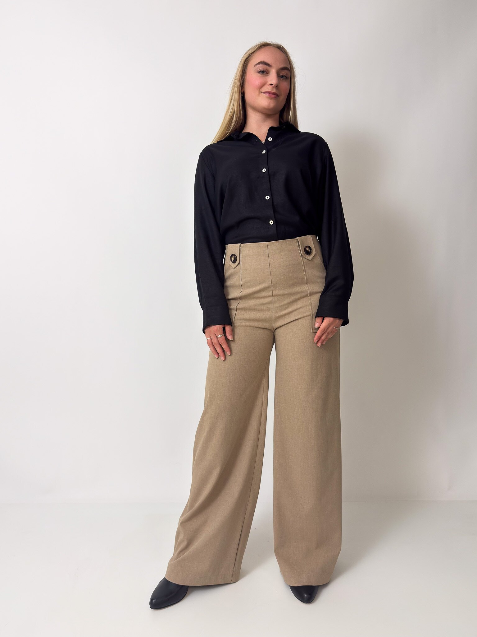 Our flattering Clarke Pants make you feel tall and curvy at the same time! Featuring a high waist, an invisible zip closure, a wide leg and cute patch pockets with buttons.