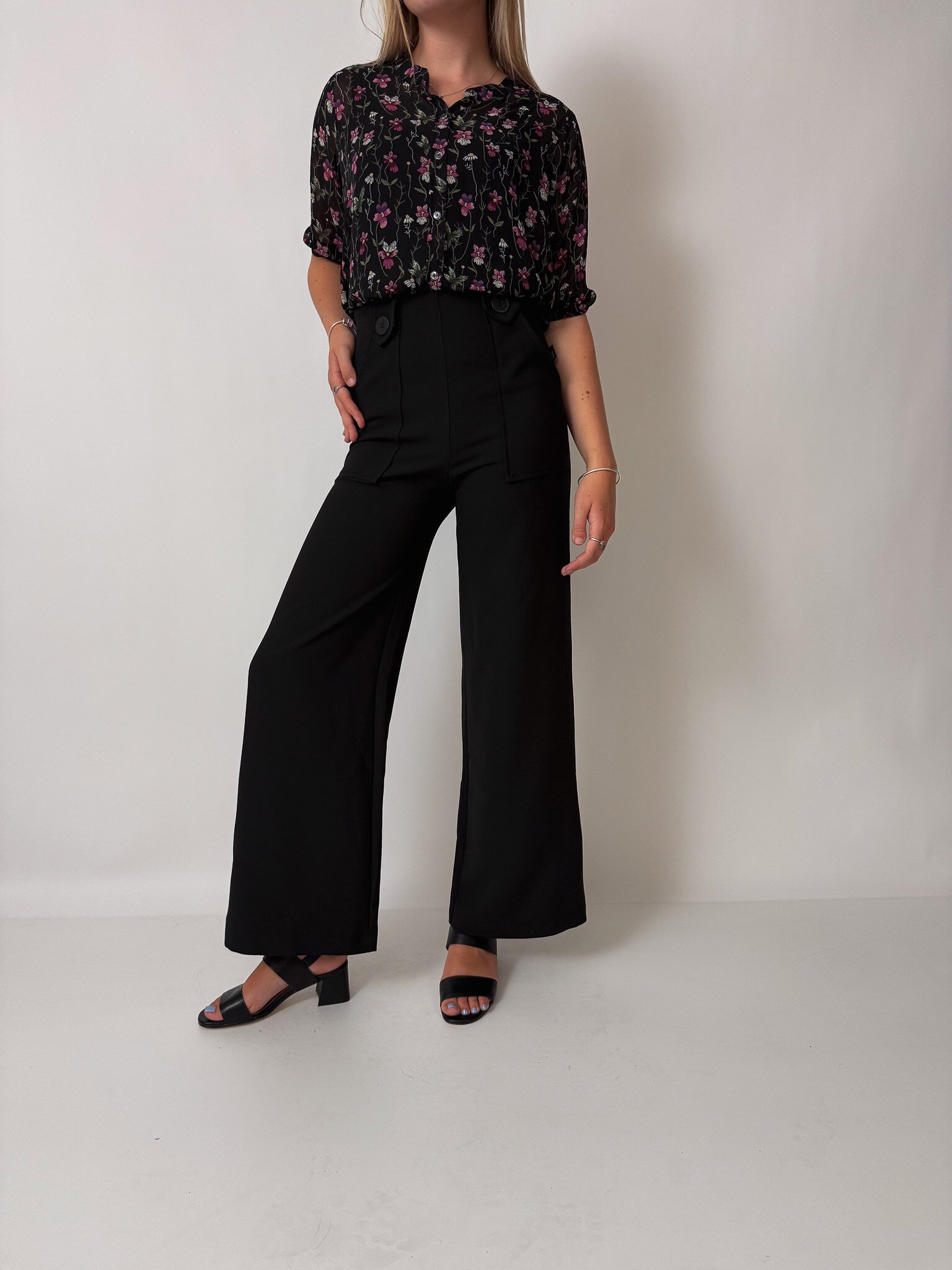 Our flattering Clarke Pants make you feel tall and curvy at the same time! Featuring a high waist, an invisible zip closure, a wide leg and cute patch pockets with buttons.