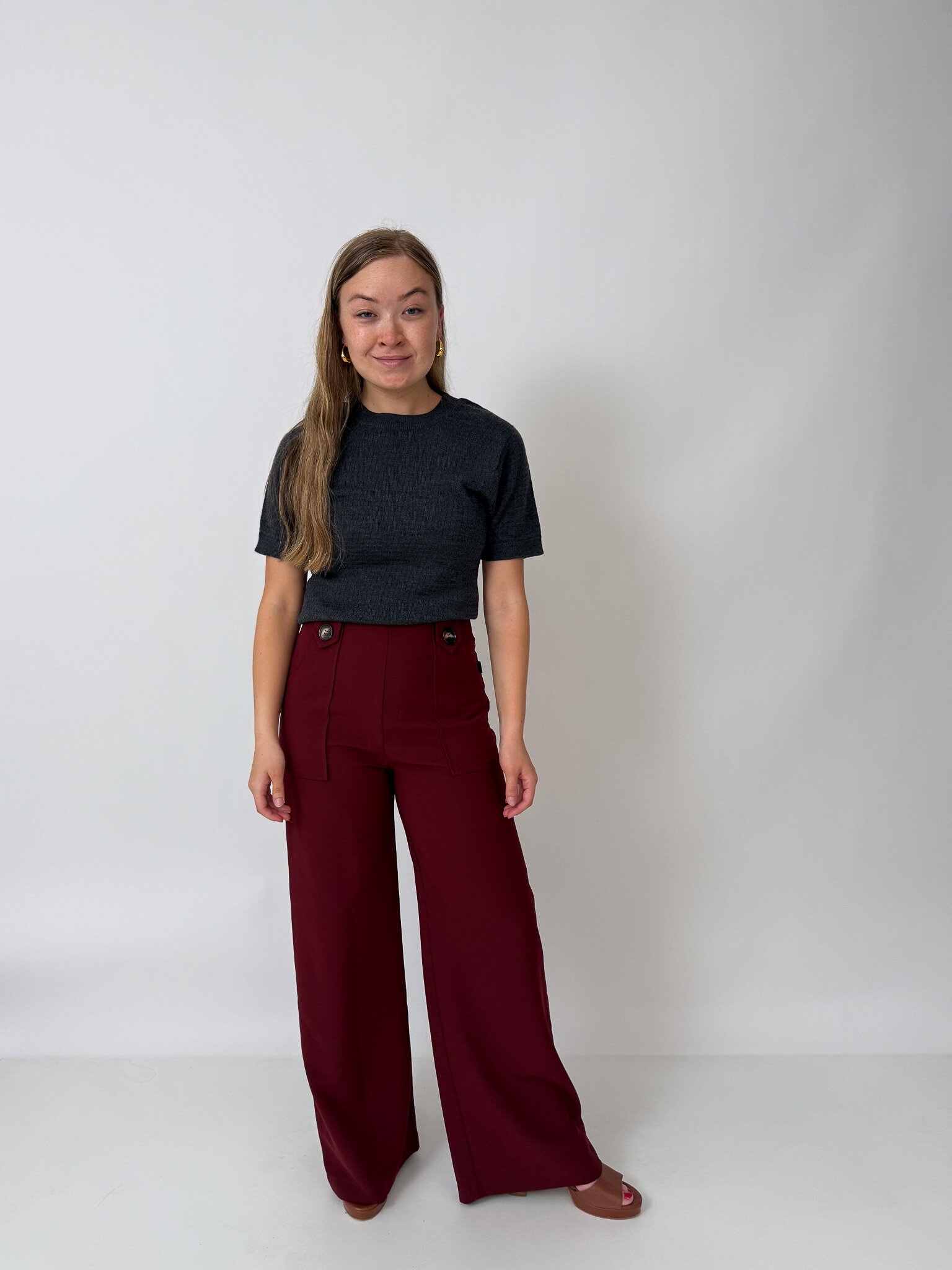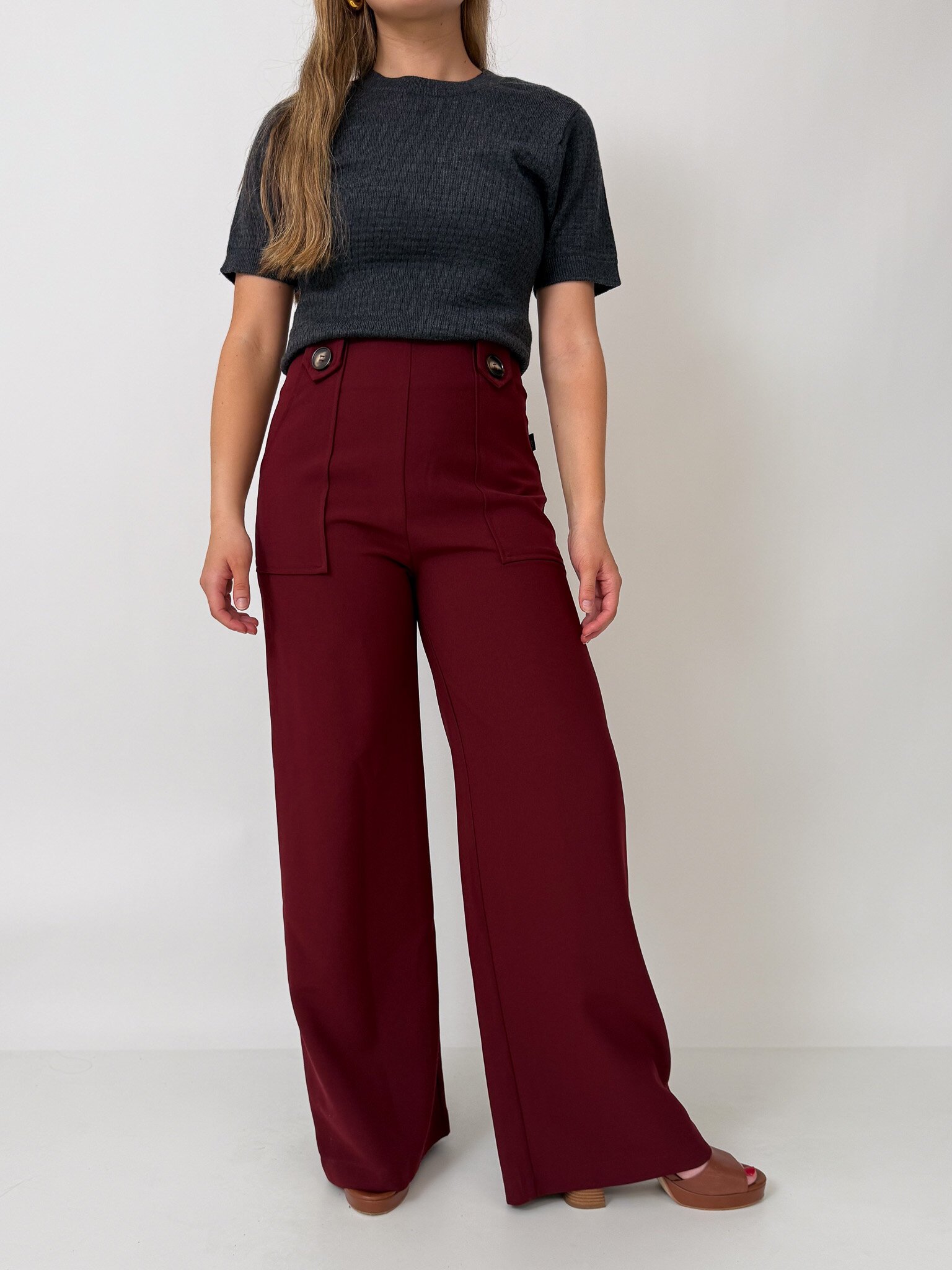 Our flattering Clarke Pants make you feel tall and curvy at the same time! Featuring a high waist, an invisible zip closure, a wide leg and cute patch pockets with buttons.