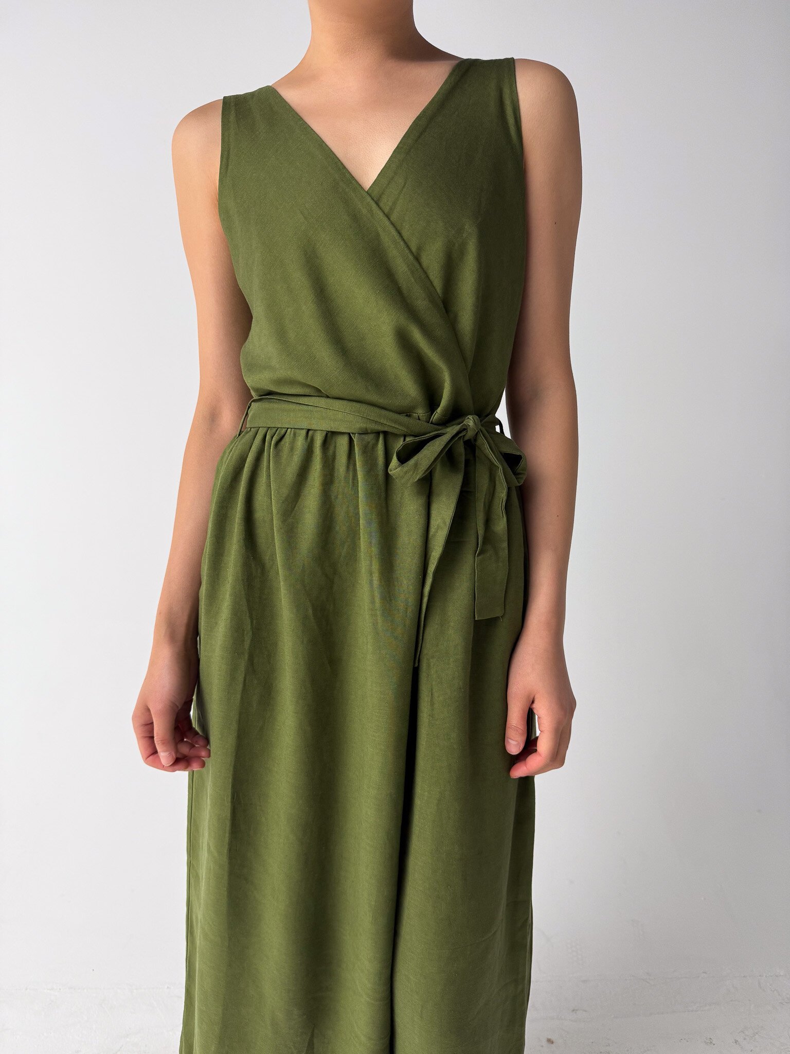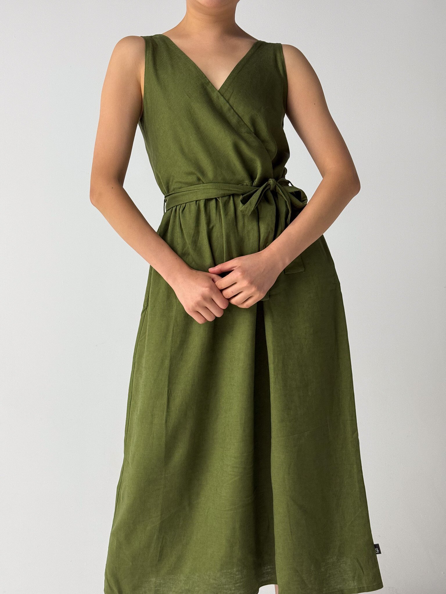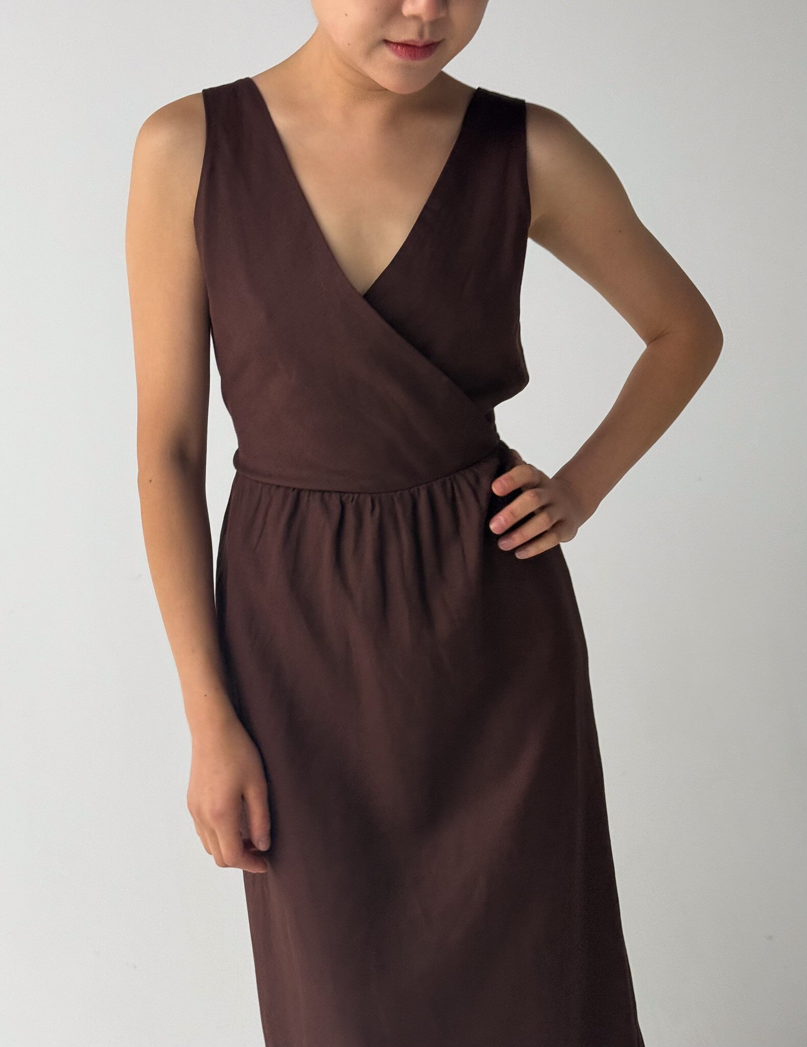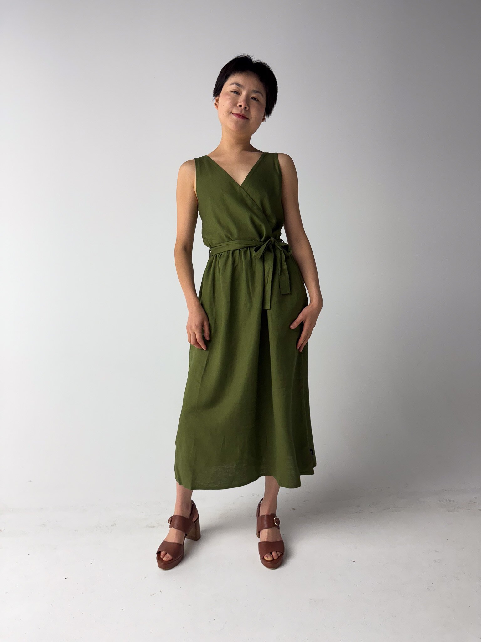 This reversible midi-length dress features a faux wrap front and round scoop back, adjustable straps, waist tie and pockets.