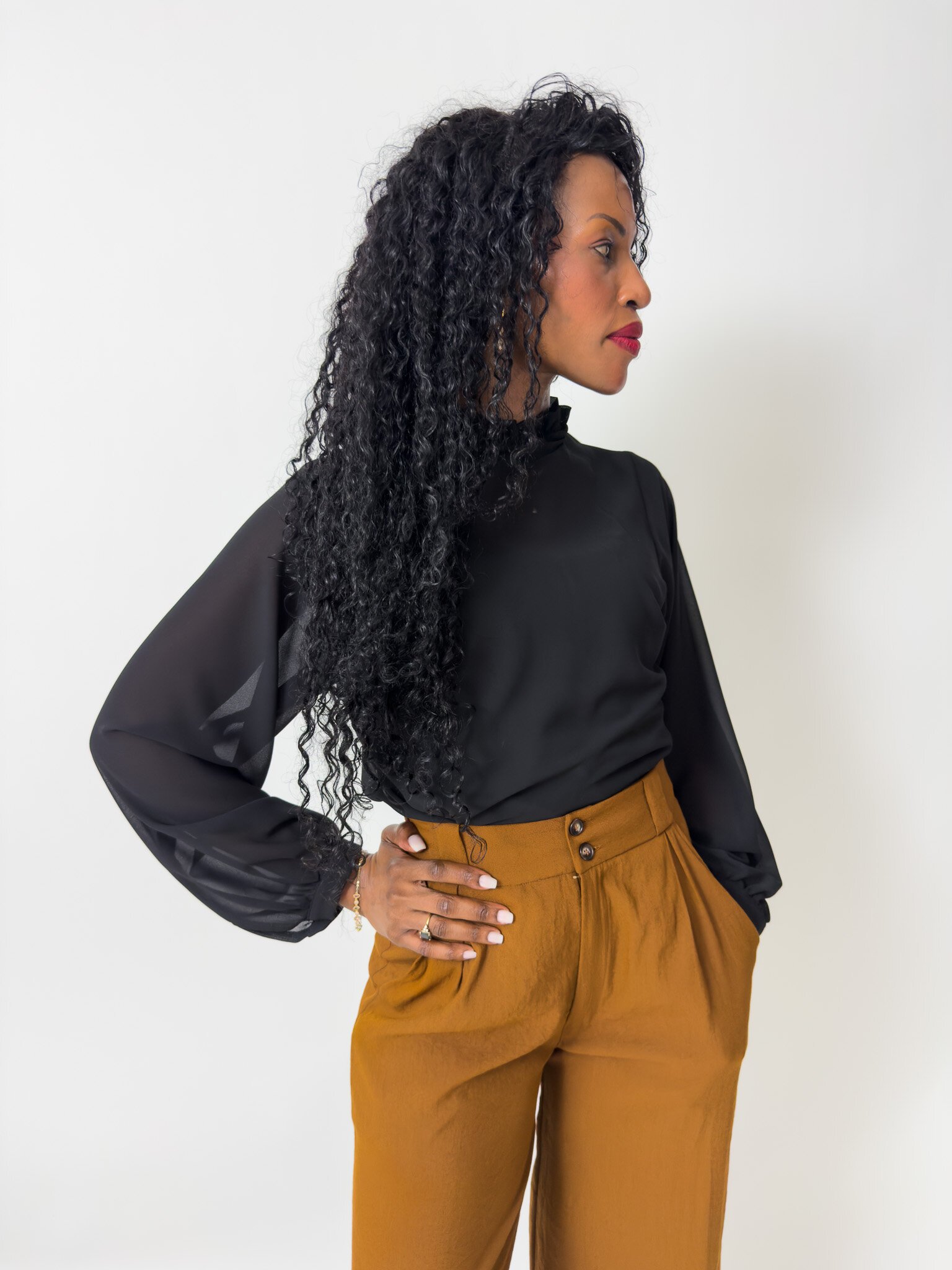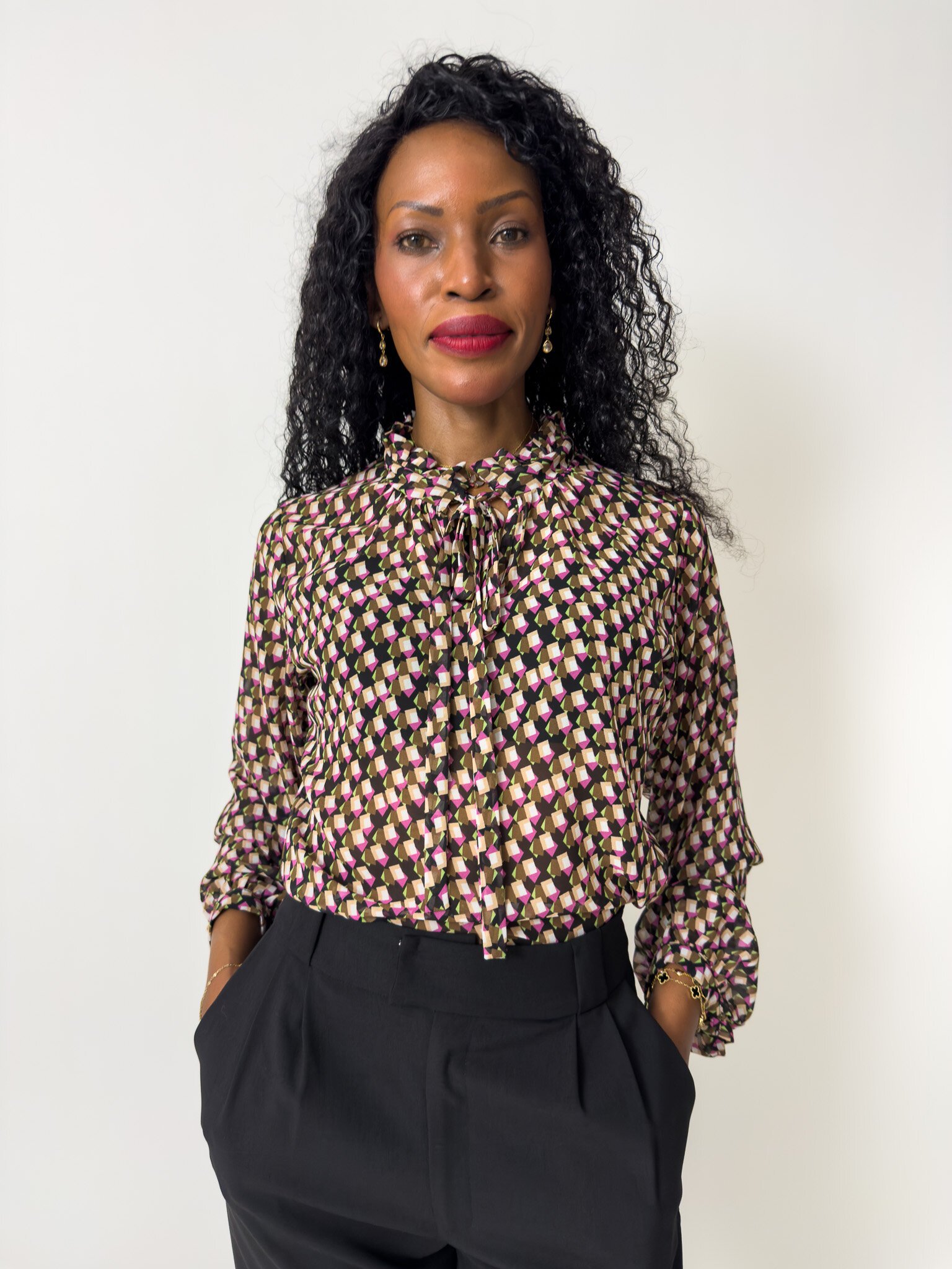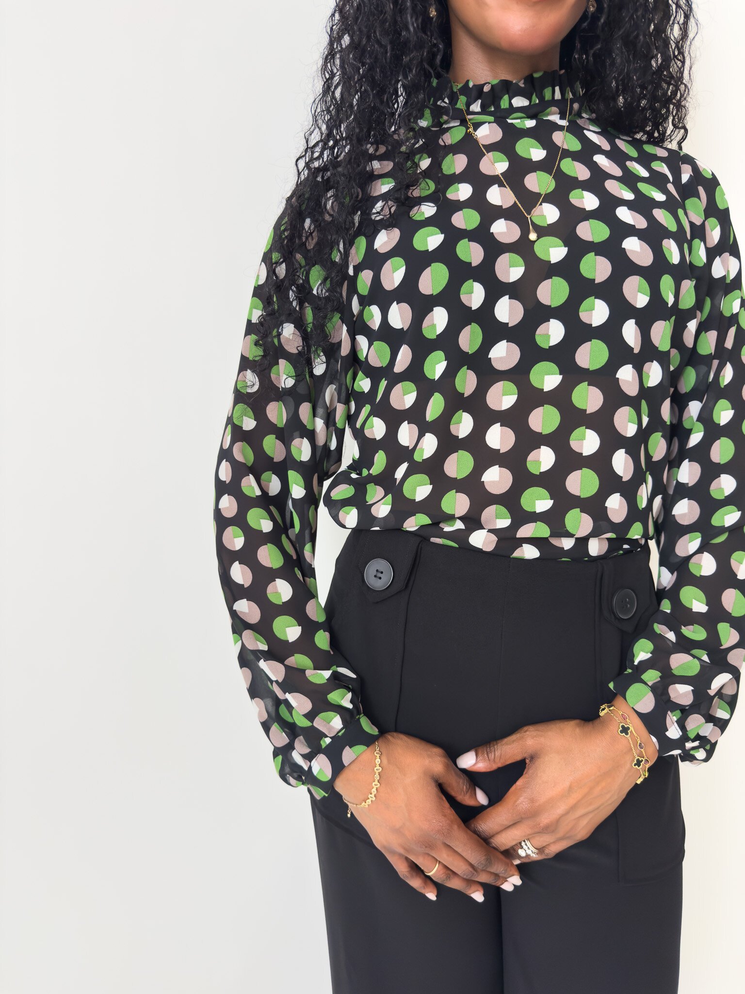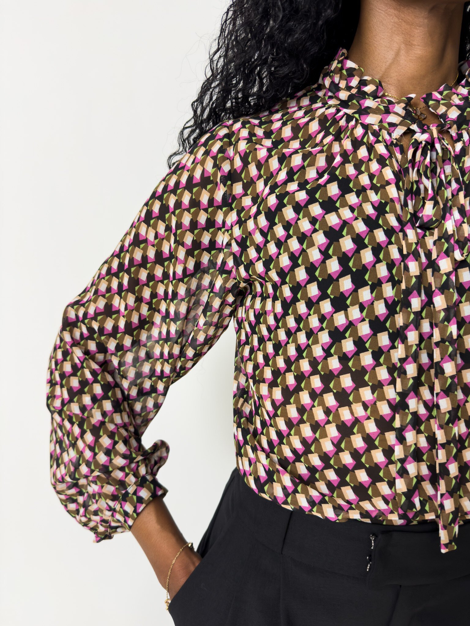This blouse features a neck ruffle and tie and long gathered sleeves with a cuff and button closure.