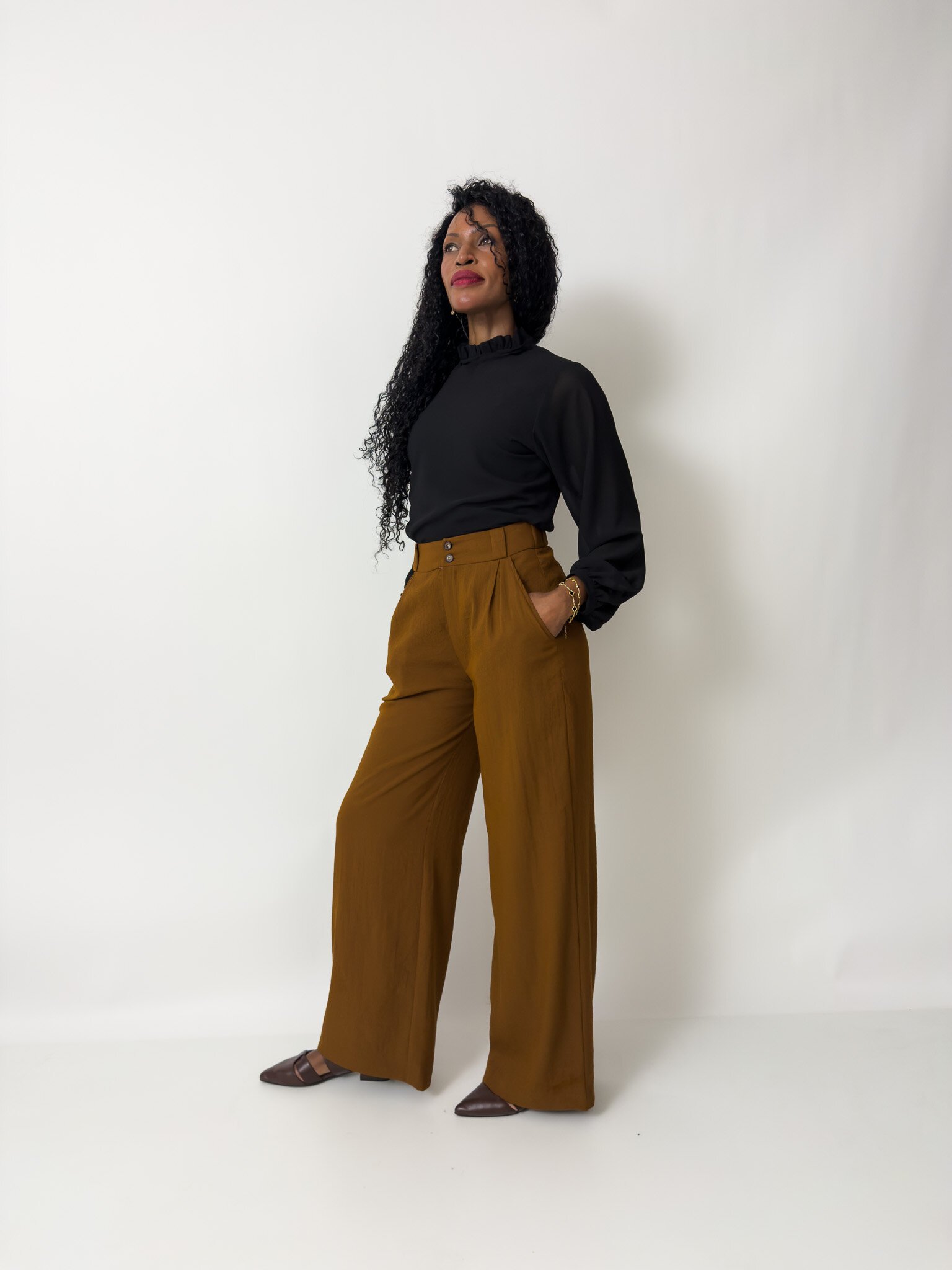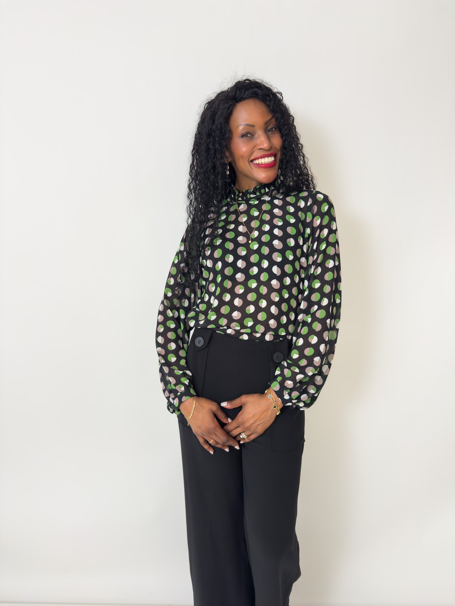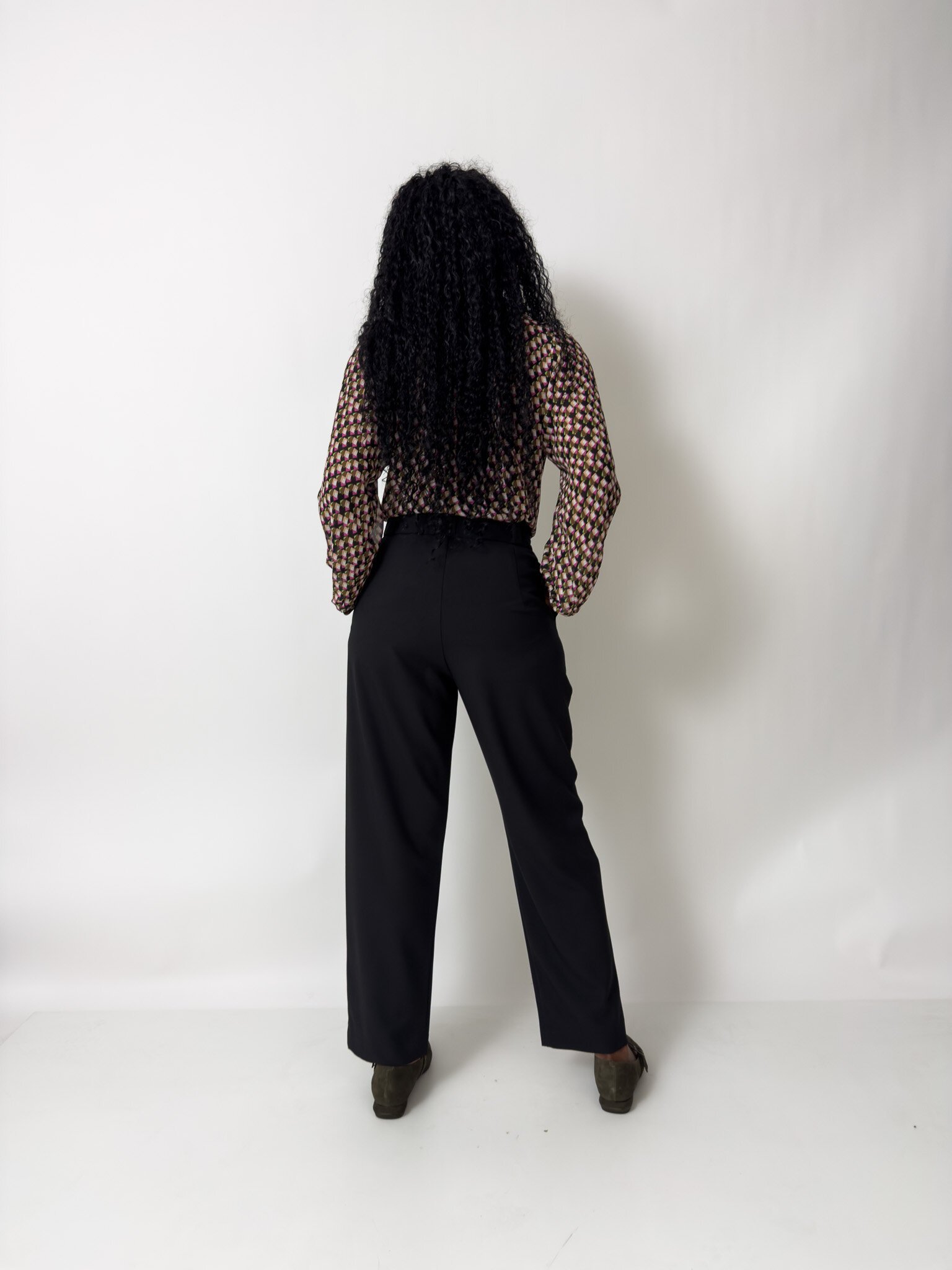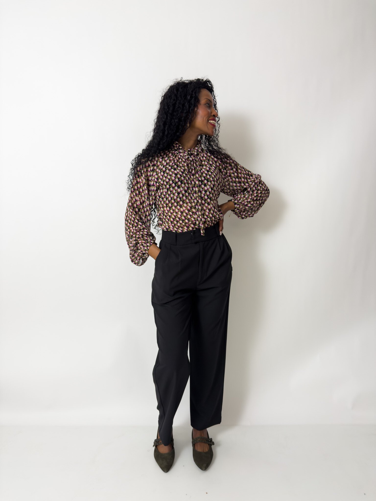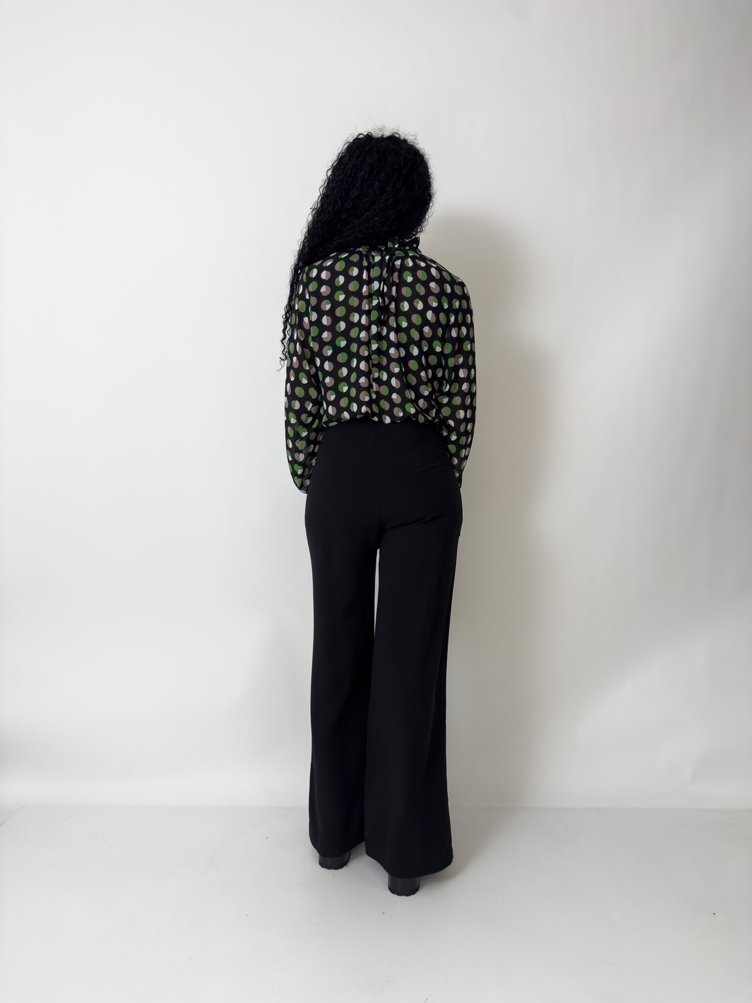 This blouse features a neck ruffle and tie and long gathered sleeves with a cuff and button closure.