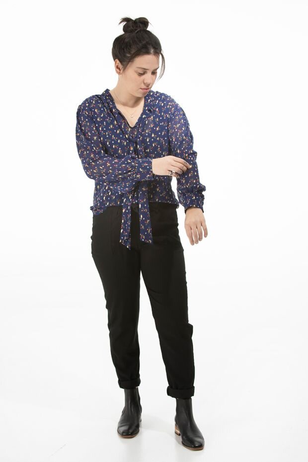 Florence is a long sleeve shirt with a keyhole and bow detail at the front. This shirt gathers on the front shoulder and cuff and features a curved hem.