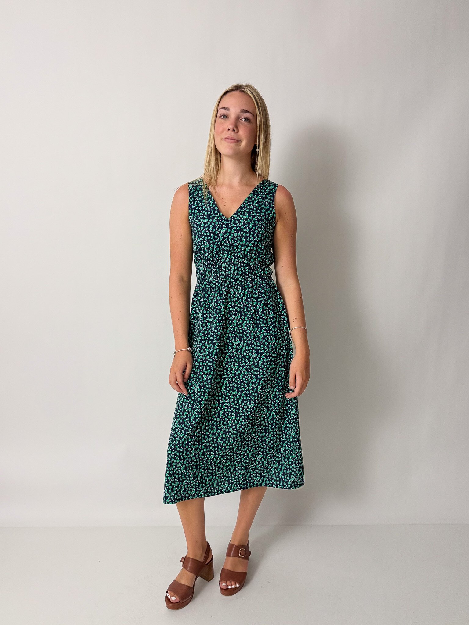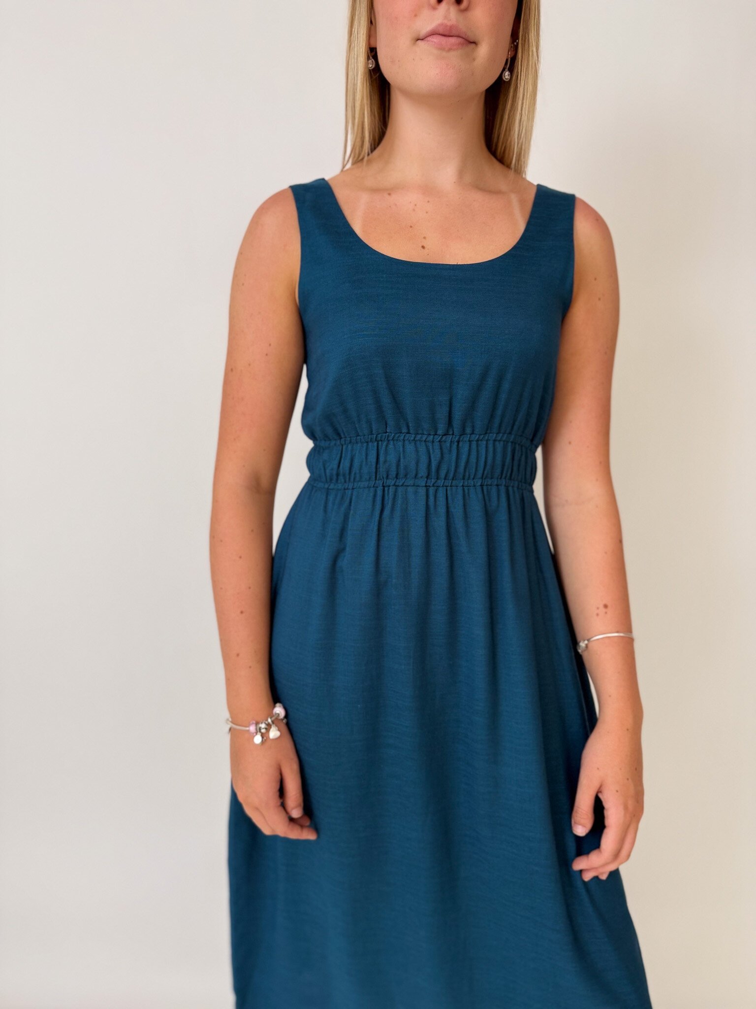 This sleeveless midi dress features an elasticated waist, pockets and is reversible!