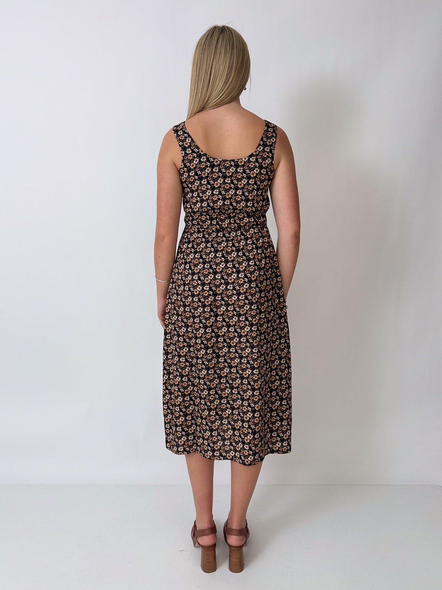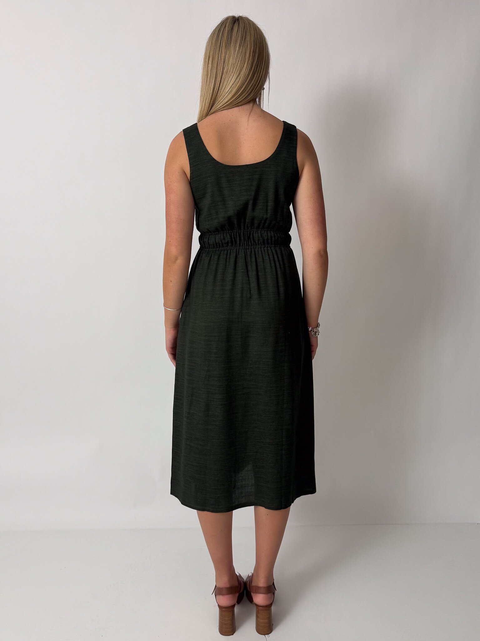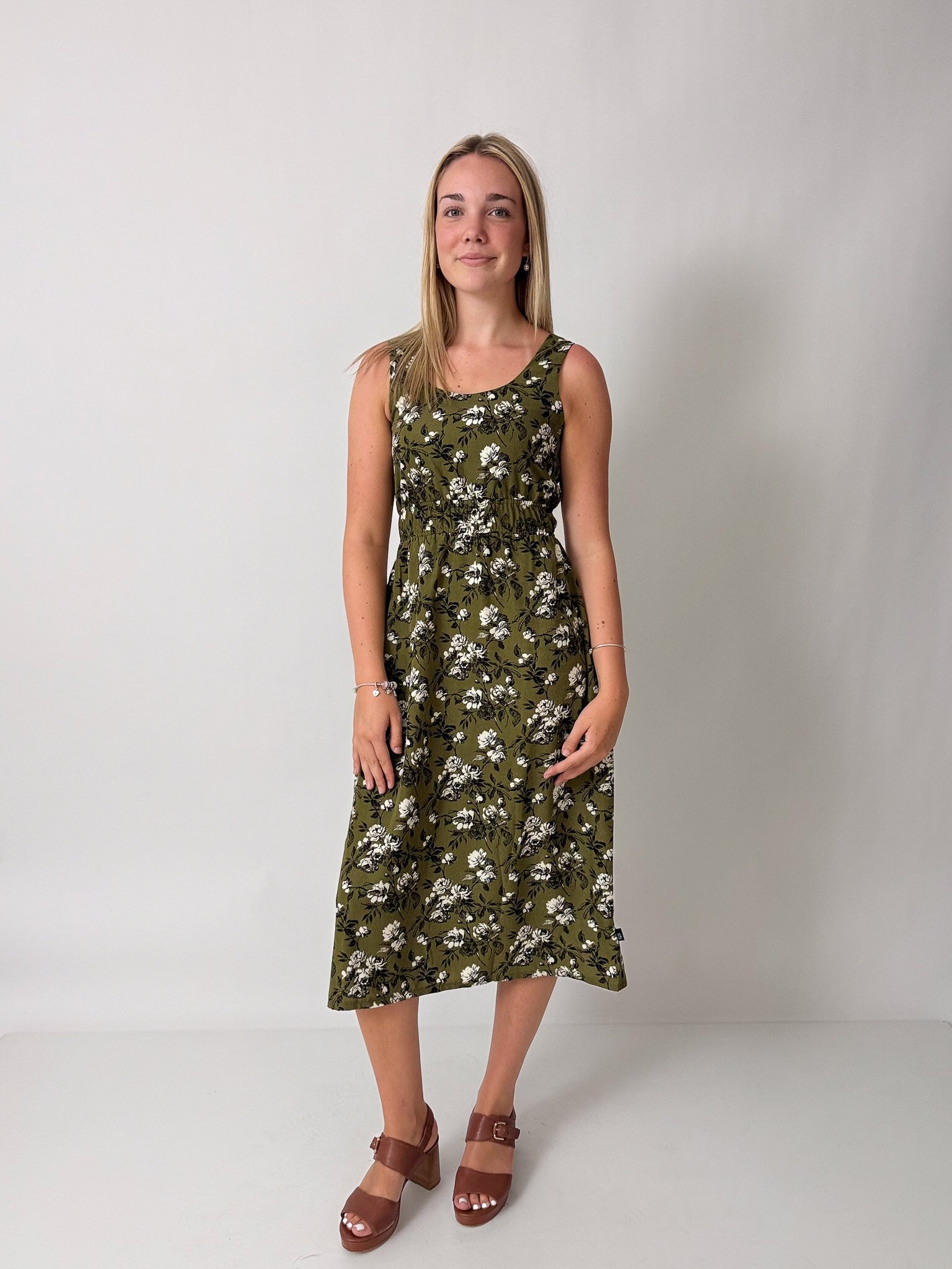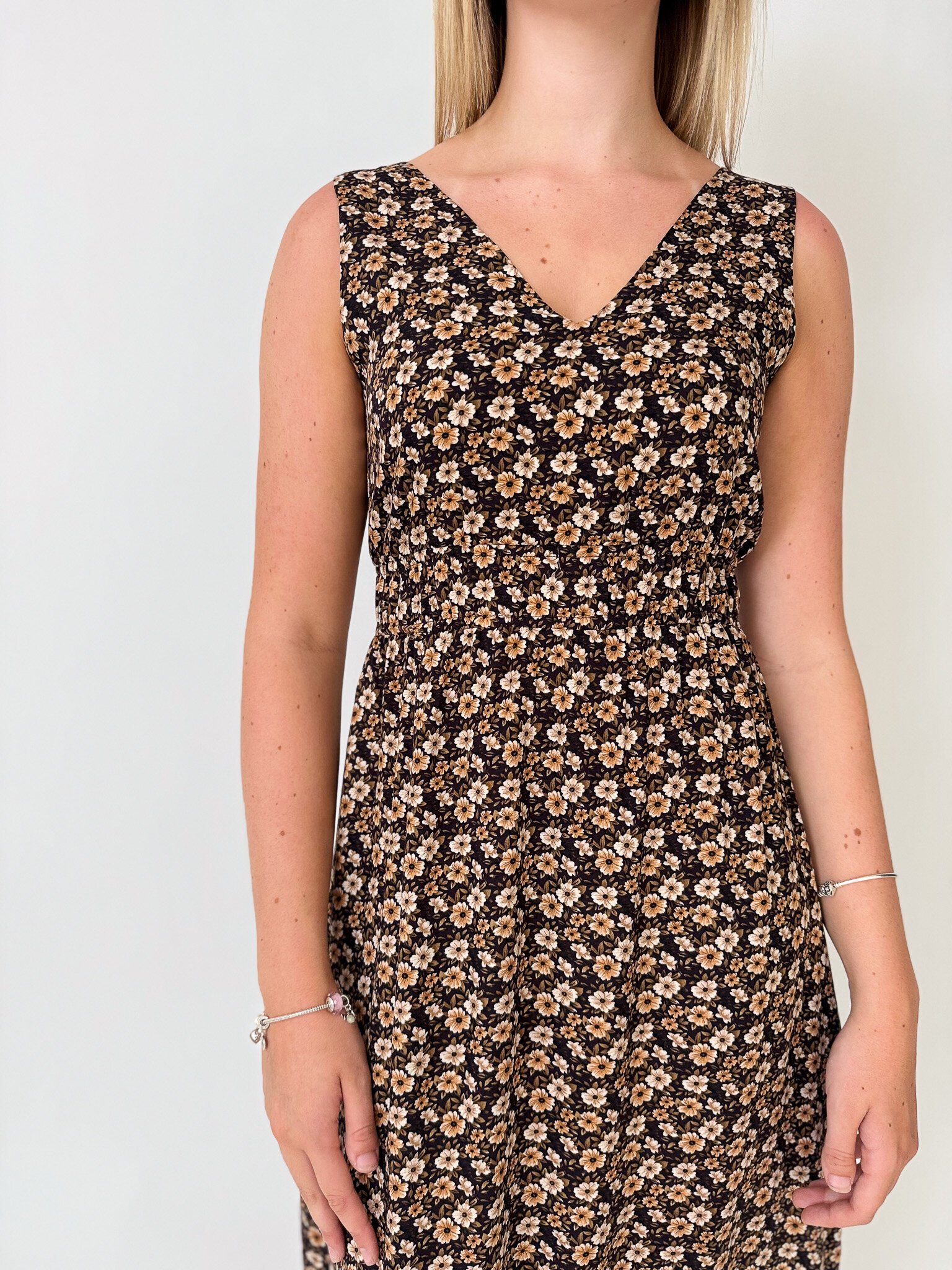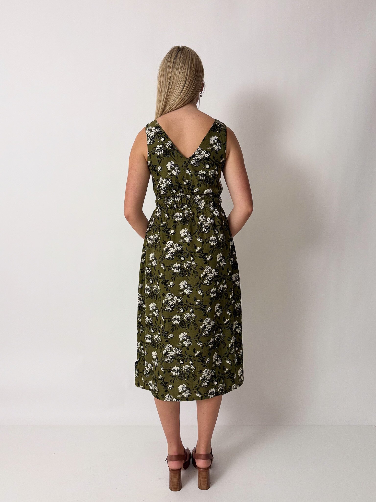 This sleeveless midi dress features an elasticated waist, pockets and is reversible!