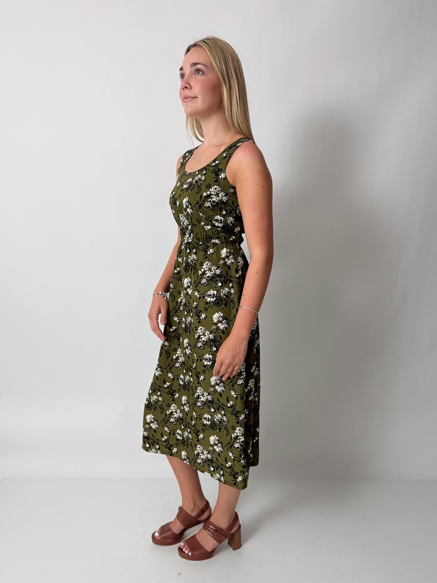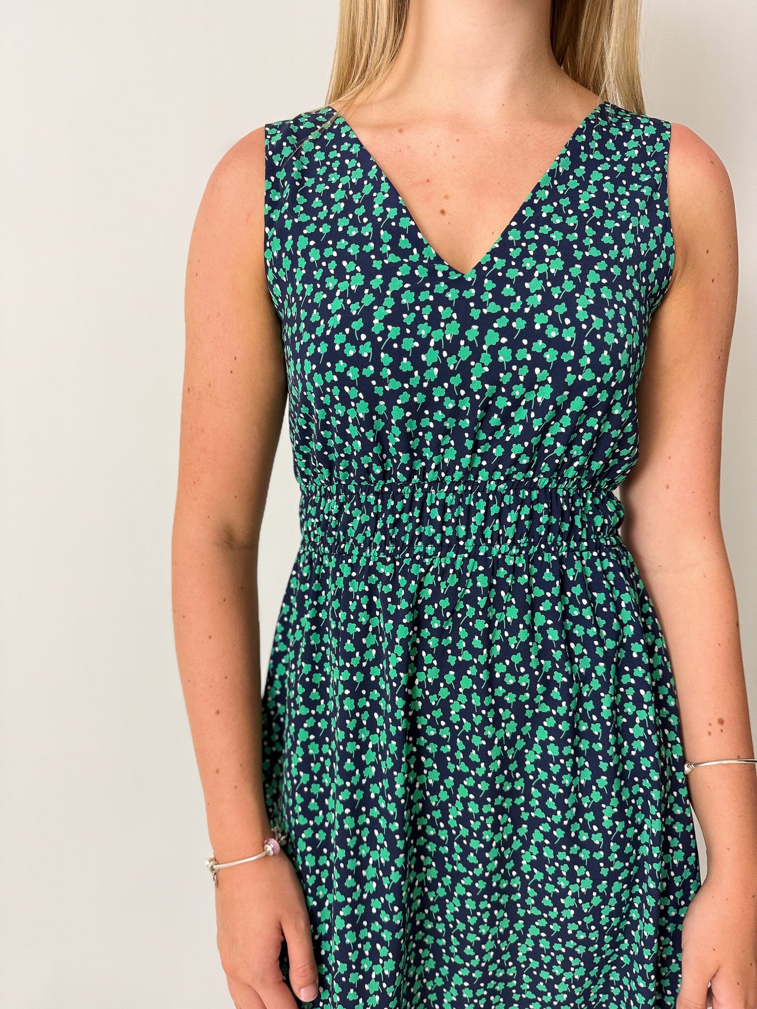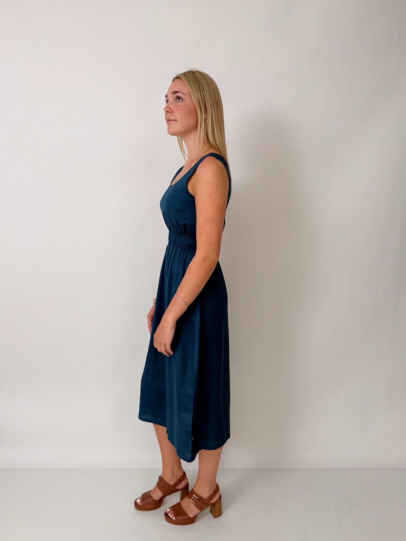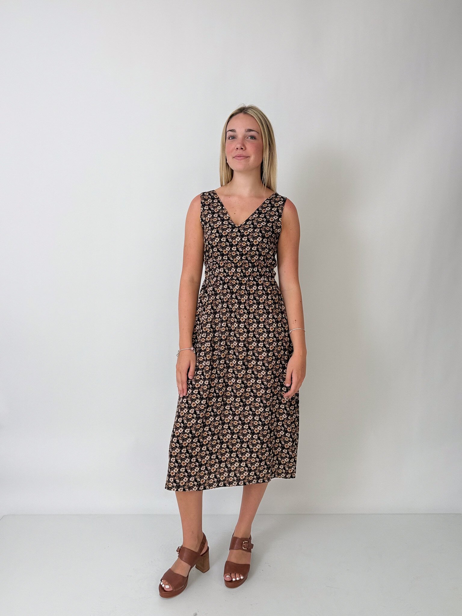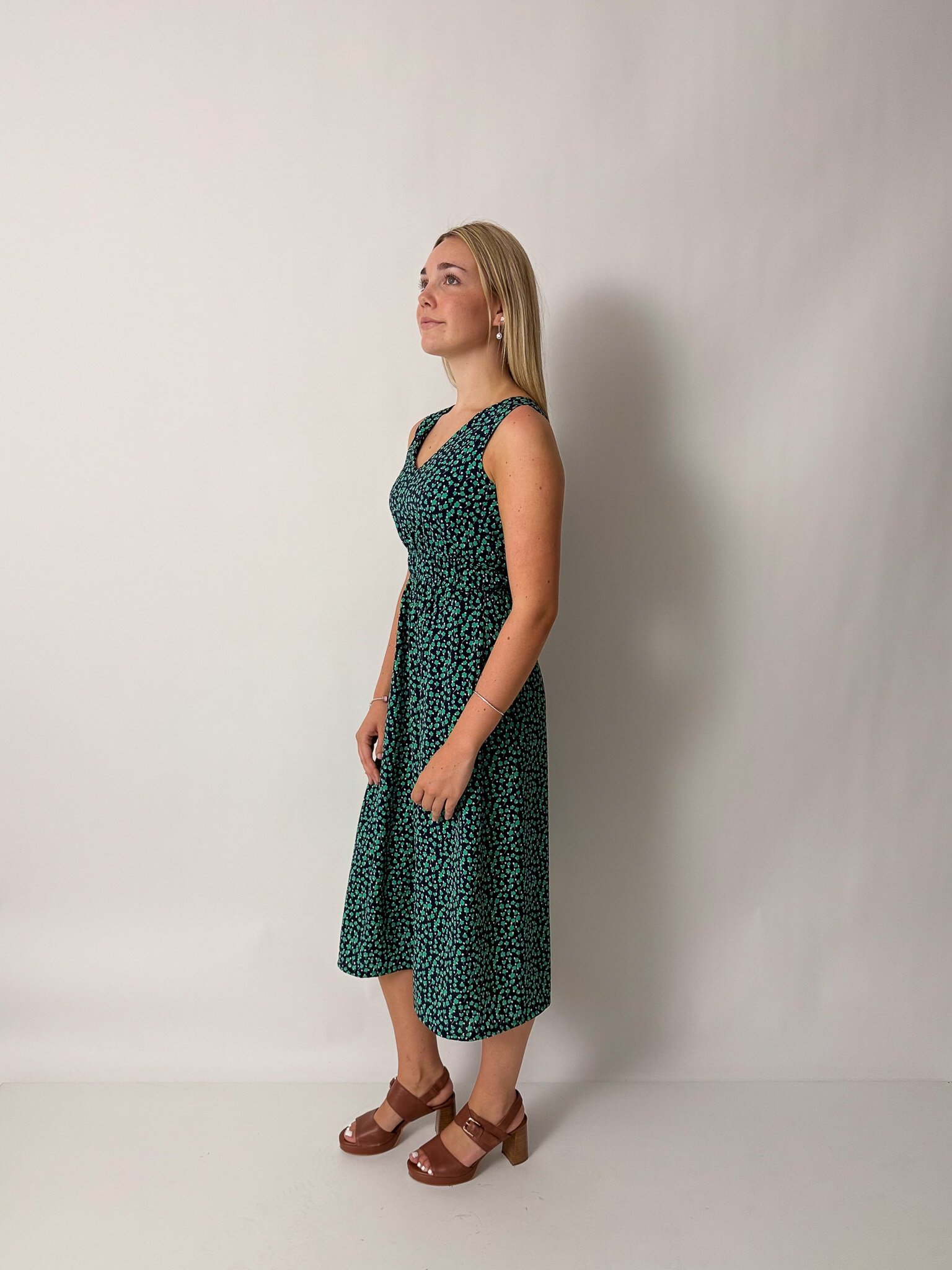 This sleeveless midi dress features an elasticated waist, pockets and is reversible!