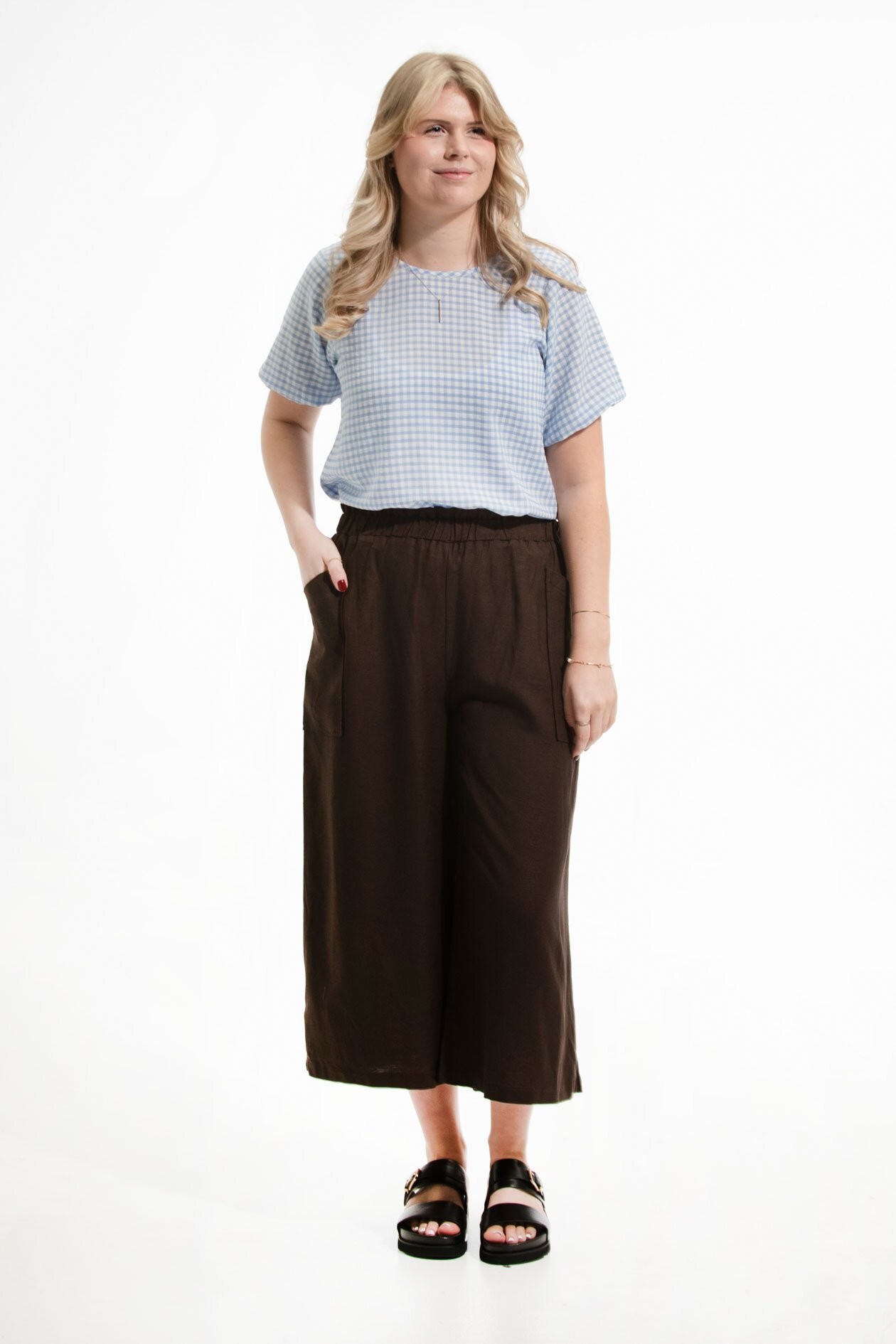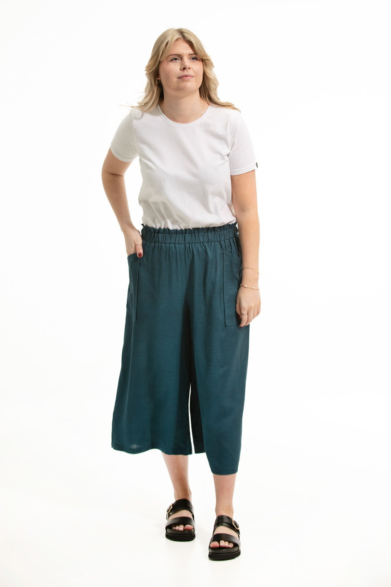 These drapey, 3/4 culottes are easy to pull on with an elasticated paper bag waist, they feature wide legs, patch pockets and side splits at the hem.