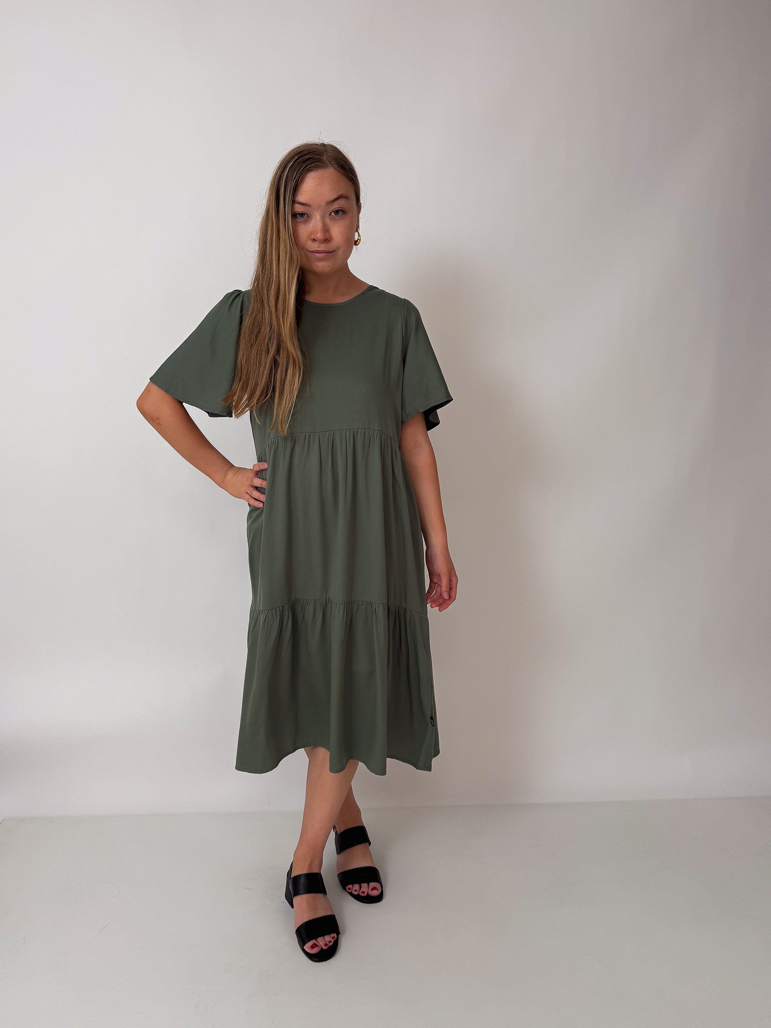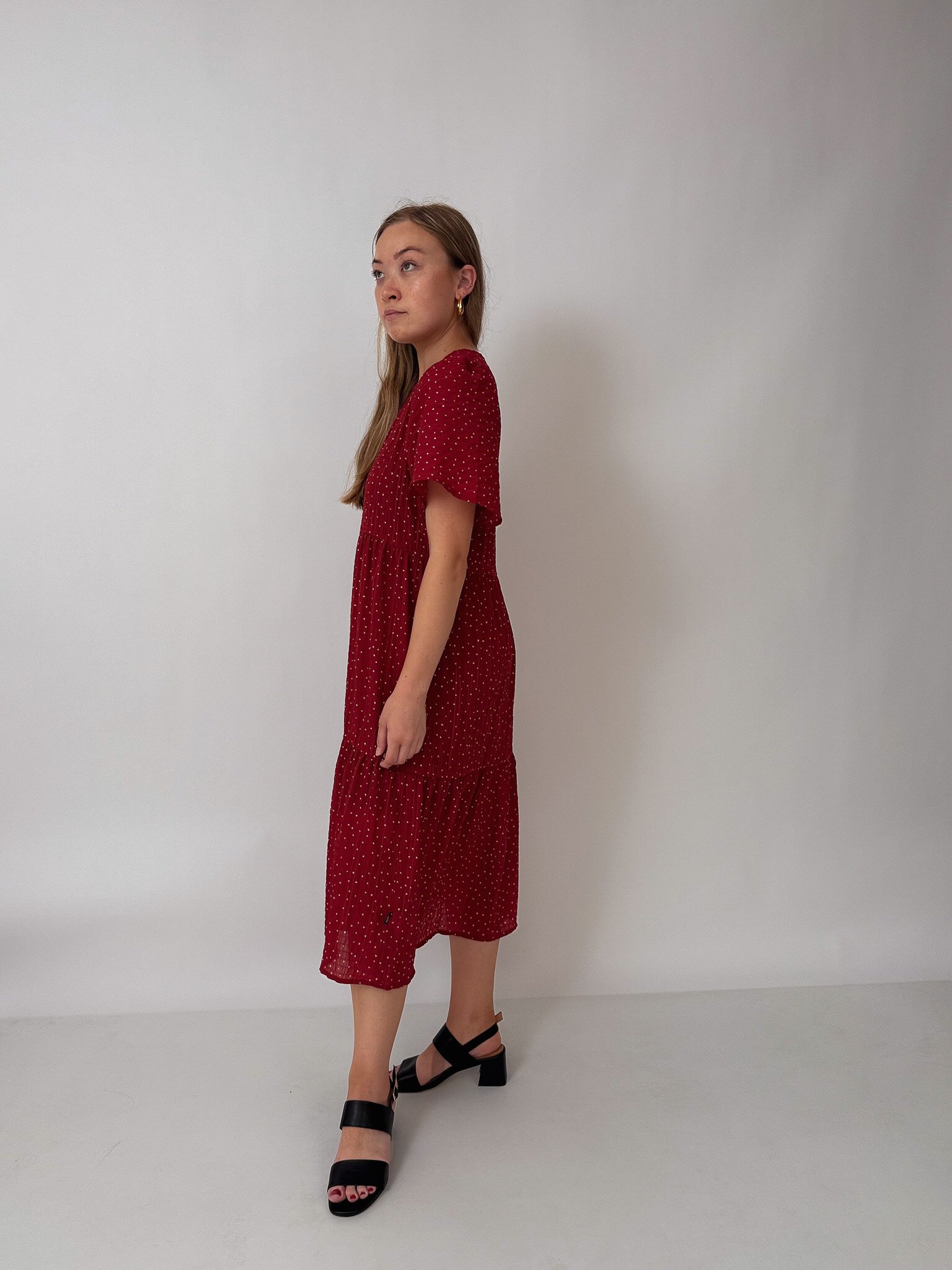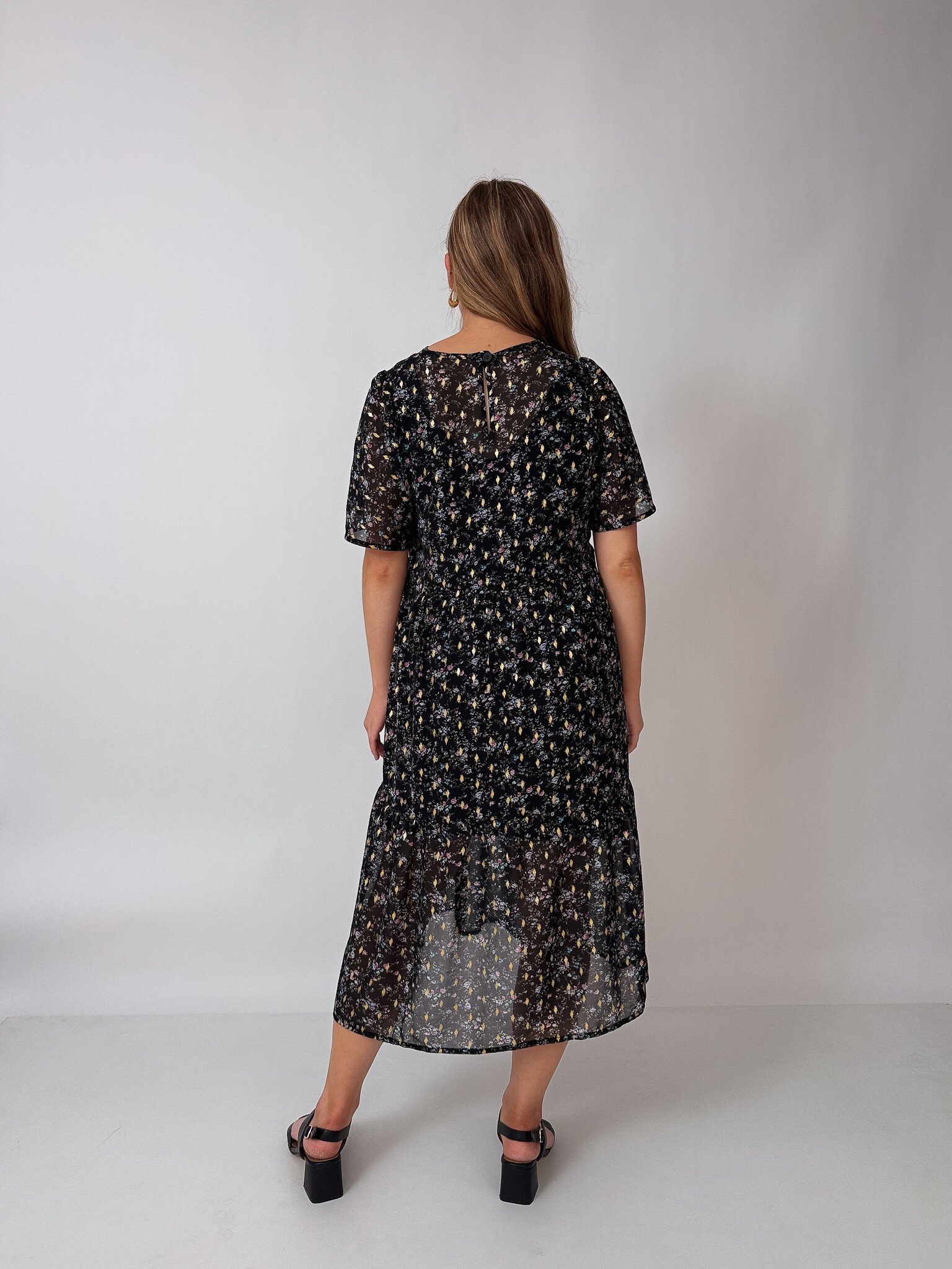 This midi-length dress features a gathered tiered skirt, a round neckline with a keyhole button for closure at the back. Louise is a short sleeve style with gathering at the shoulder.