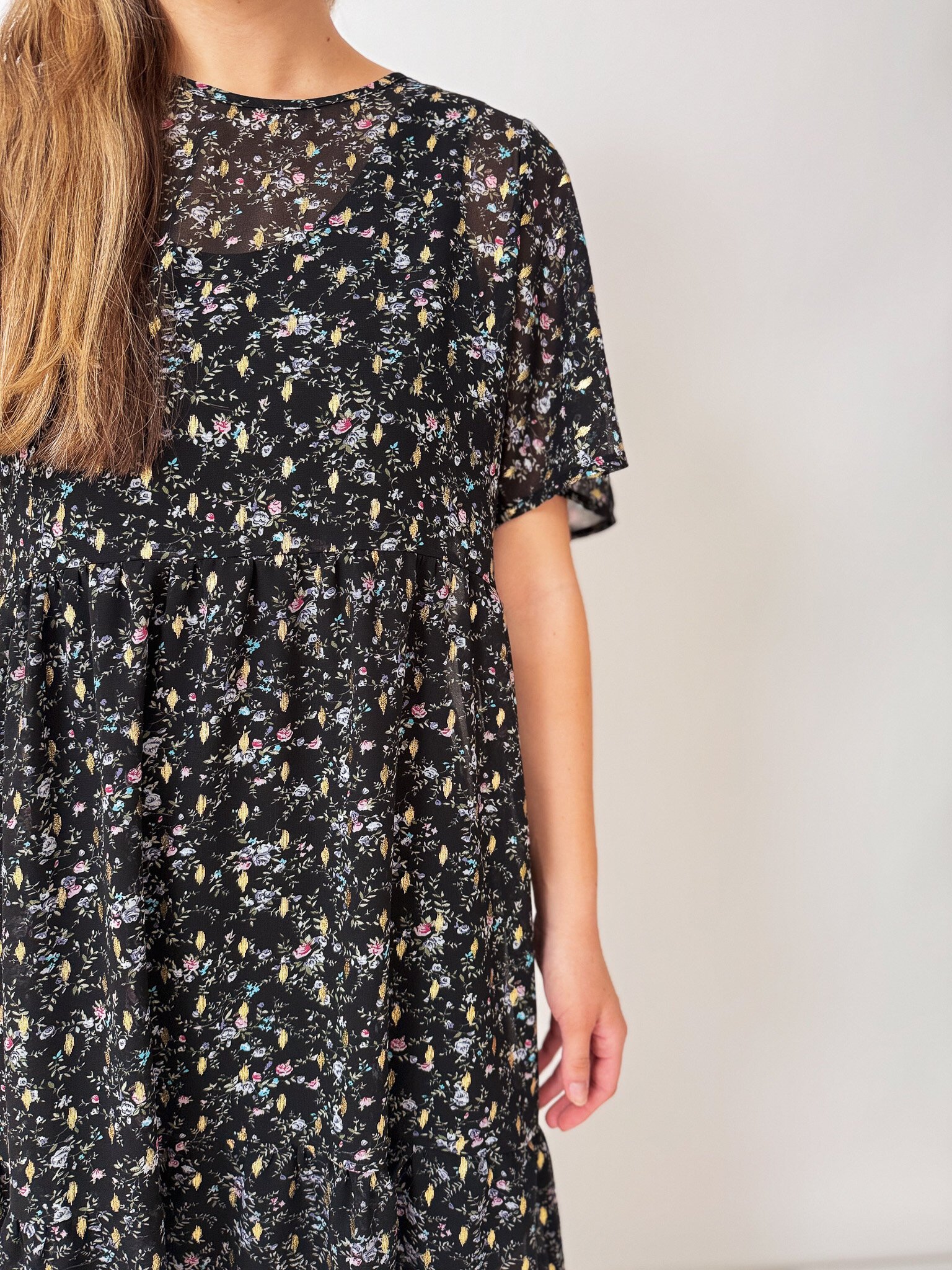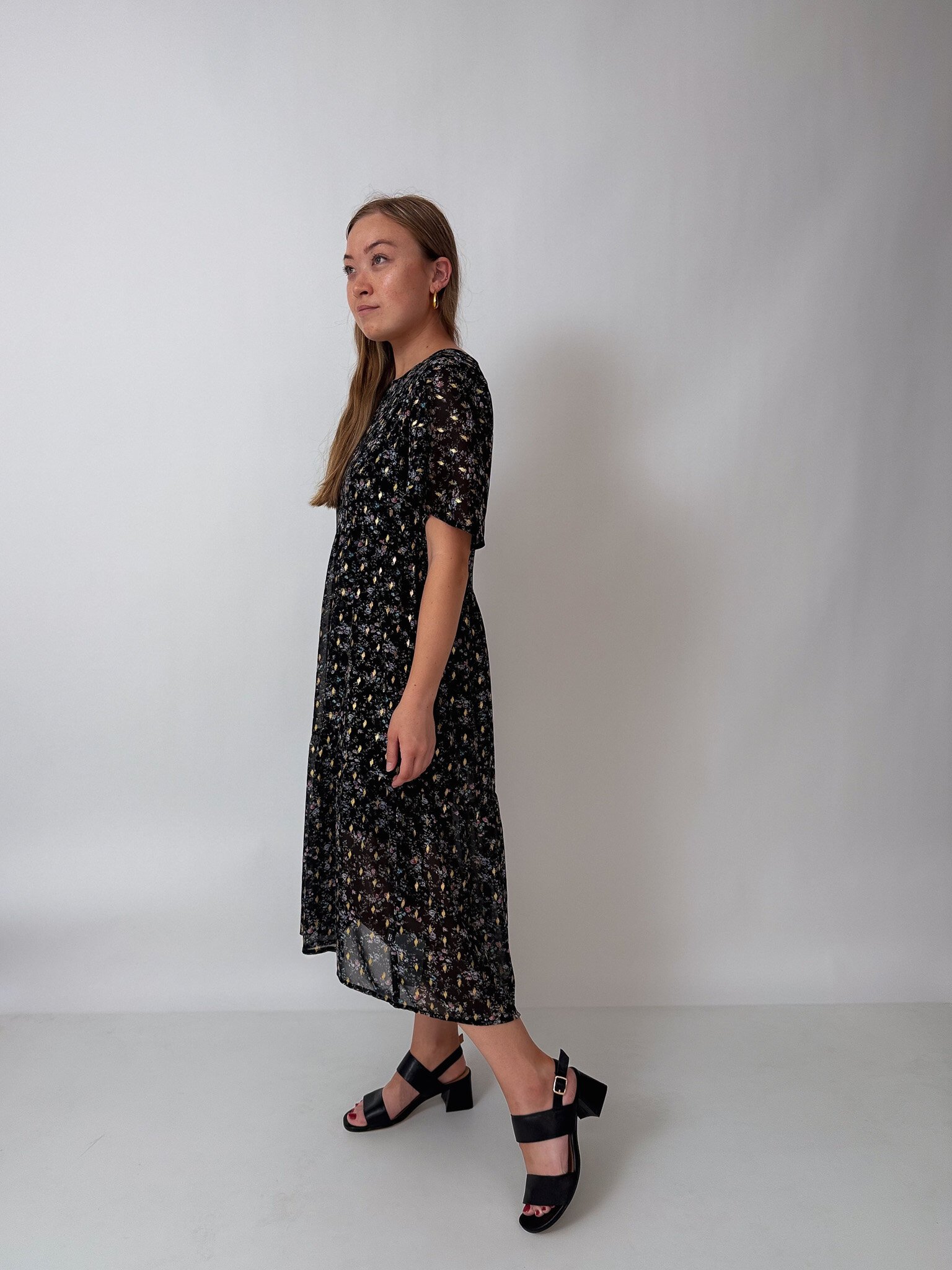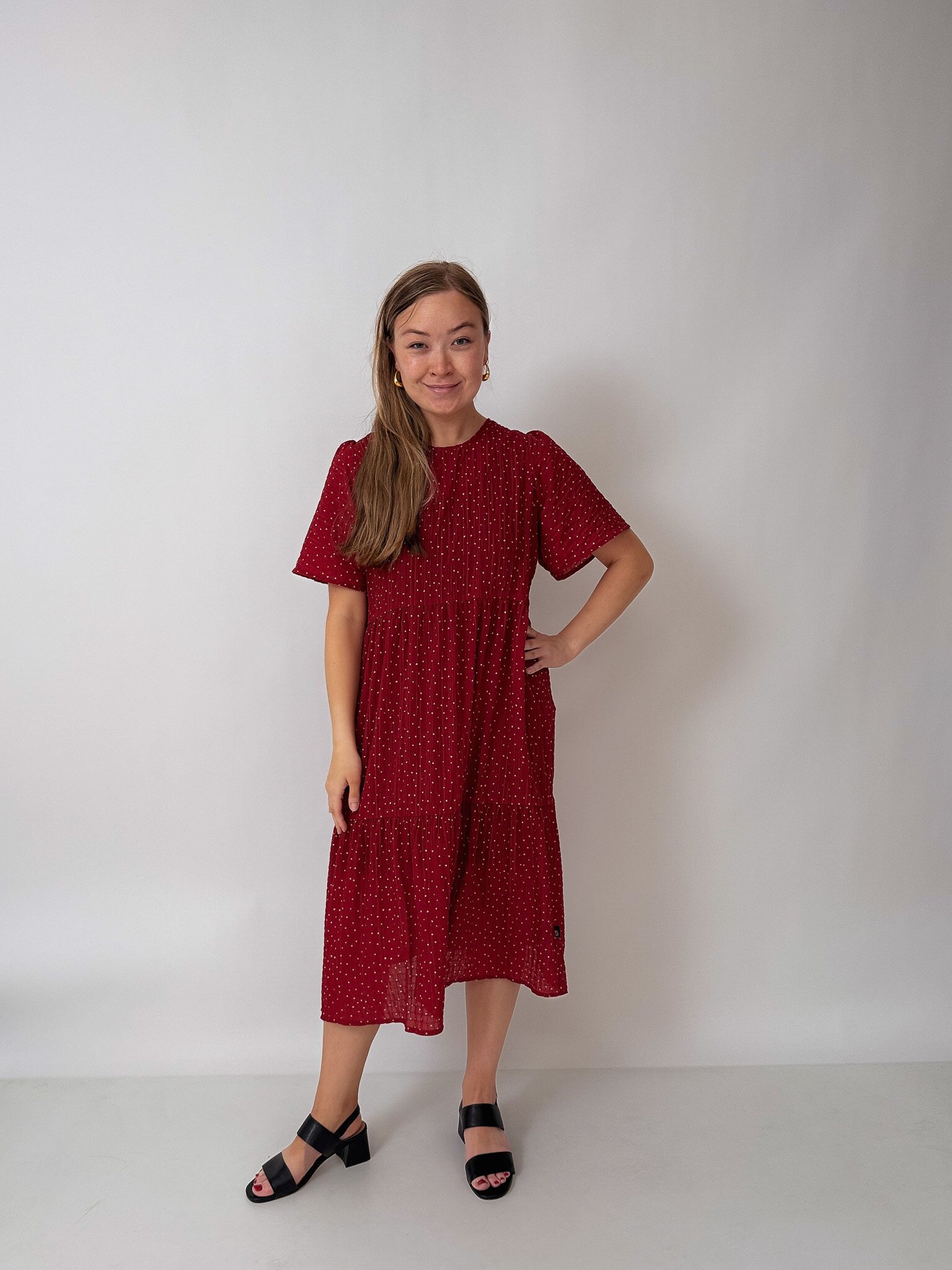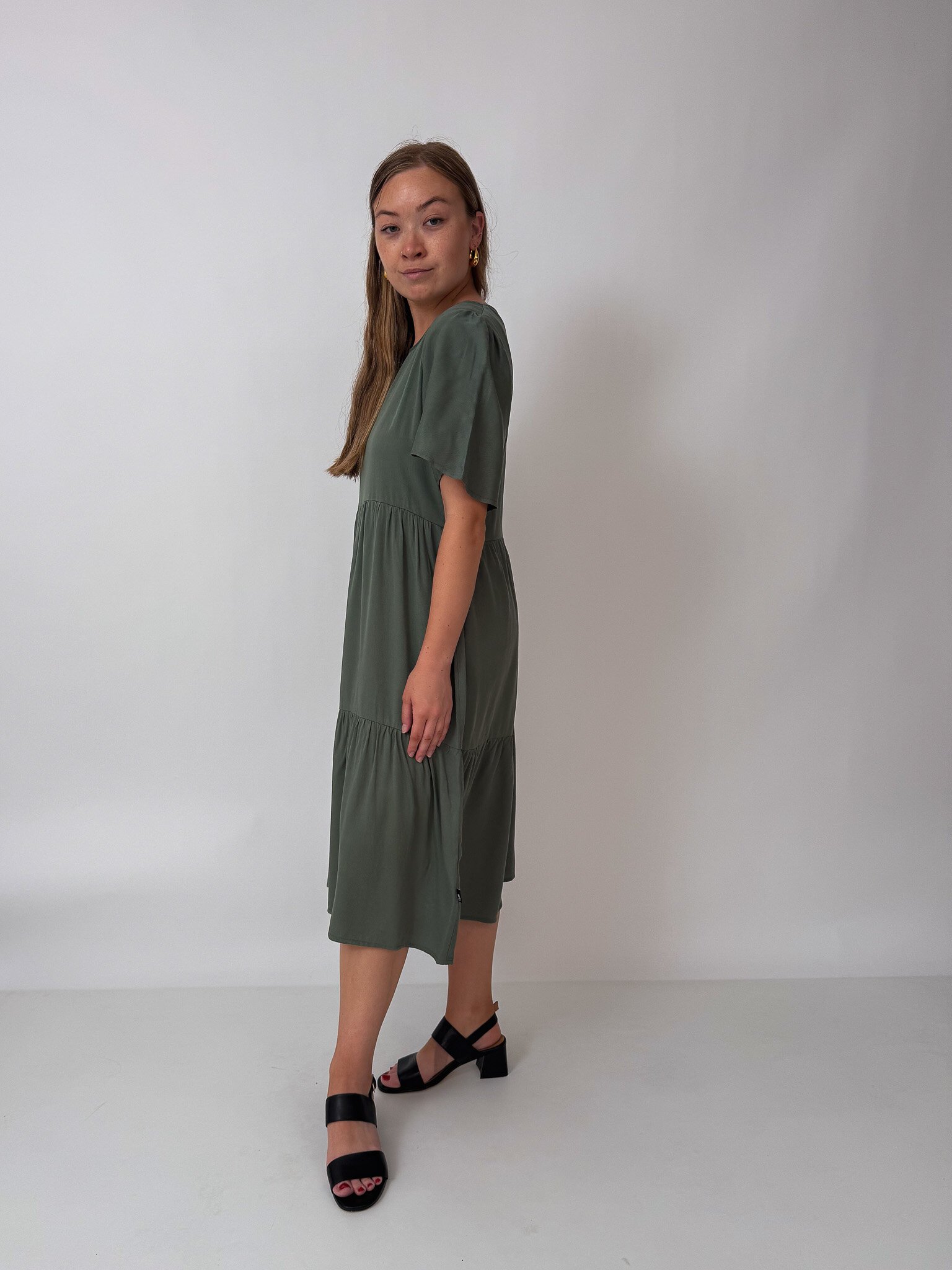 This midi-length dress features a gathered tiered skirt, a round neckline with a keyhole button for closure at the back. Louise is a short sleeve style with gathering at the shoulder.