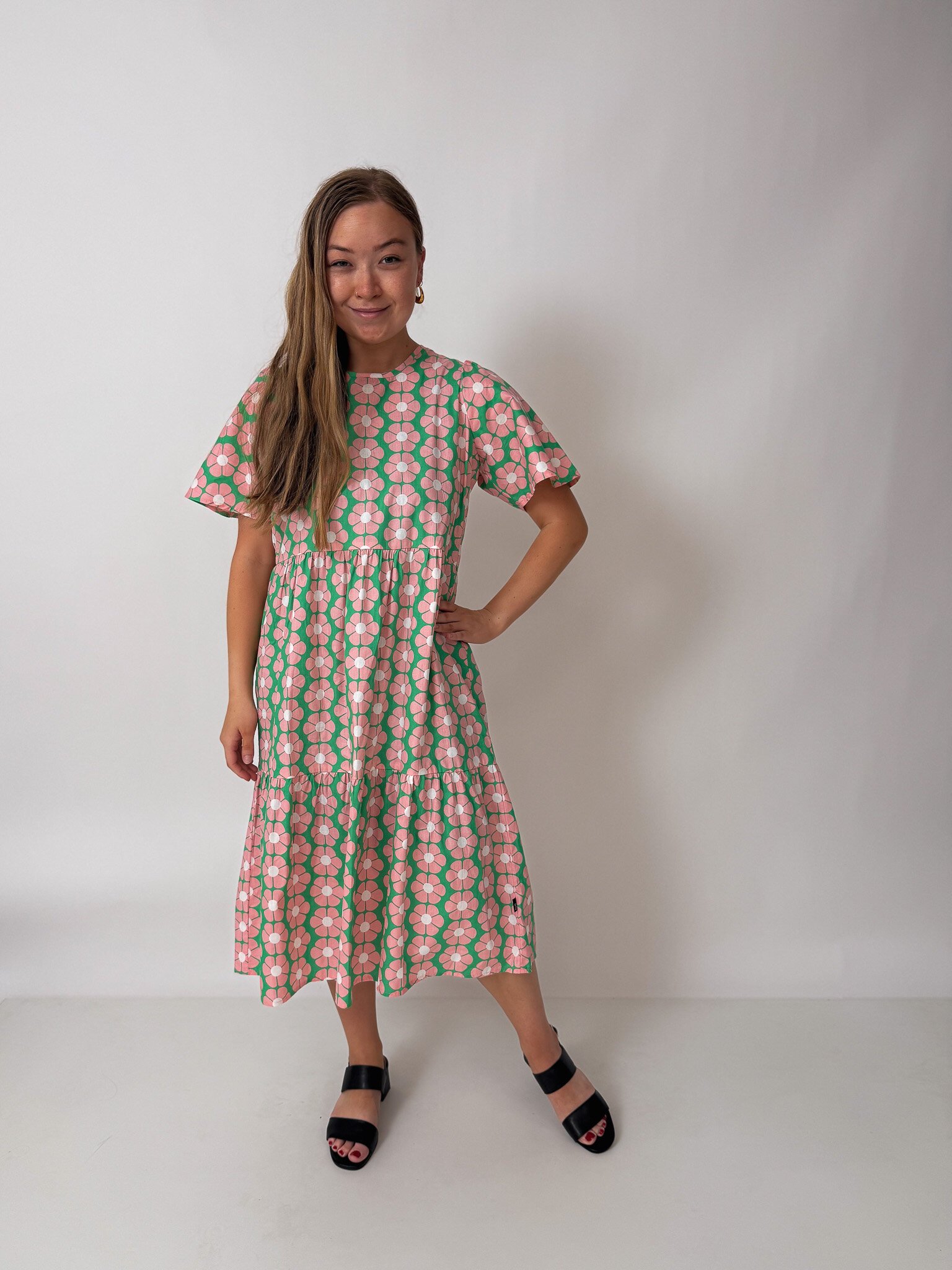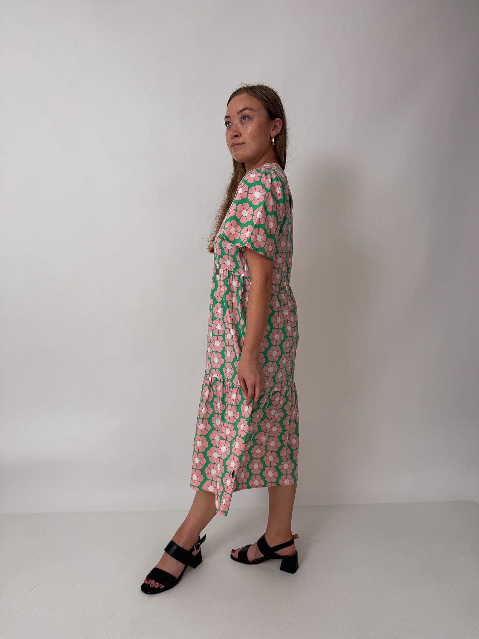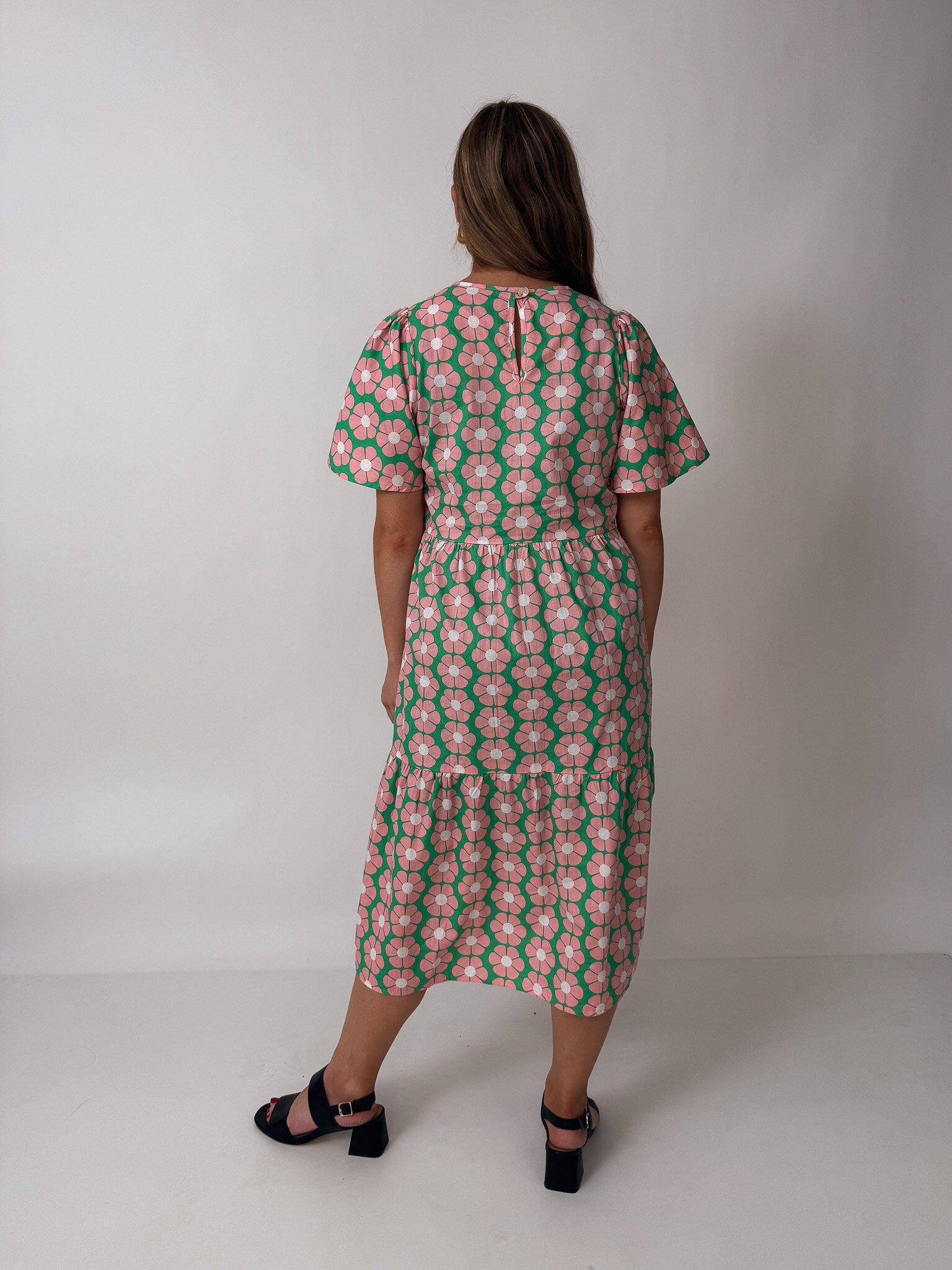 This midi-length dress features a gathered tiered skirt, a round neckline with a keyhole button for closure at the back. Louise is a short sleeve style with gathering at the shoulder.