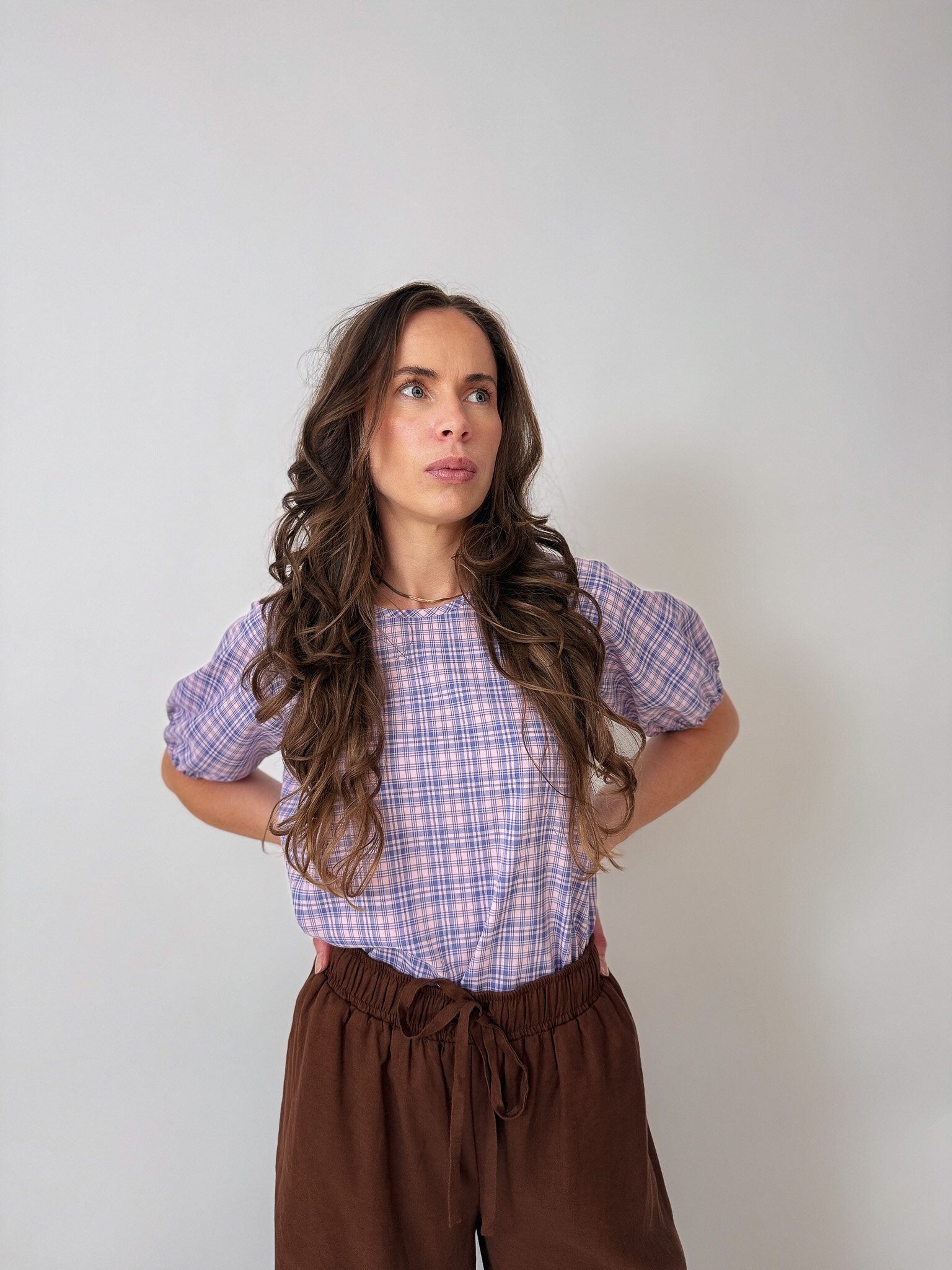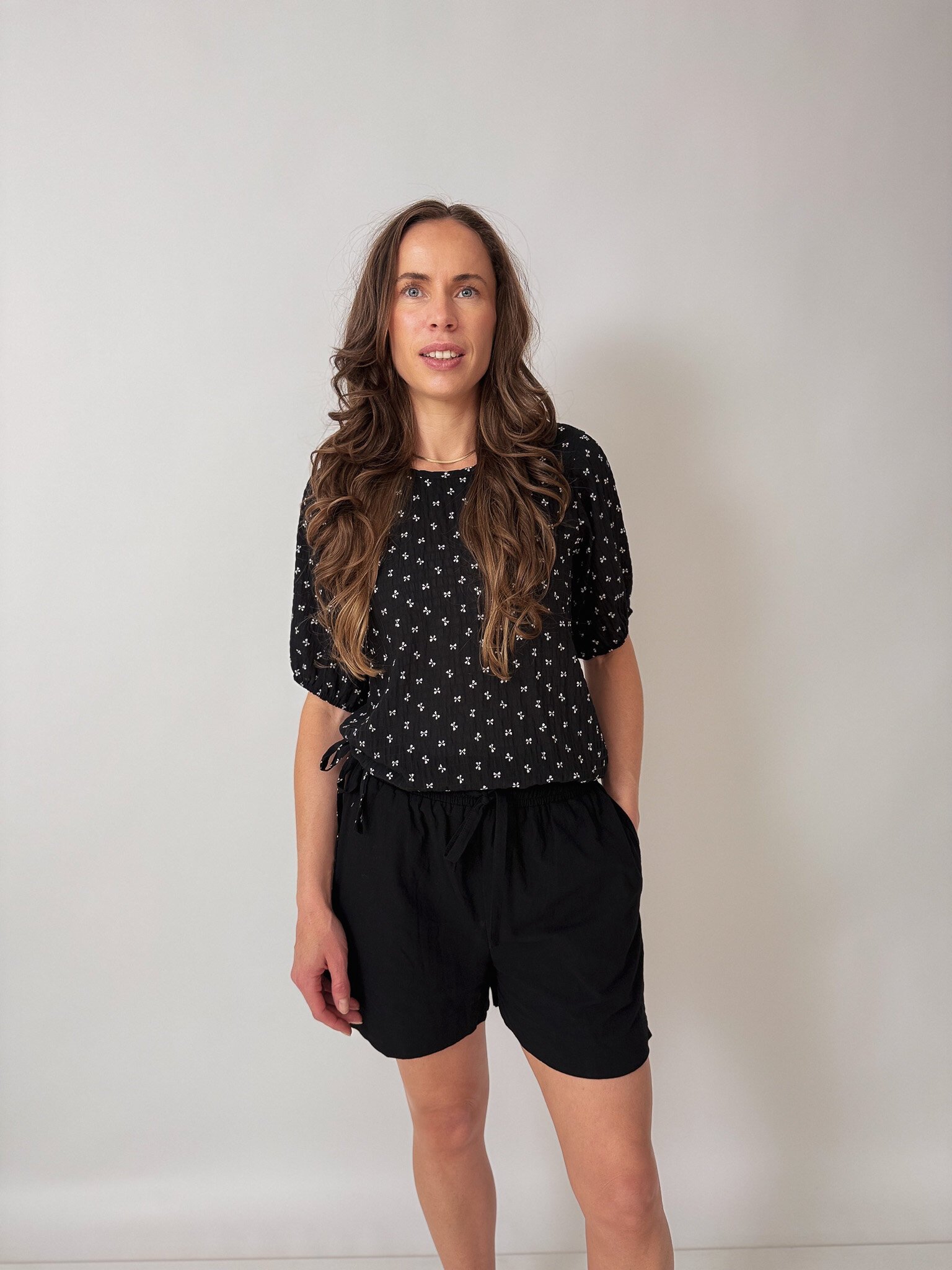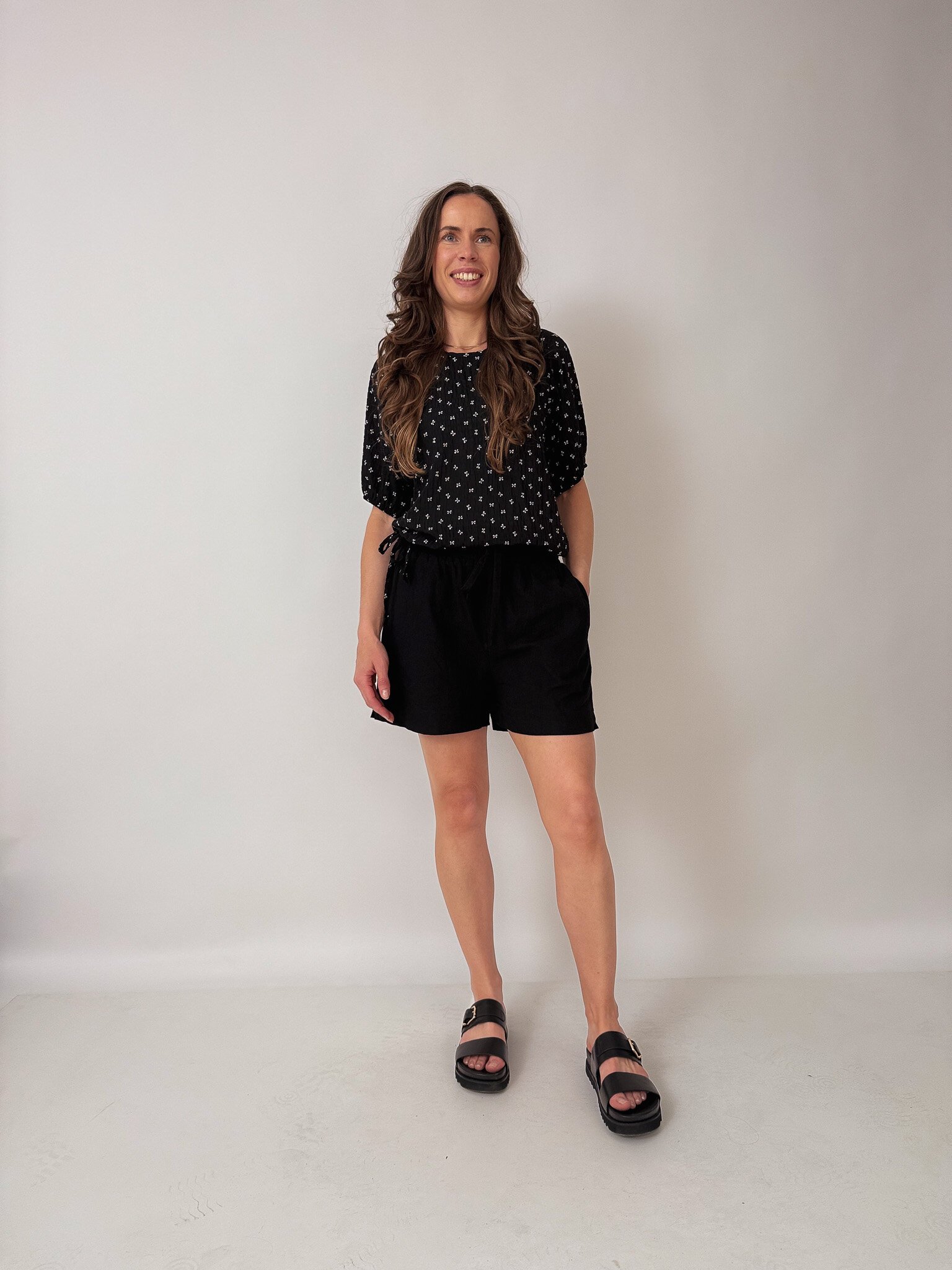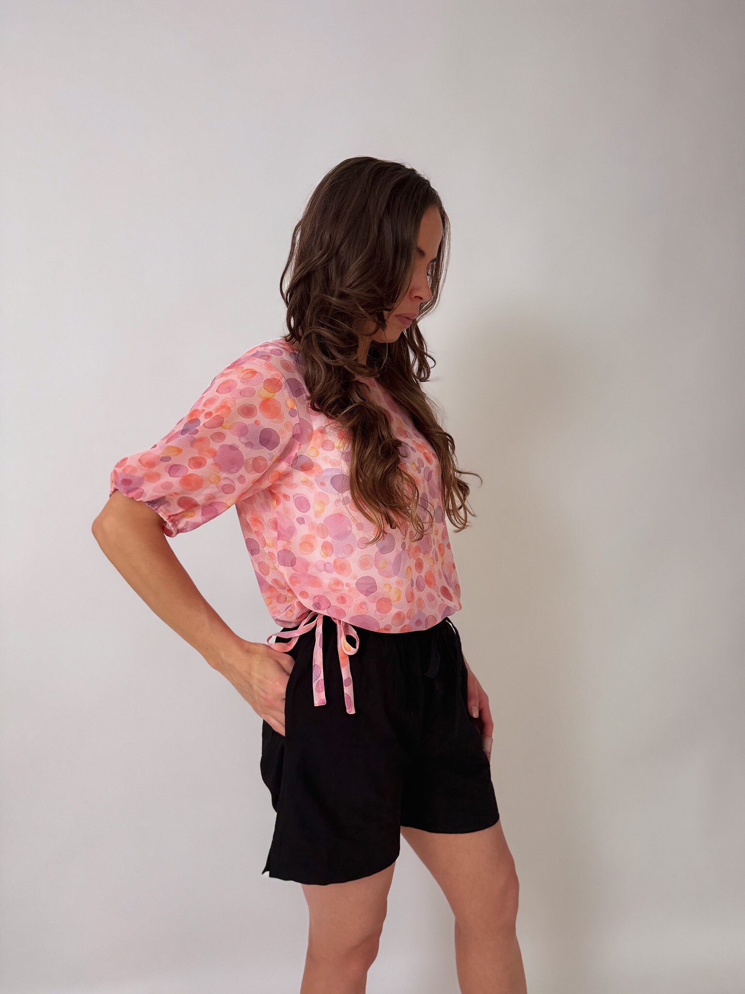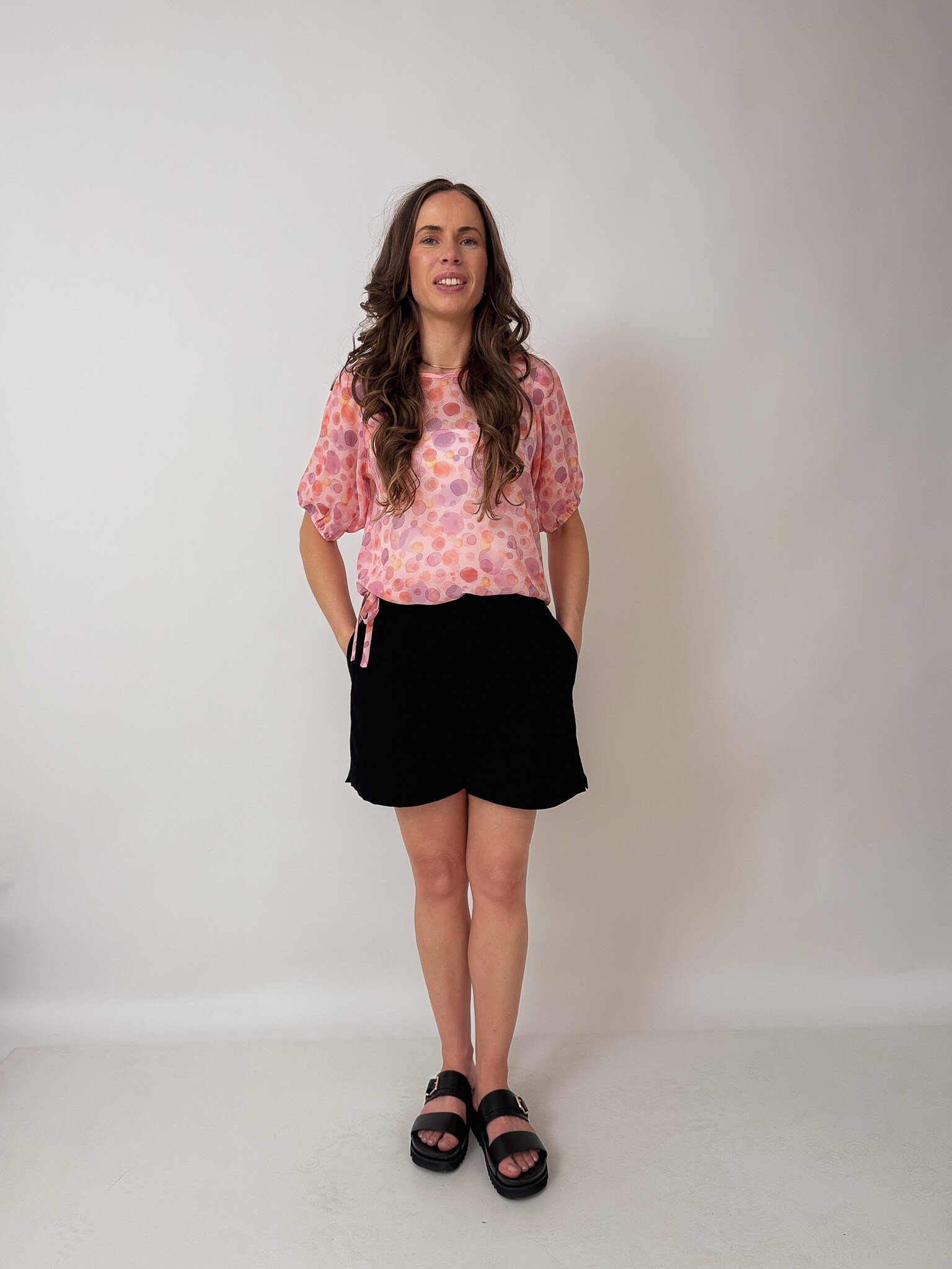 This loose-style top drapes beautifully and features a drawstring hem to tighten and tie into a bow or leave out for a looser fit. With elasticated sleeves to push up and 'puff ' or leave down. This top is of course a reversible style, wear with a round neck to the front or flip Maggie around for a v-neck option.