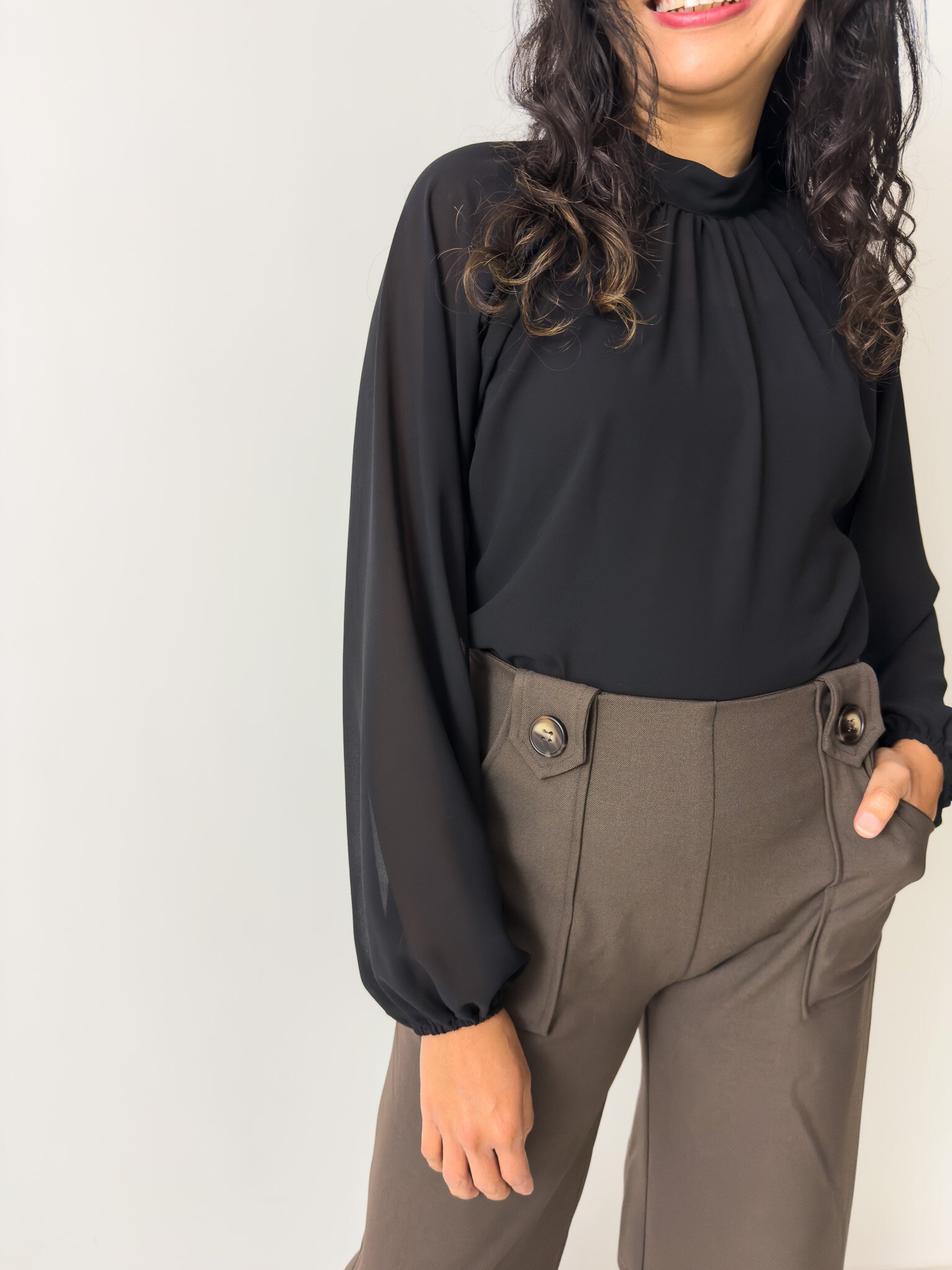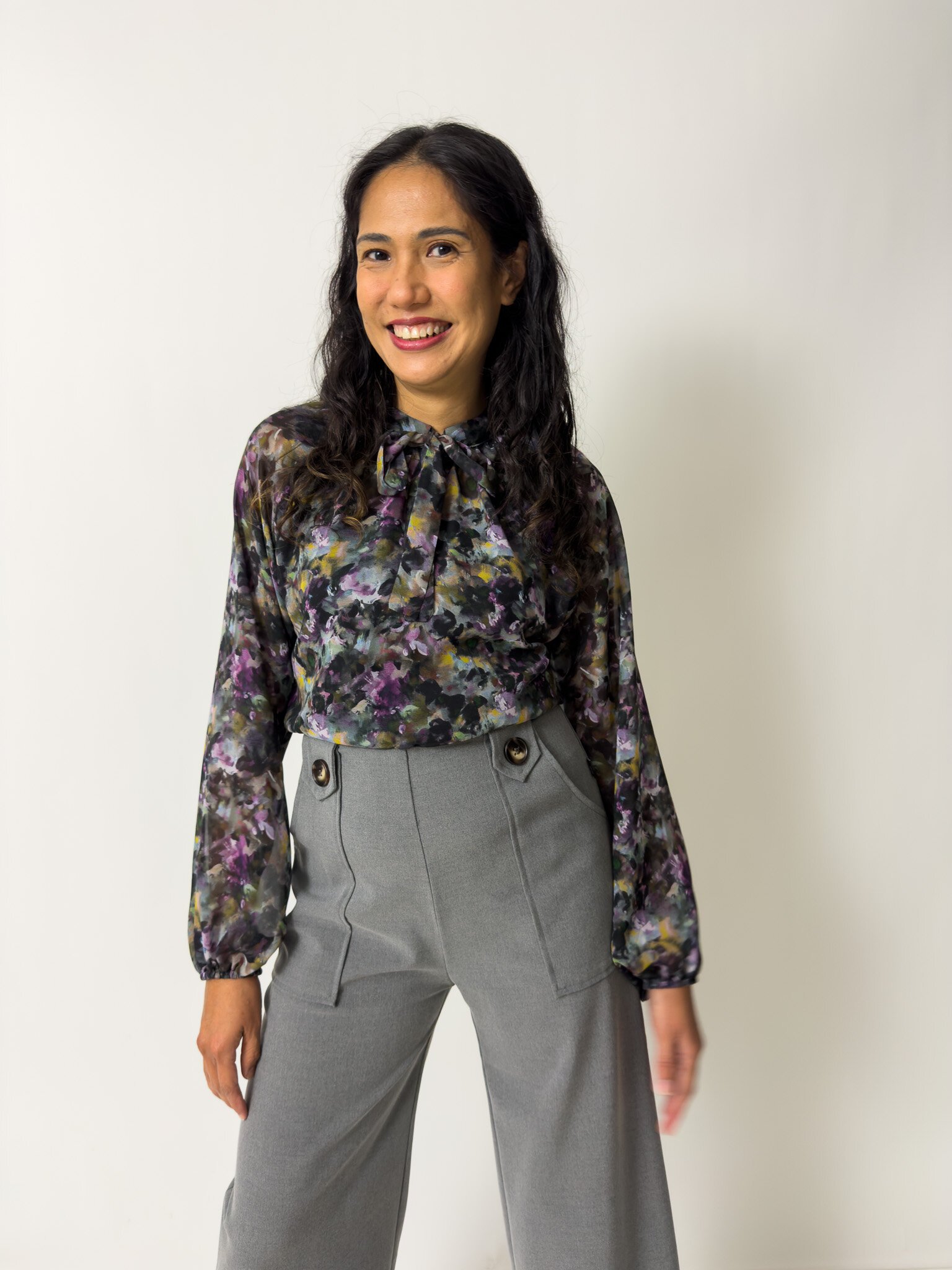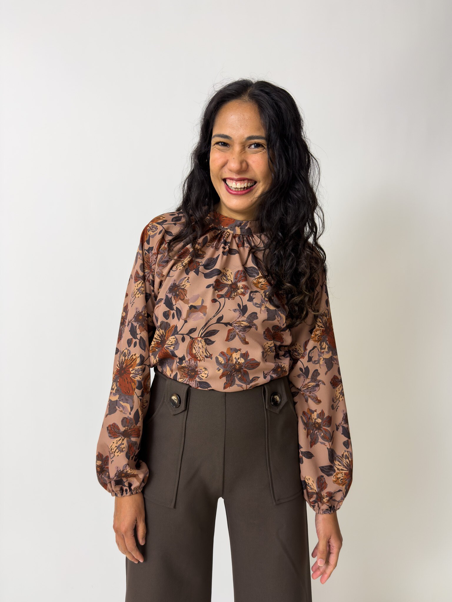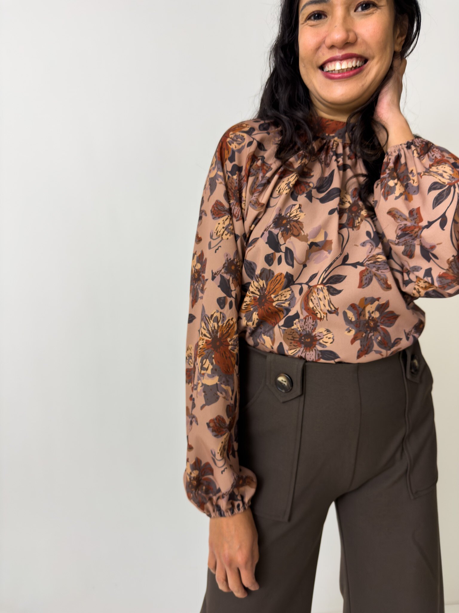 This reversible blouse features a gather neck with a collar and keyhole neck tie, raglan sleeves and elastic cuffs.