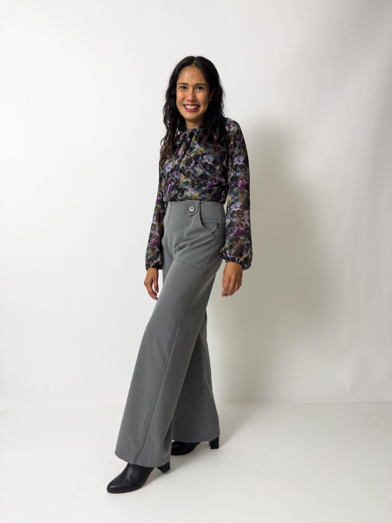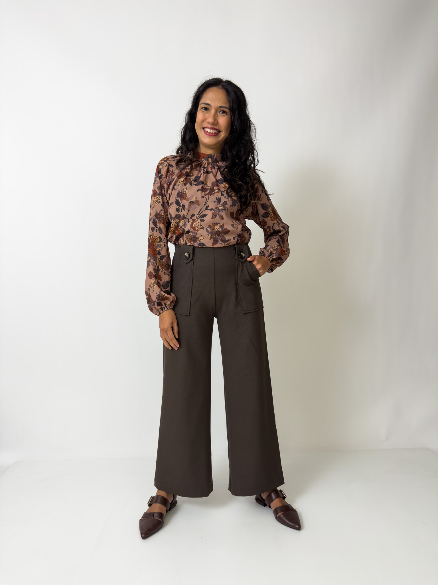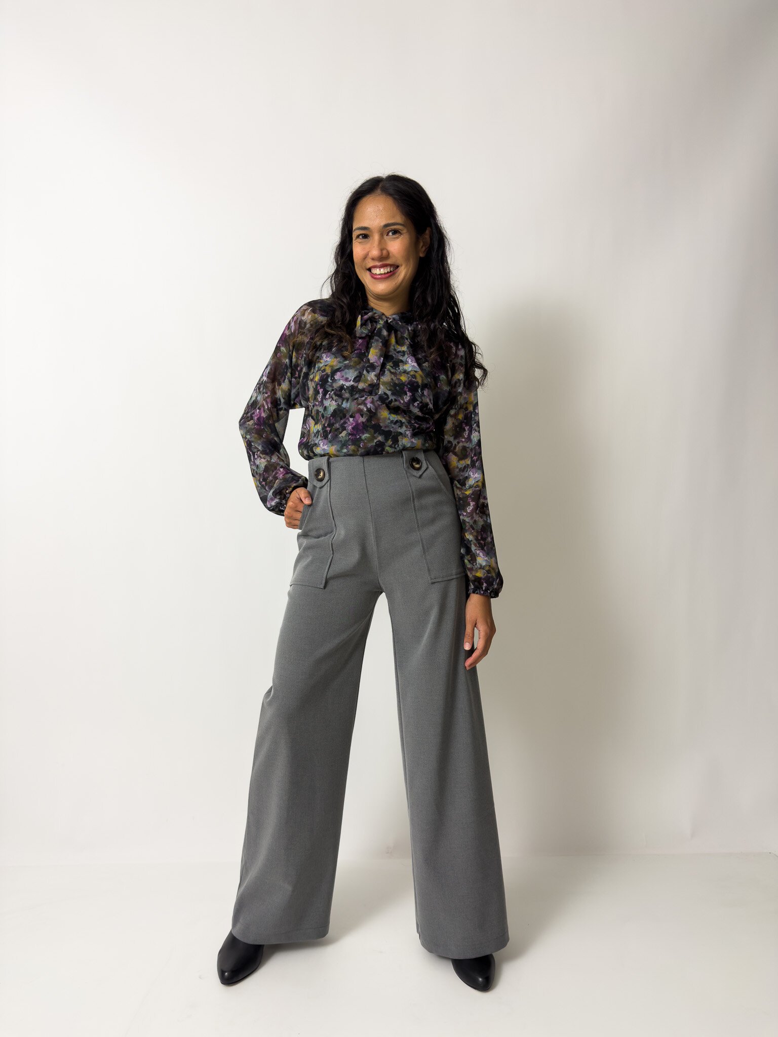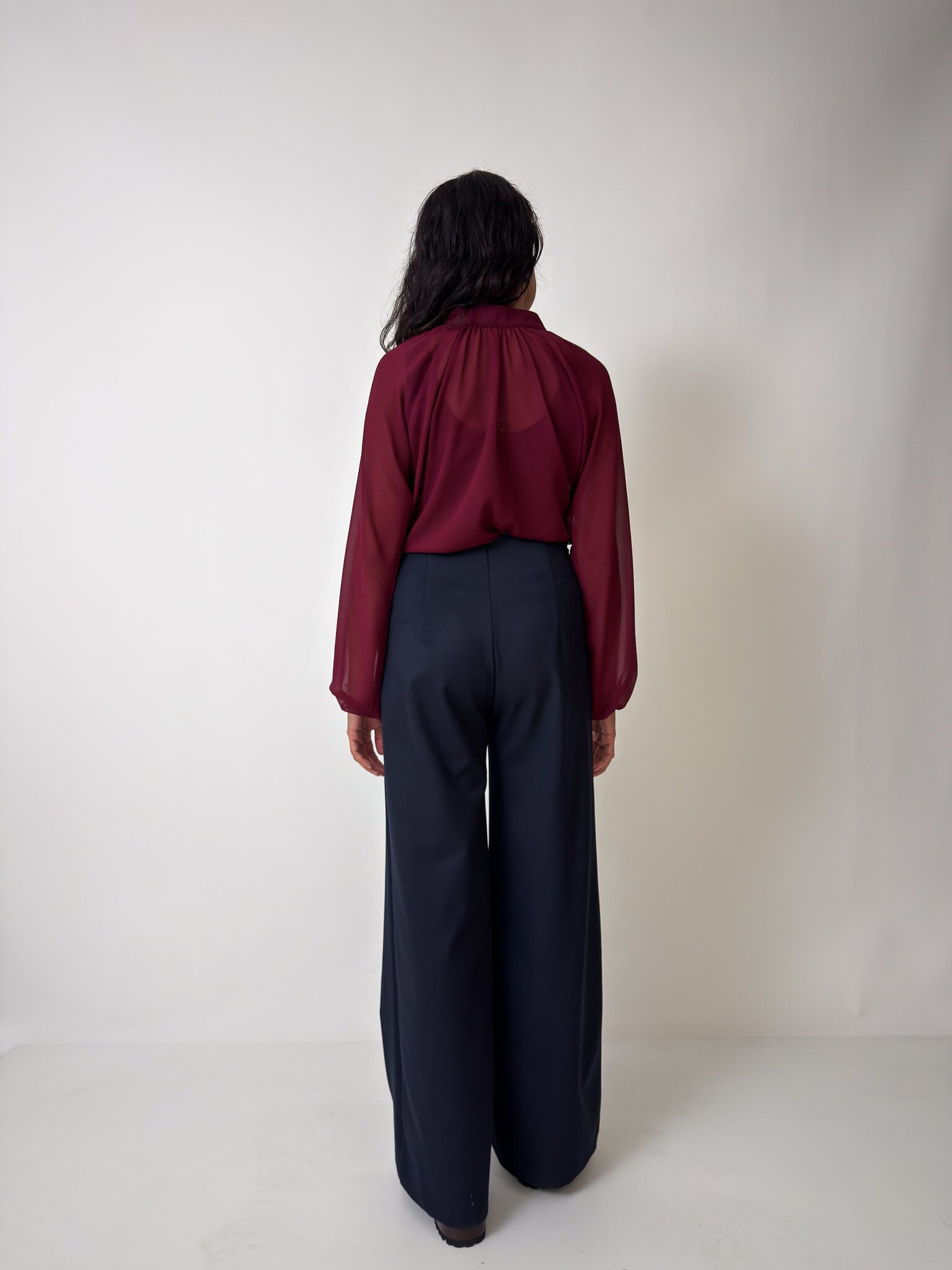 This reversible blouse features a gather neck with a collar and keyhole neck tie, raglan sleeves and elastic cuffs.