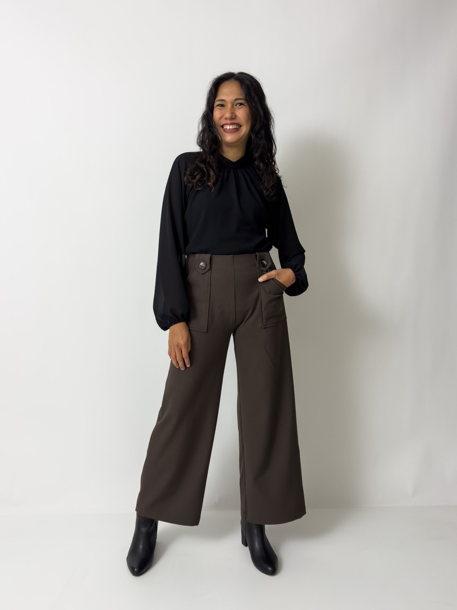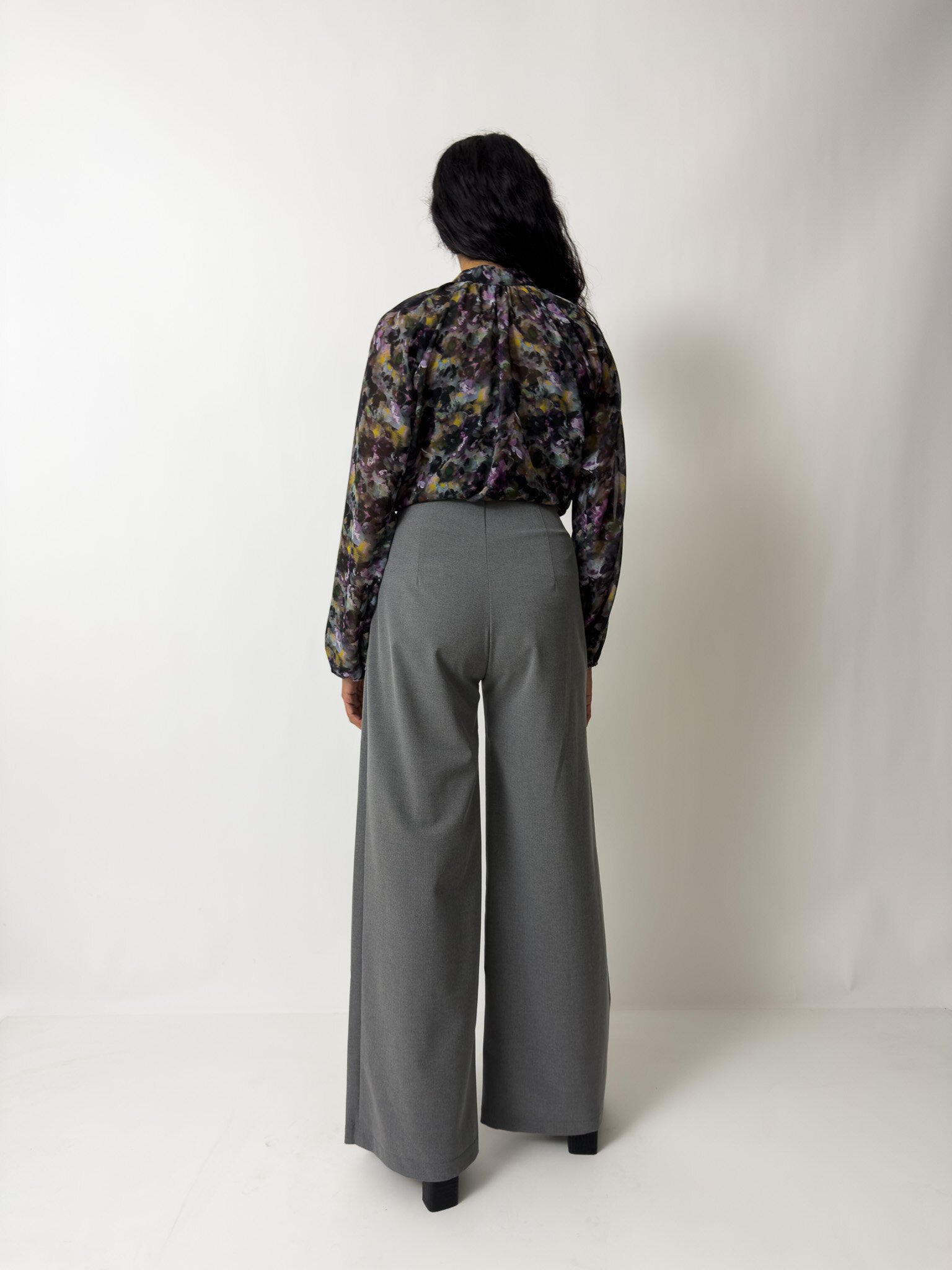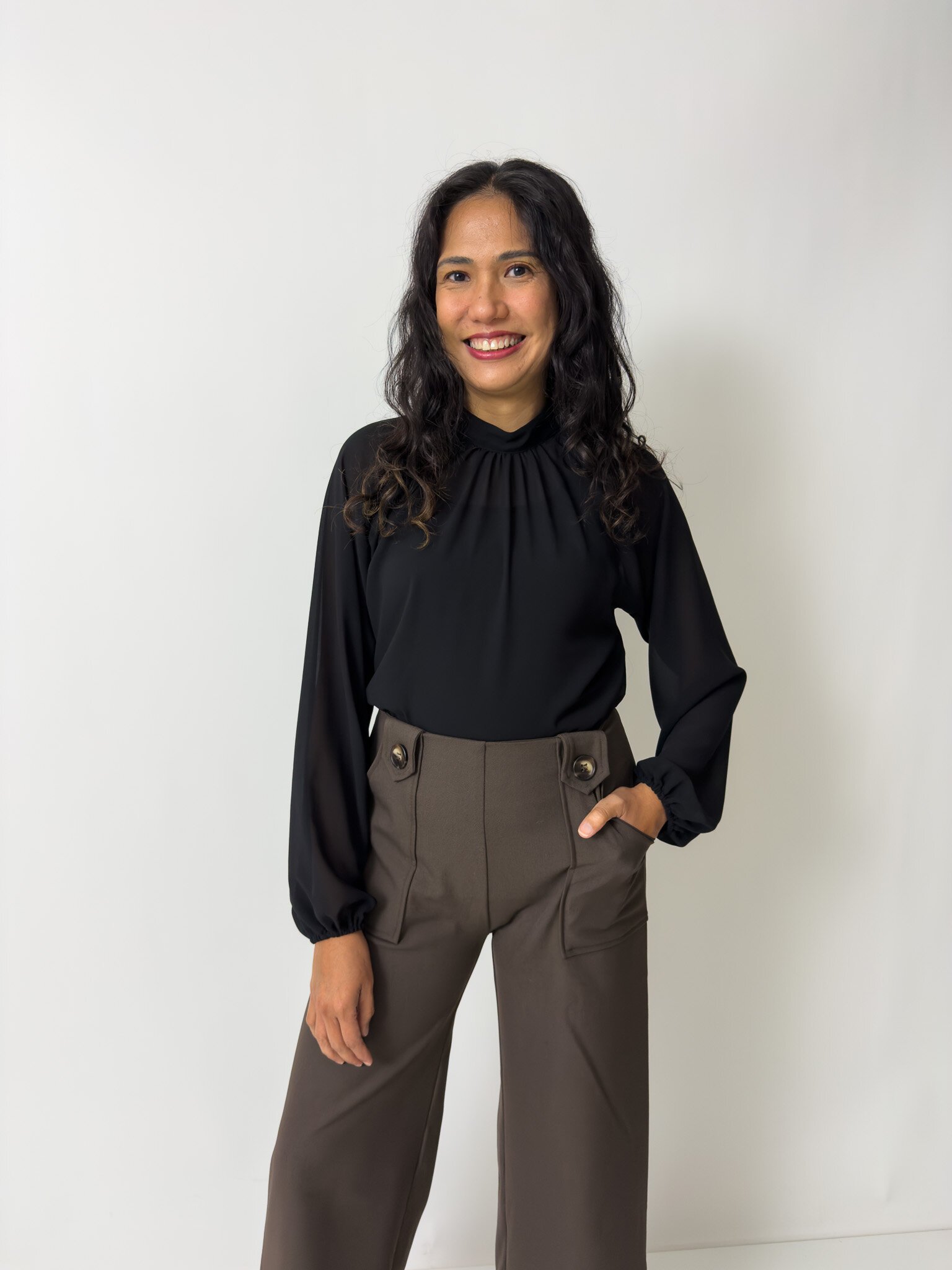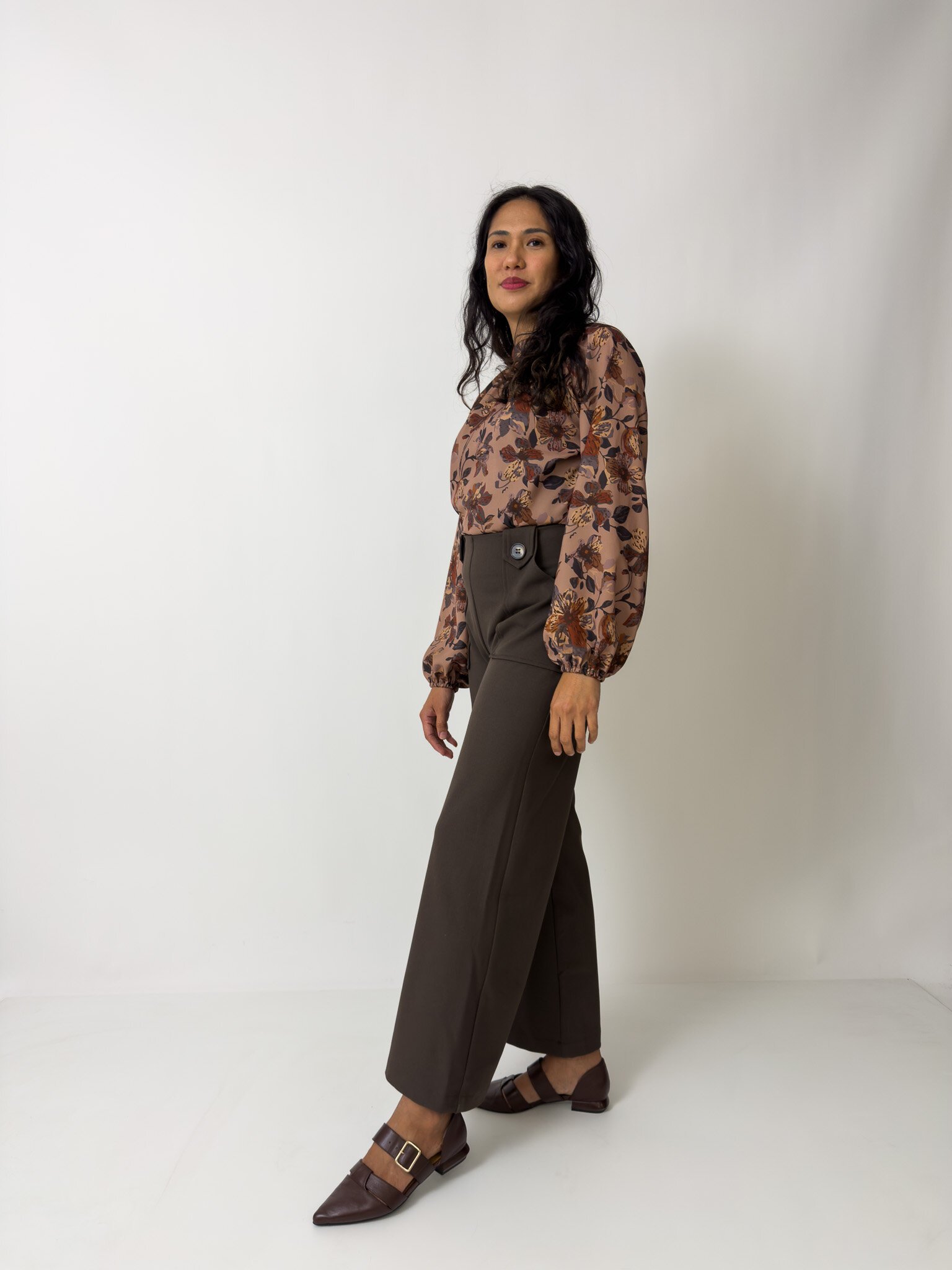 This reversible blouse features a gather neck with a collar and keyhole neck tie, raglan sleeves and elastic cuffs.