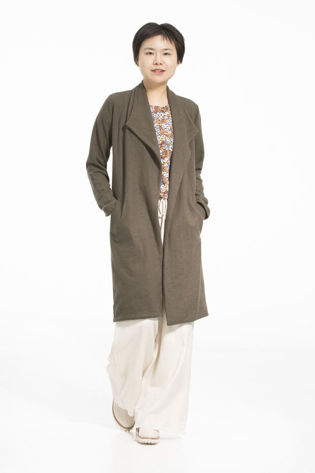 Olivia is a longline cardi with welt pockets and a shawl collar.