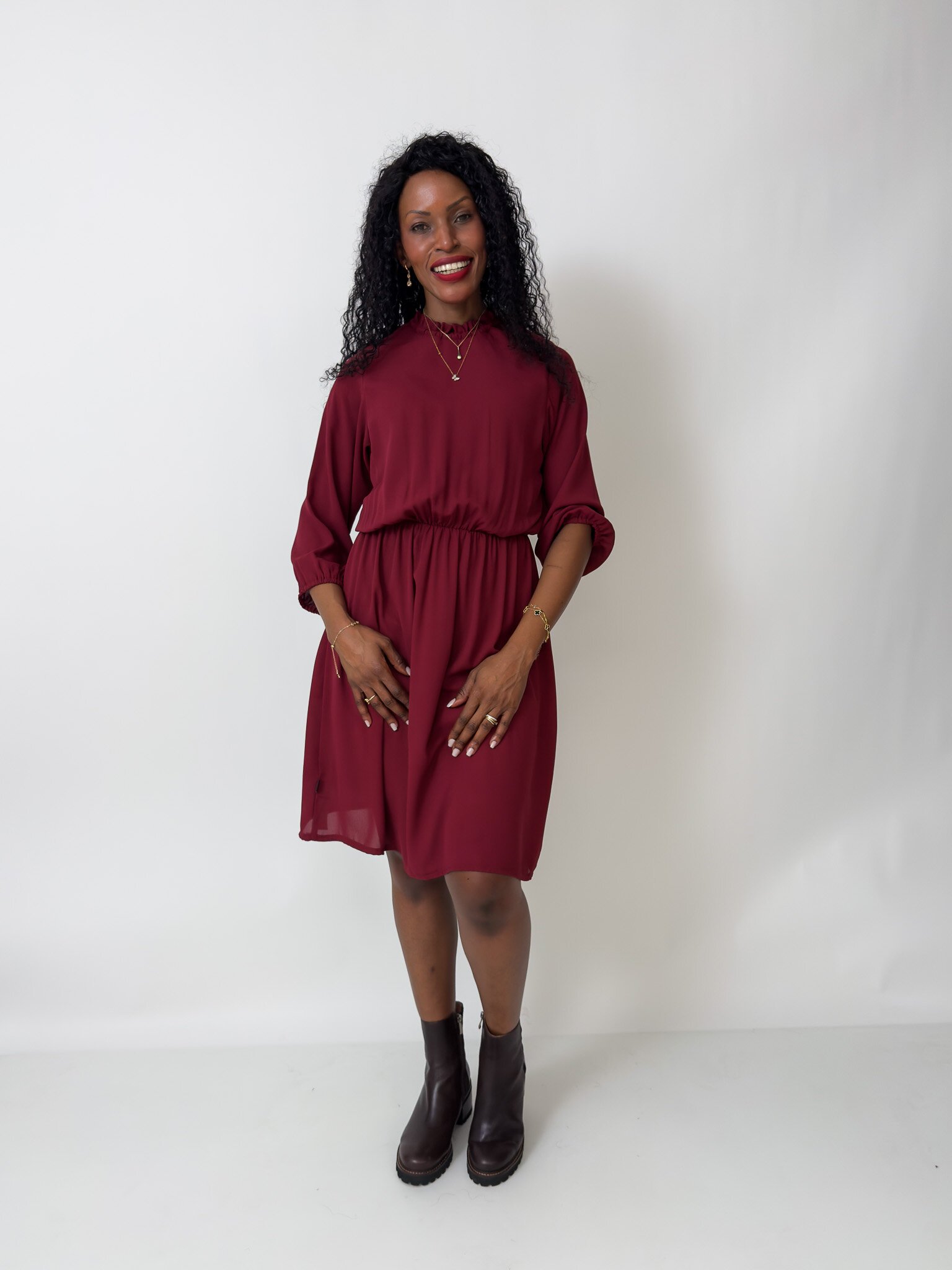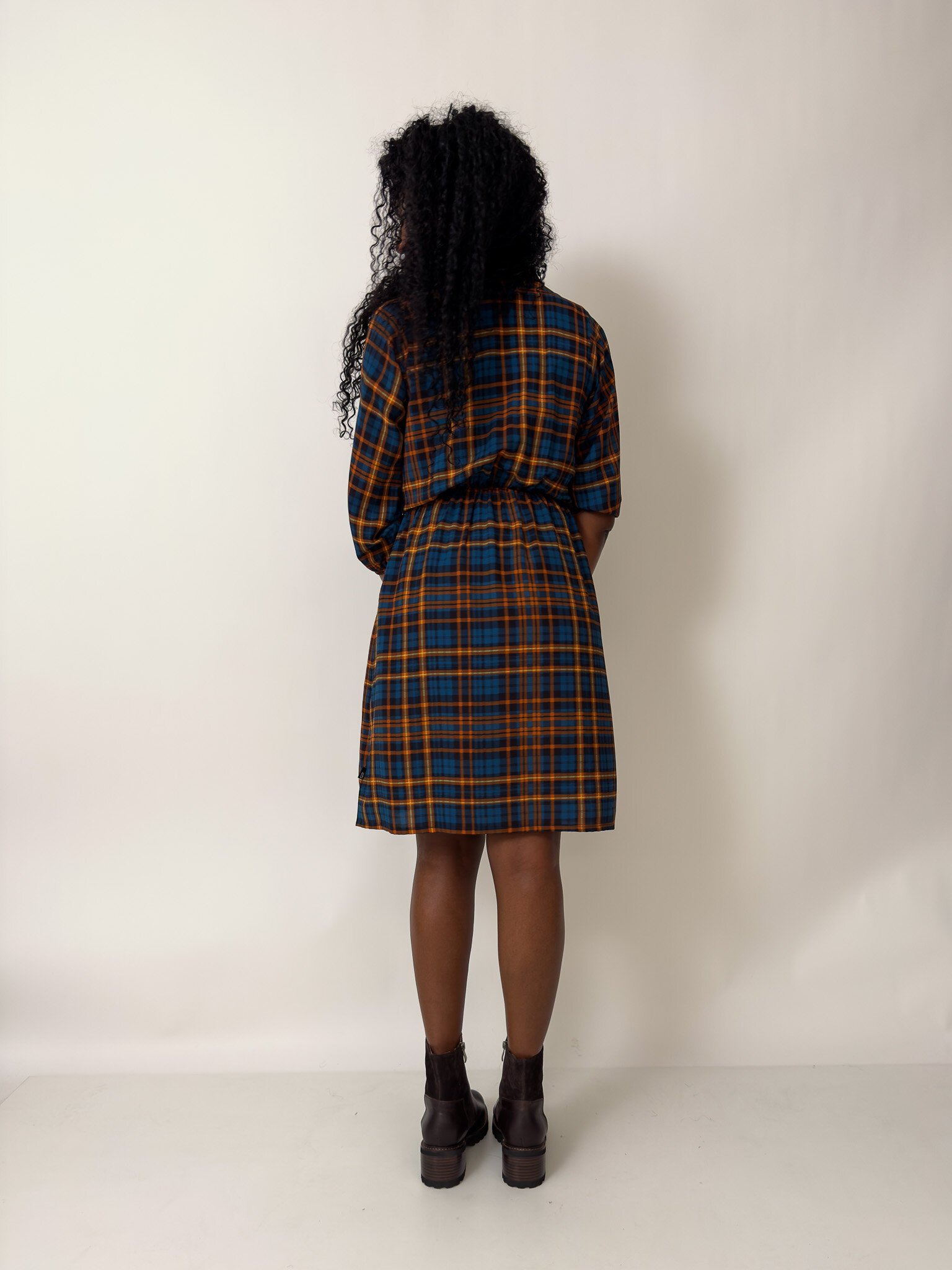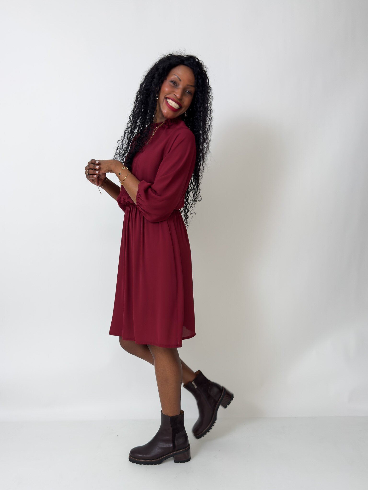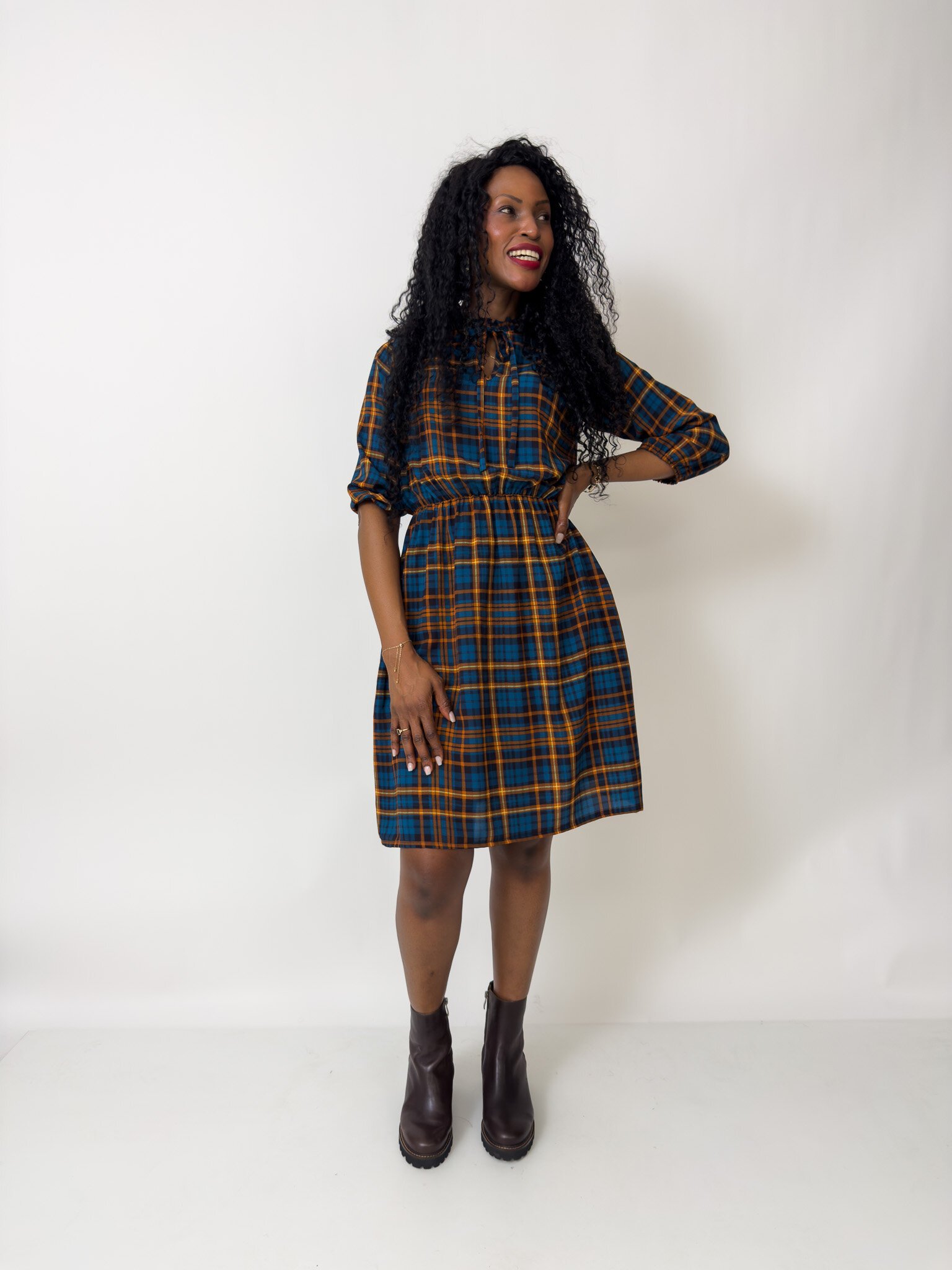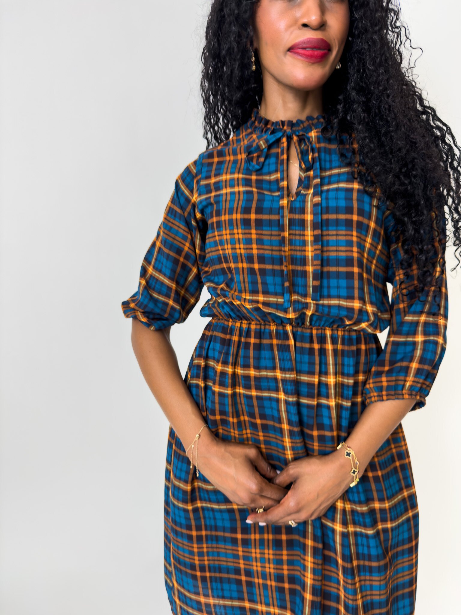 This dress features a gathered waist, 3/4 length elasticated sleeves, pockets and a ruffled neck with a tie.