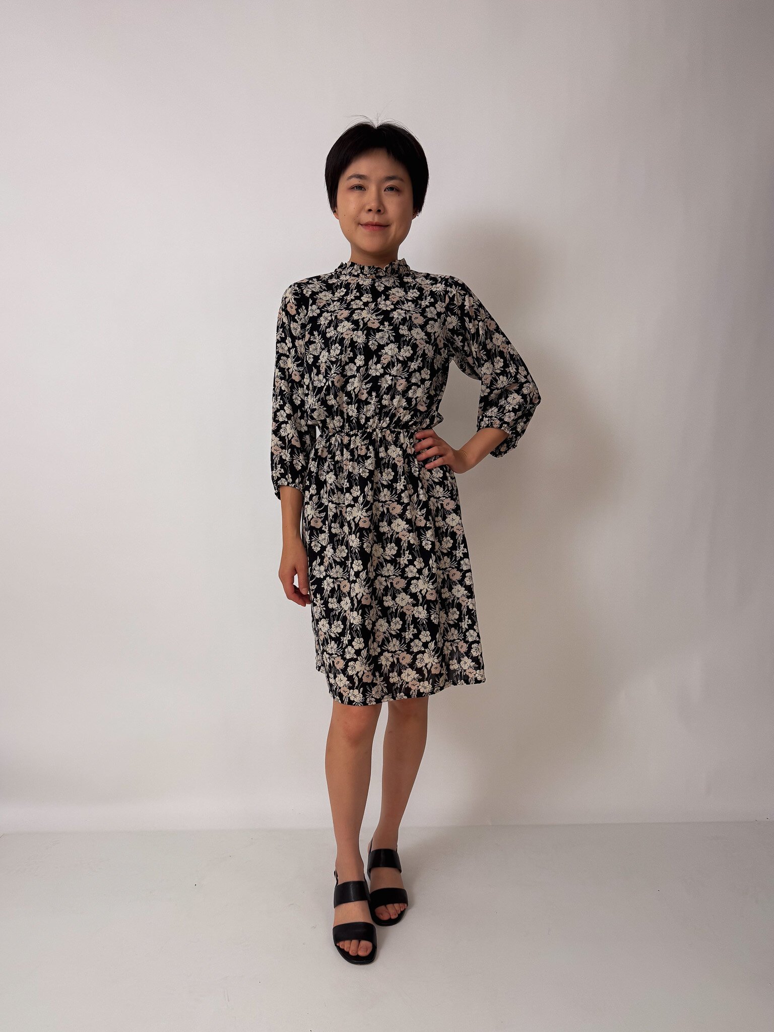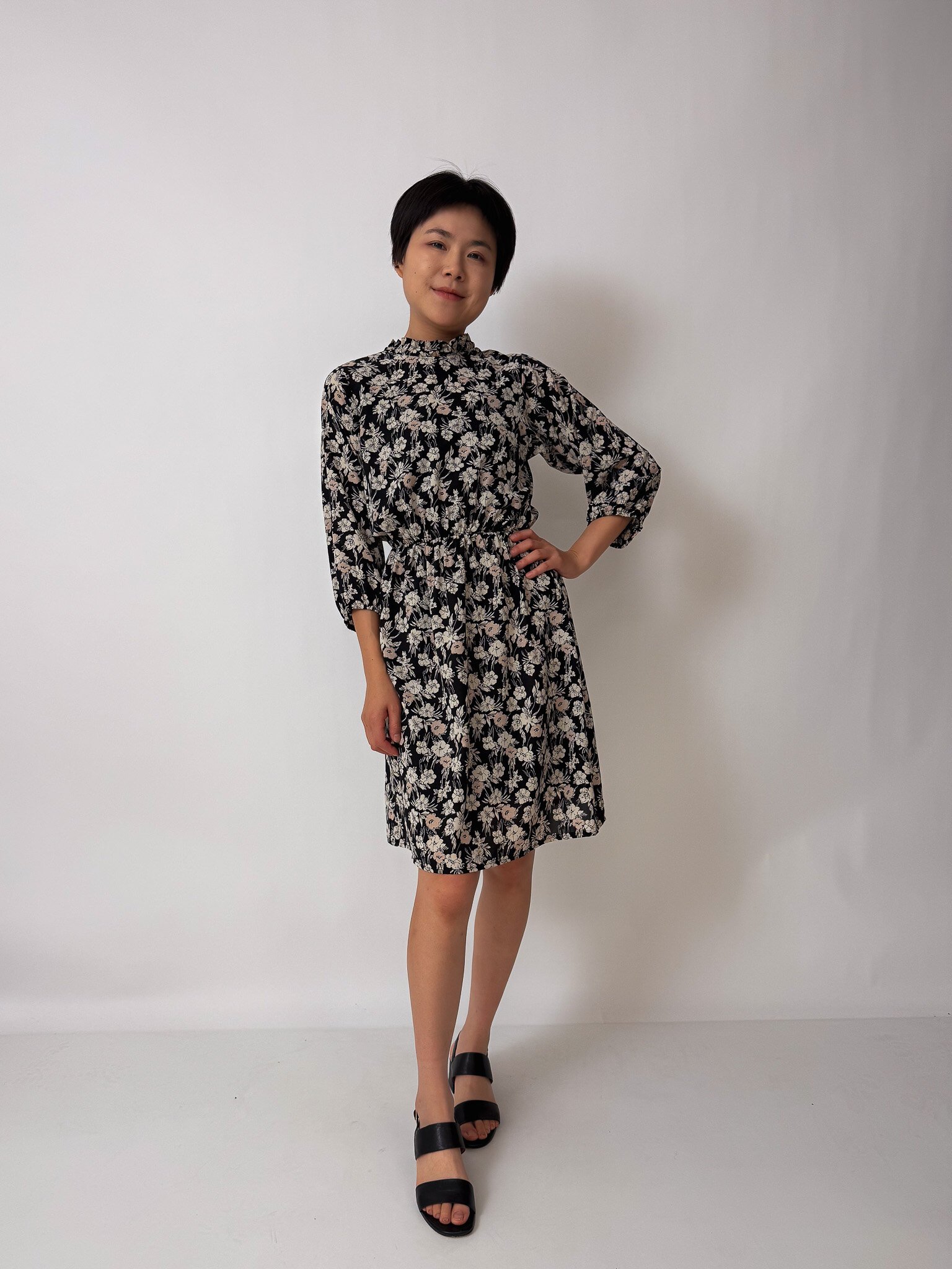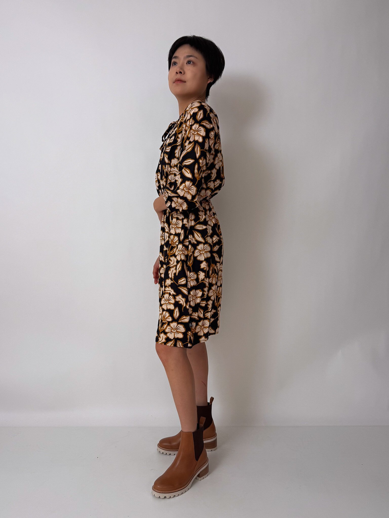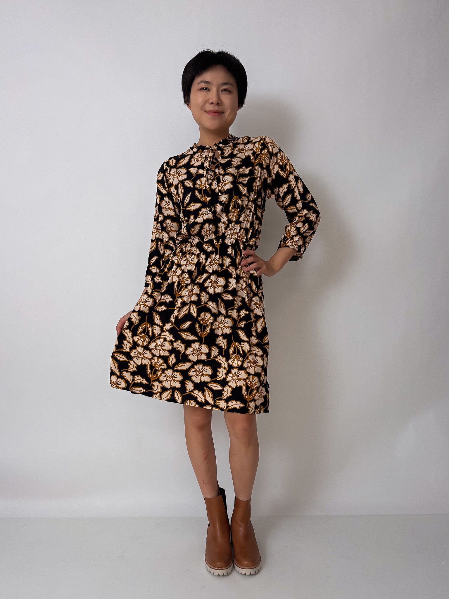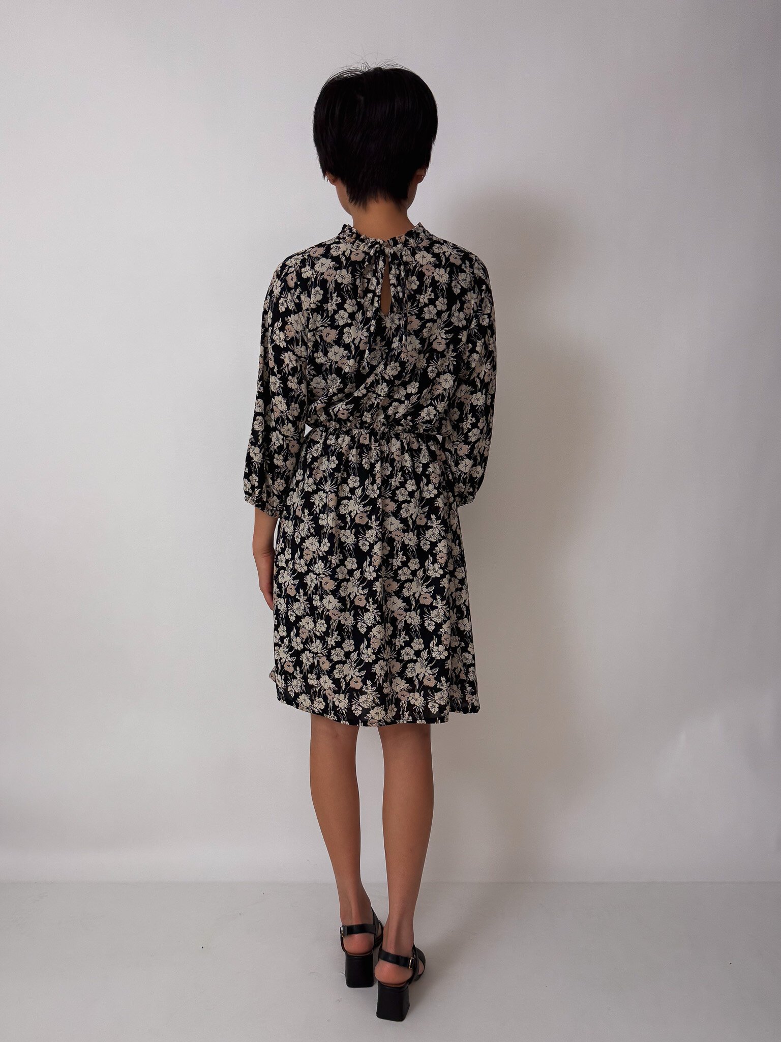 This dress features a gathered waist, 3/4 length elasticated sleeves, pockets and a ruffled neck with a tie.