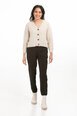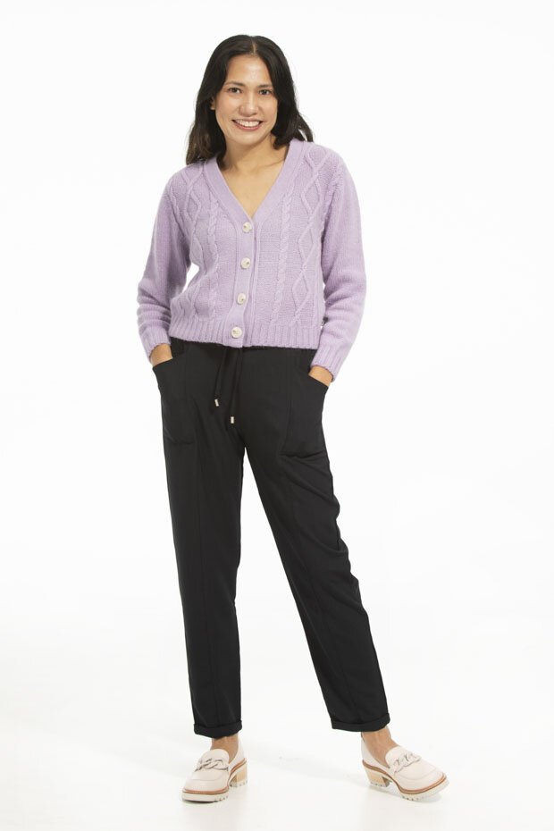 Our Alpaca Cardigan is a button-up and features a cable knit.