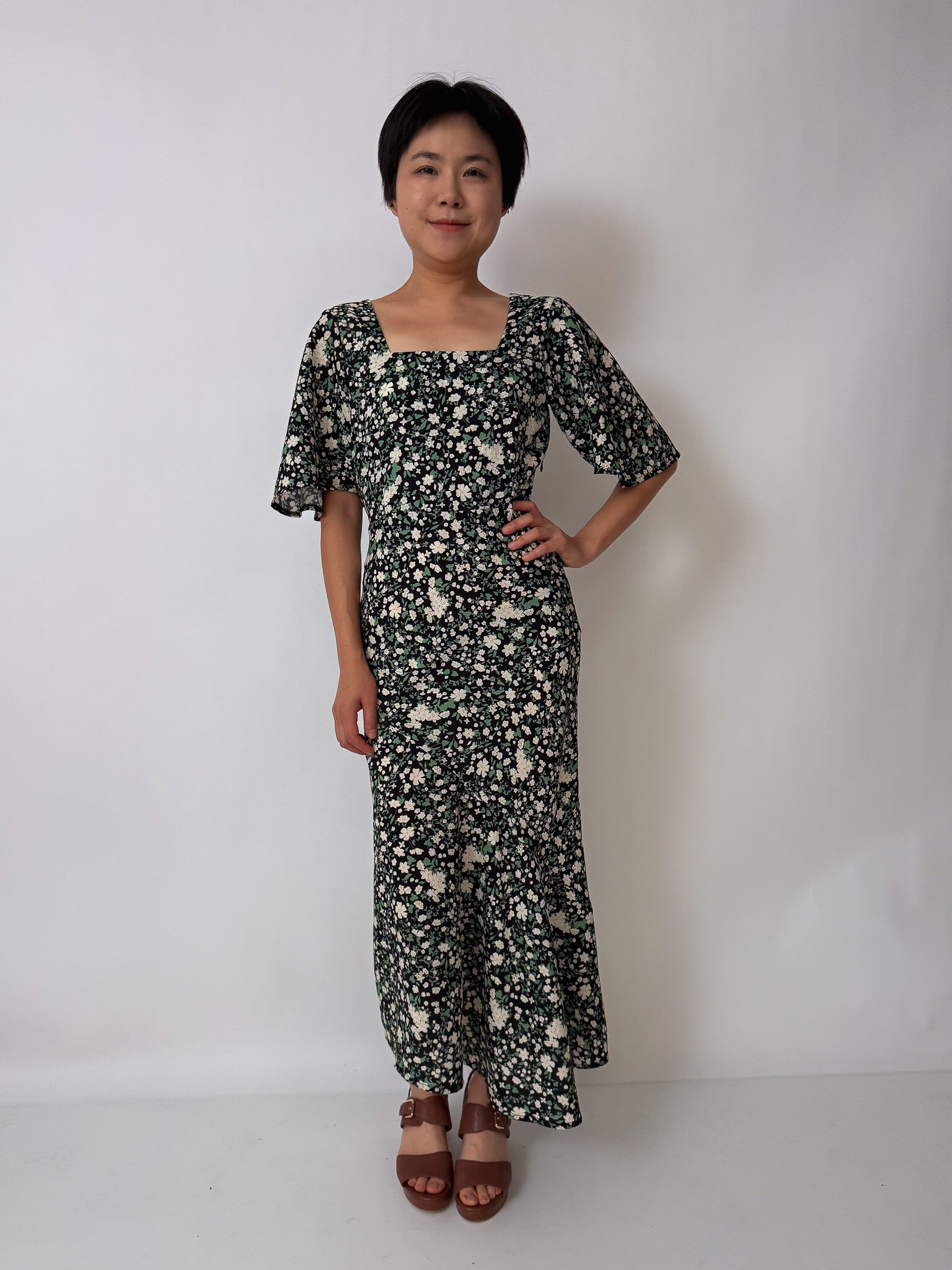 This midi-length dress features a bias frill skirt, petal sleeves, reversible square and round neck and an invisible zip.